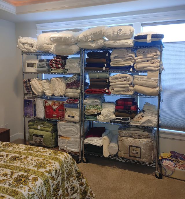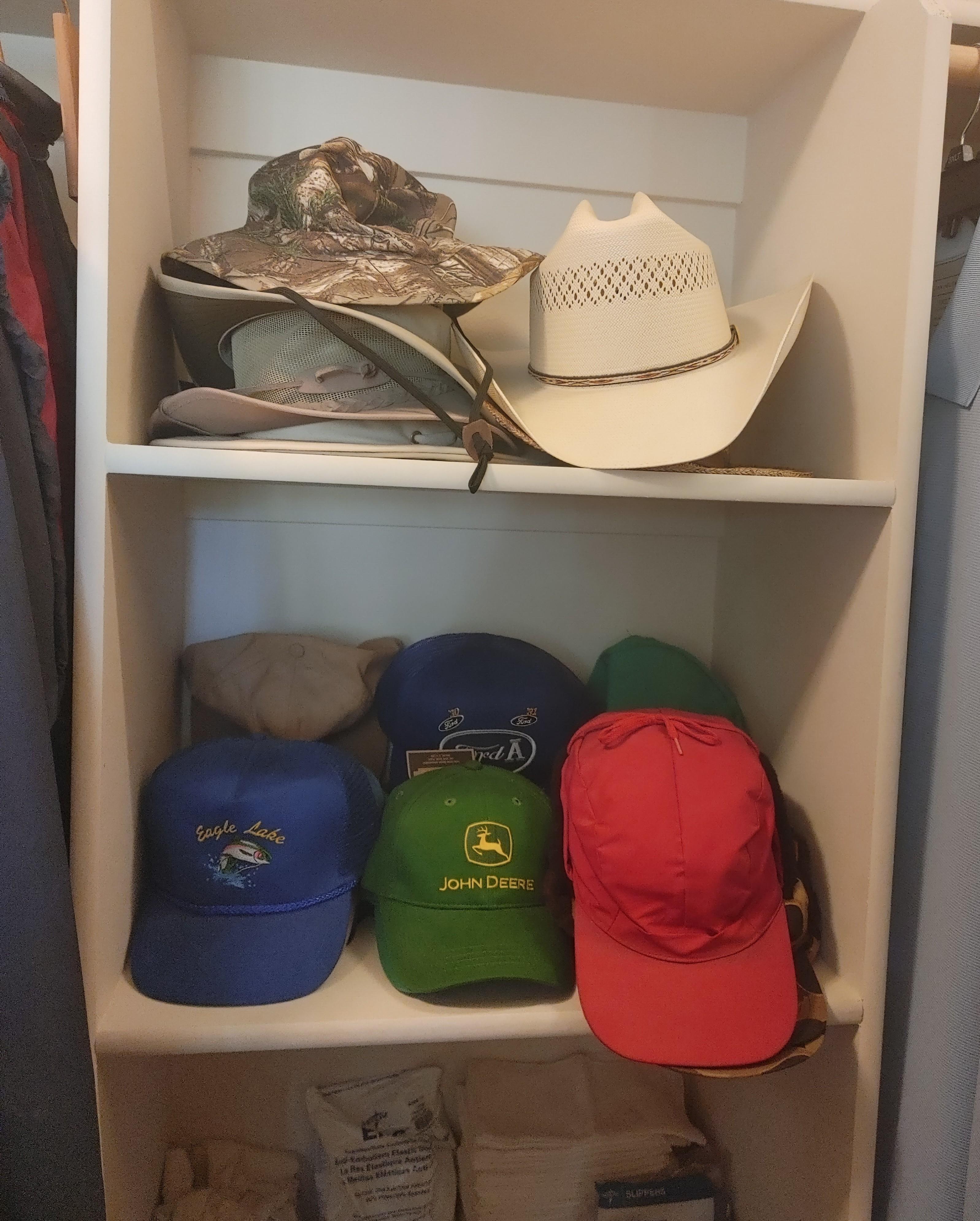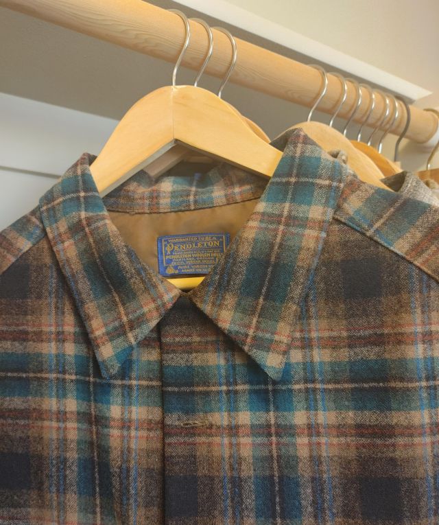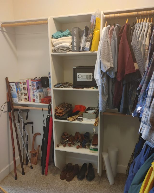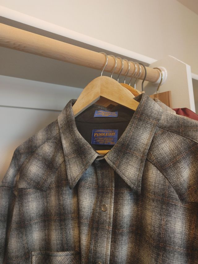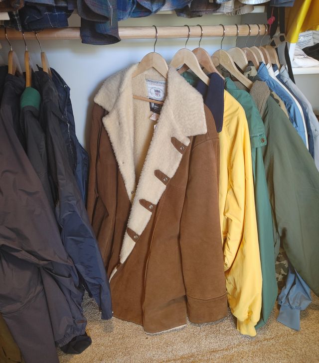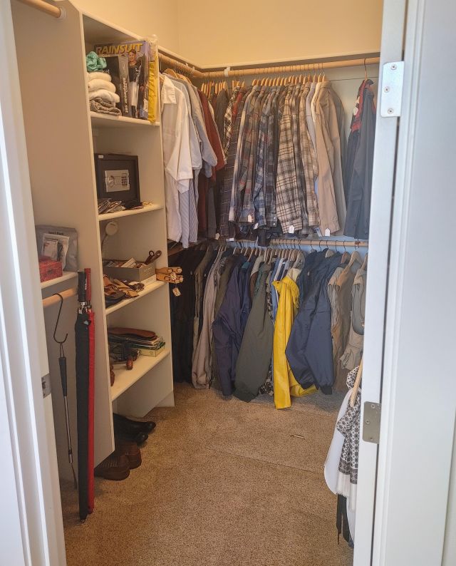 Primary closet: Men's big and tall clothing including a large collection of Pendleton wool shirts, shoes, luggage, and more.