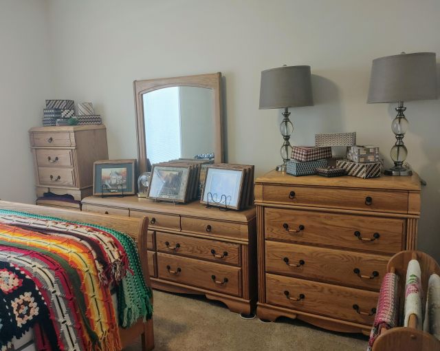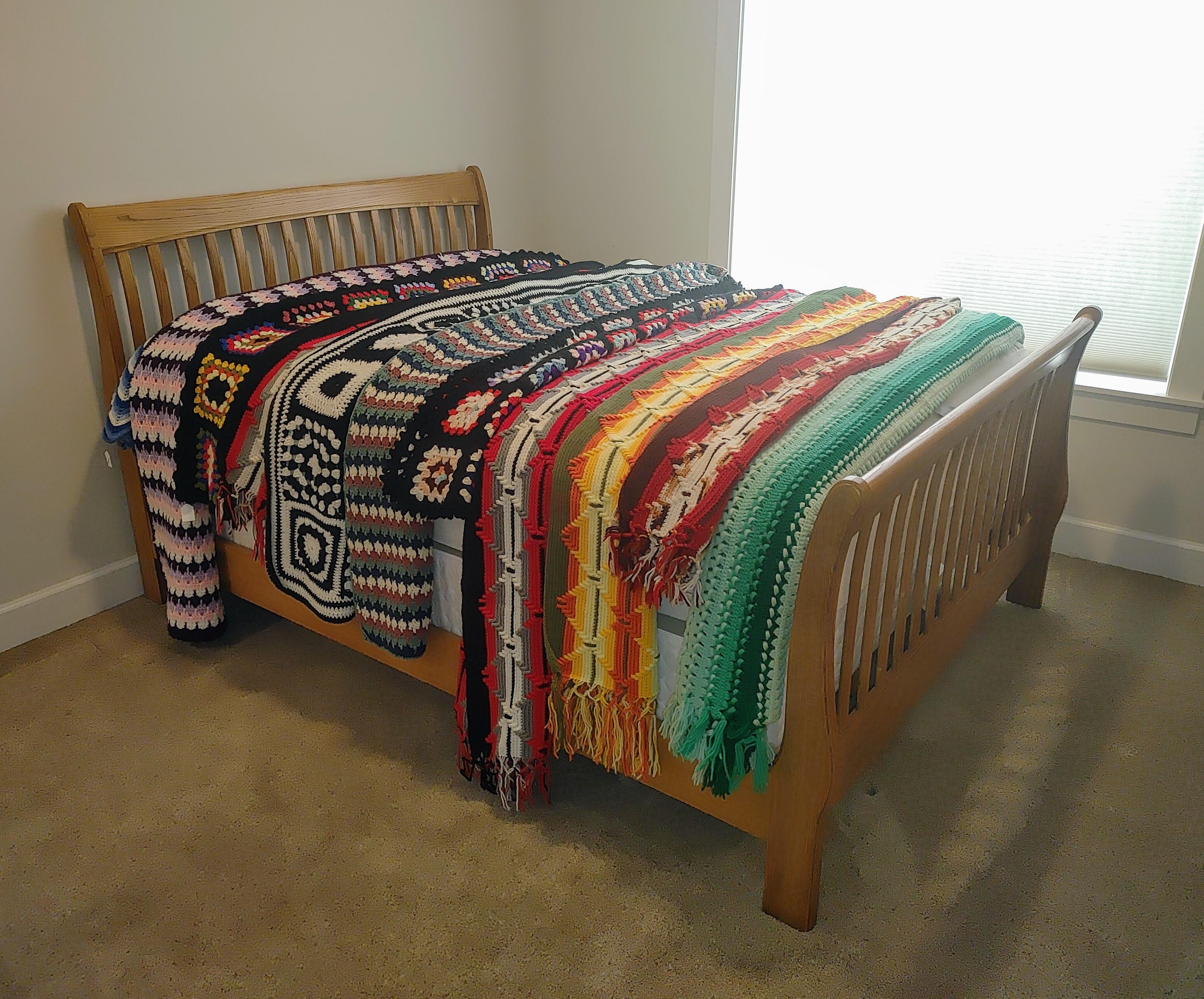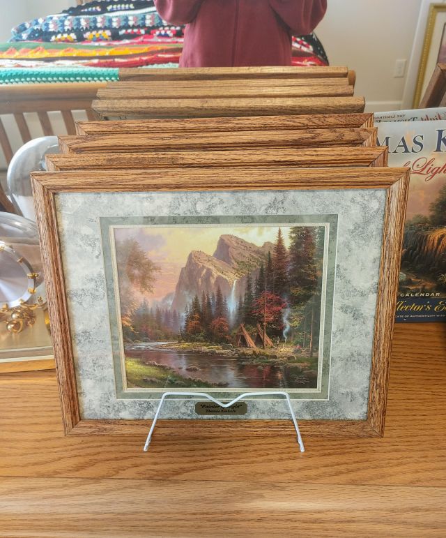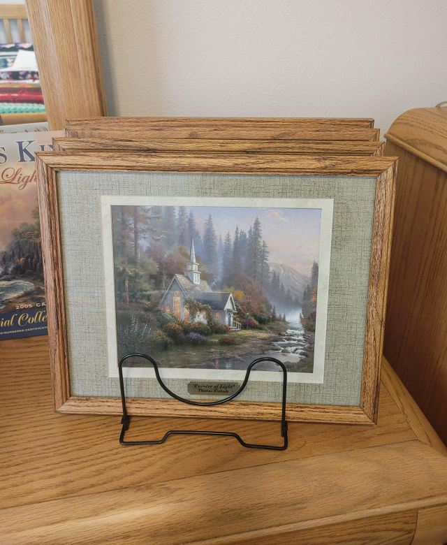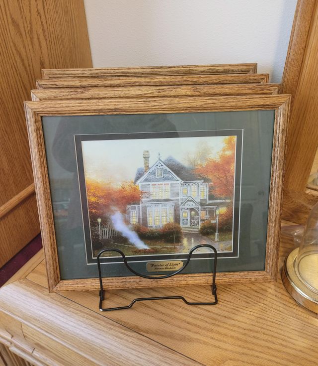 Bedroom 2: Very nice oak bedroom set, a large collection of afghans in all sizes, a collection of Thomas Kinkade pictures, a Viking Sweden Model 5430 sewing machine, and 2 sets of card tables and chairs.