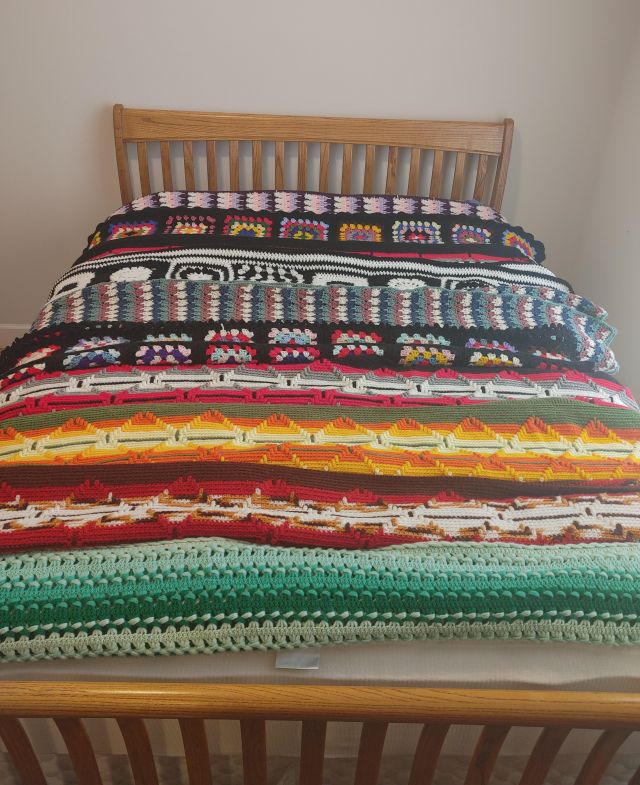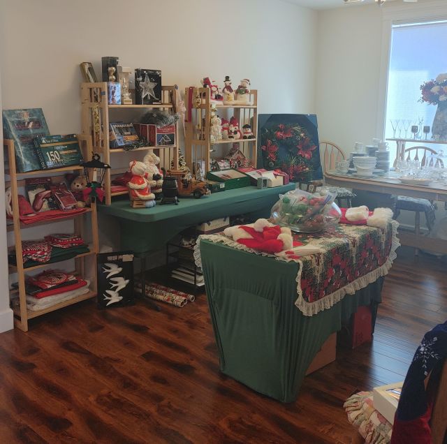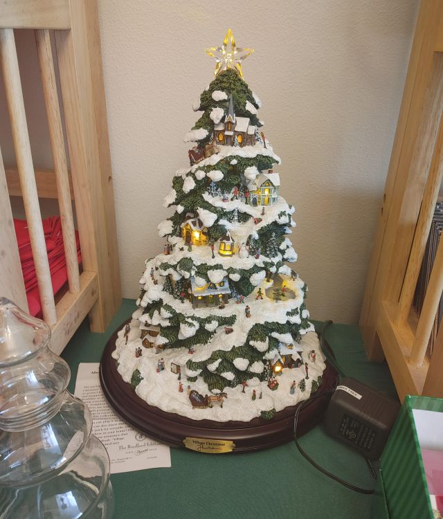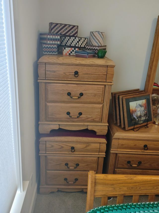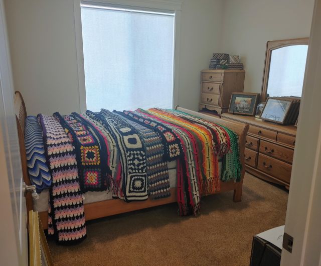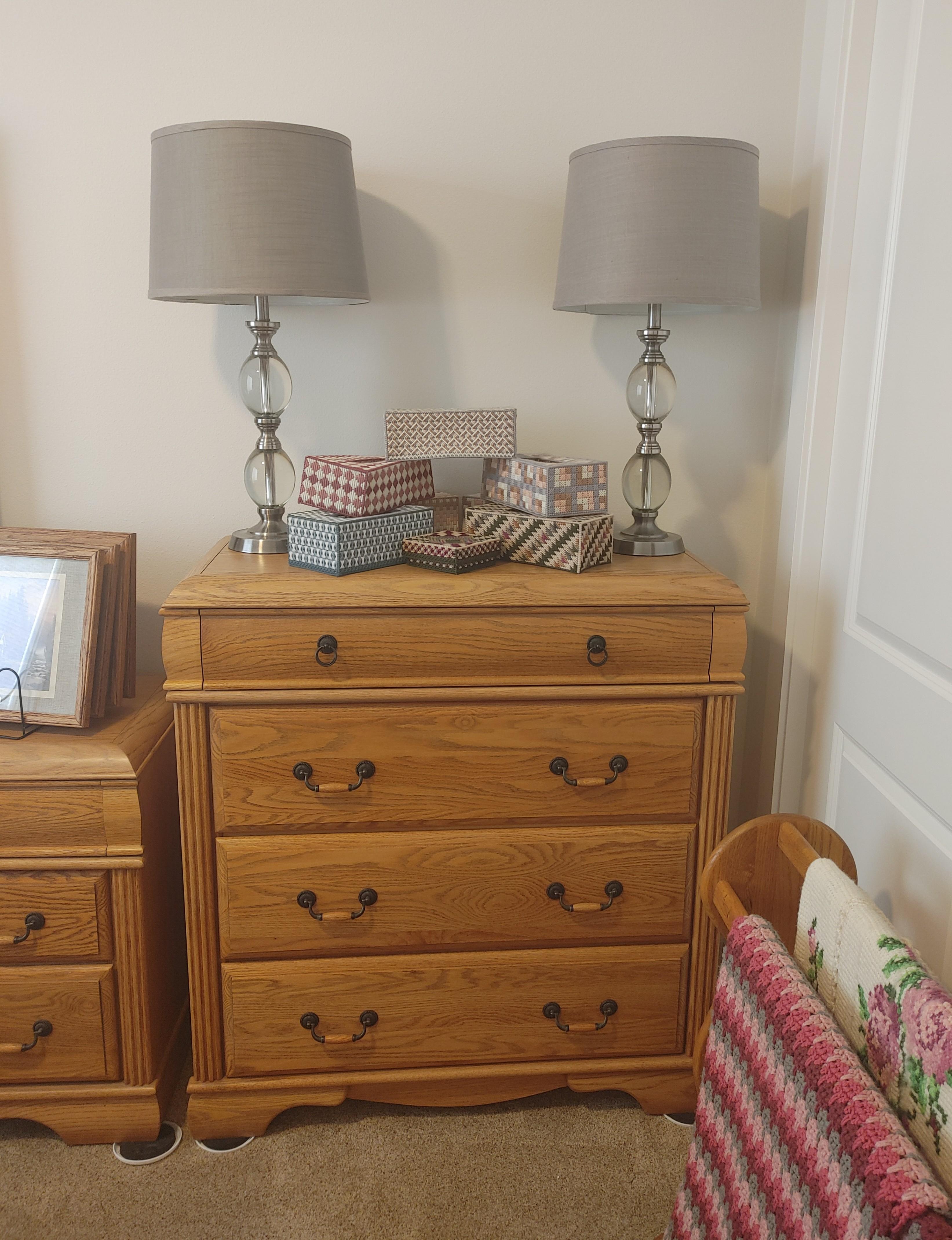 Bedroom 2: Very nice oak bedroom set, a large collection of afghans in all sizes, a collection of Thomas Kinkade pictures, a Viking Sweden Model 5430 sewing machine, and 2 sets of card tables and chairs.