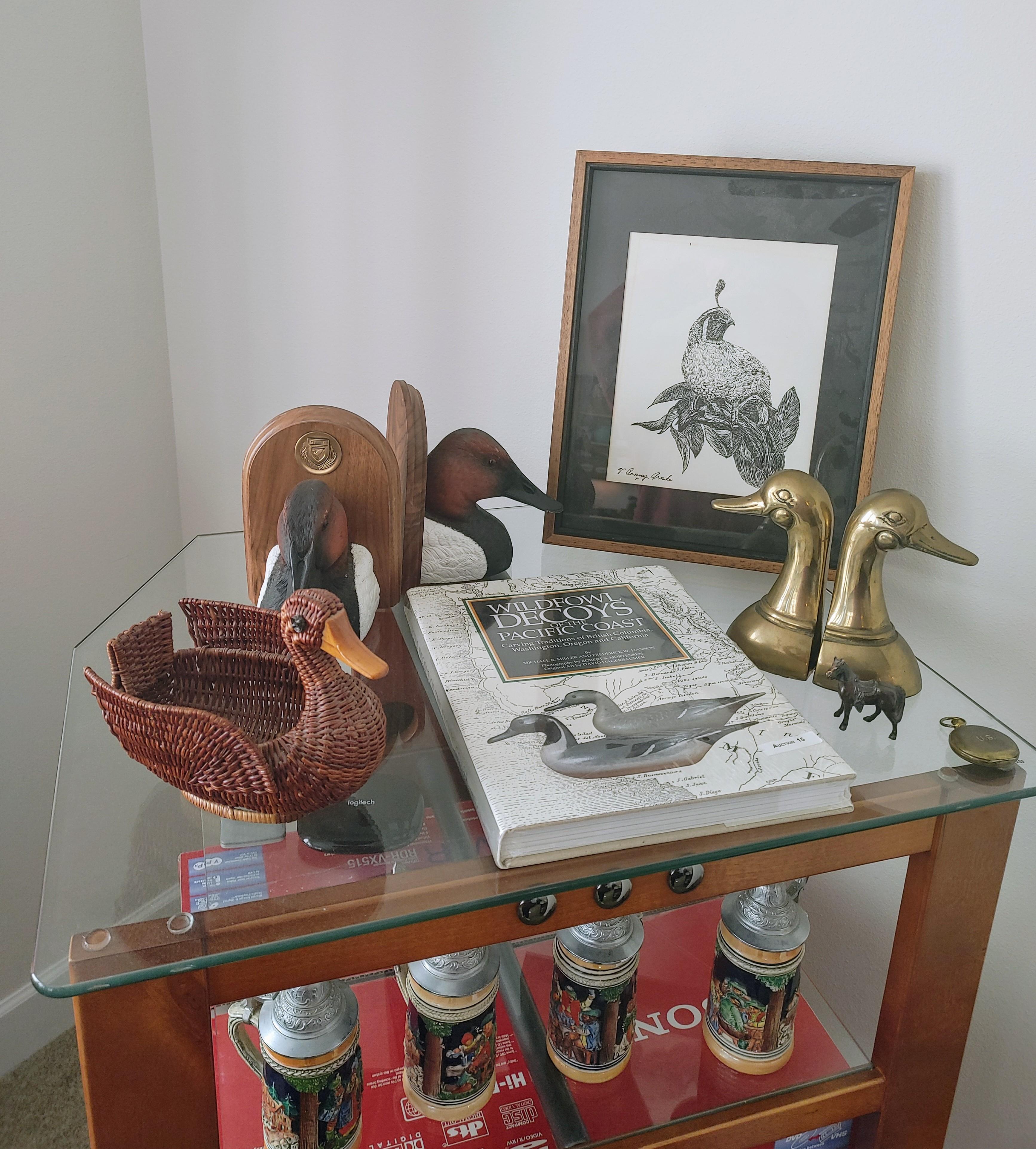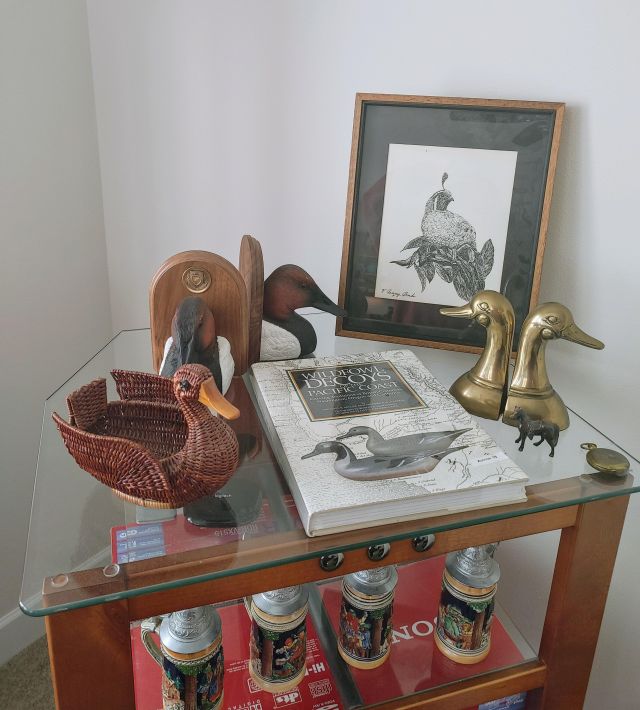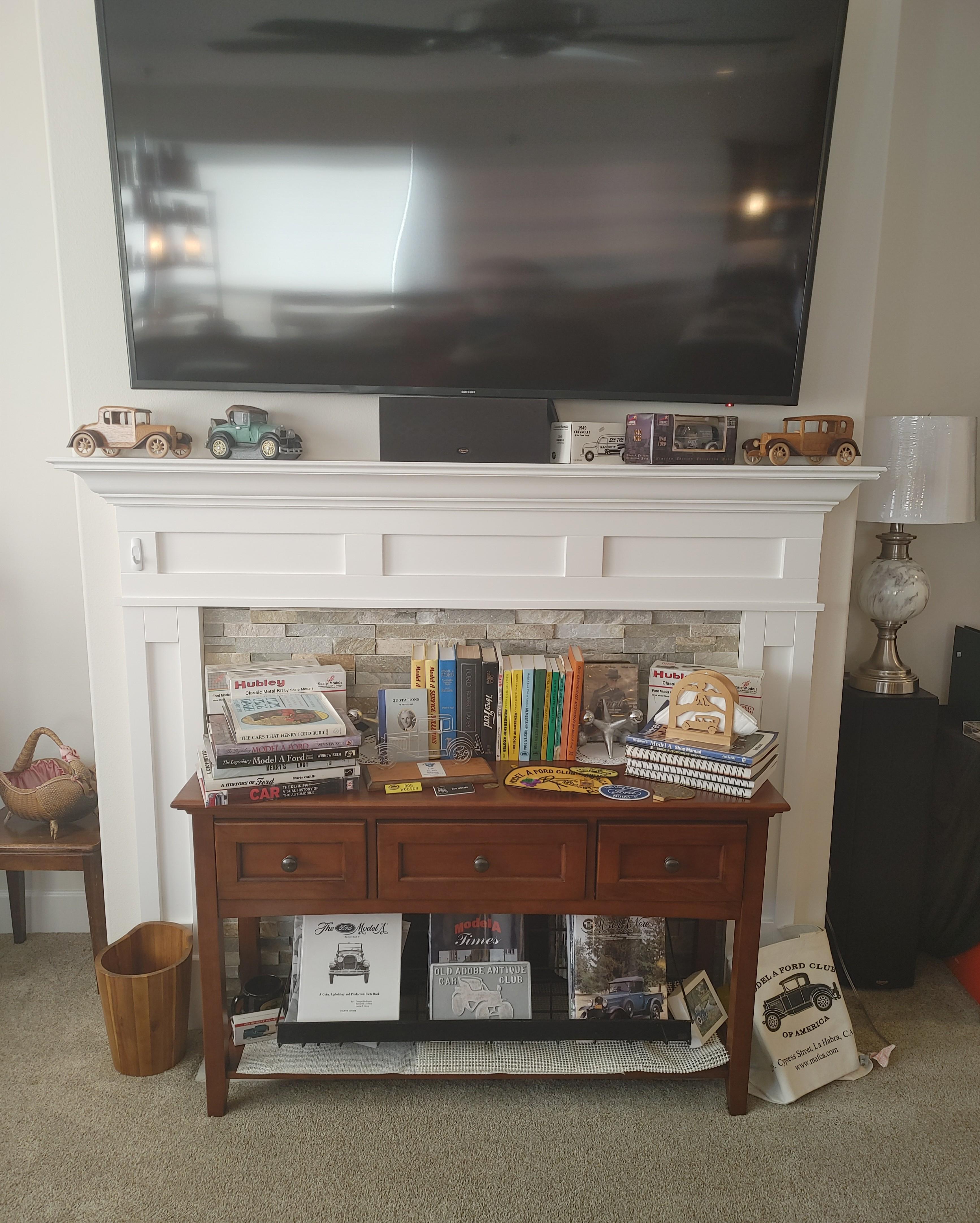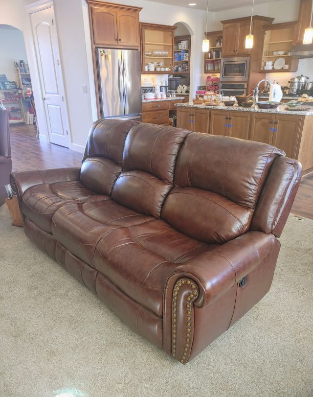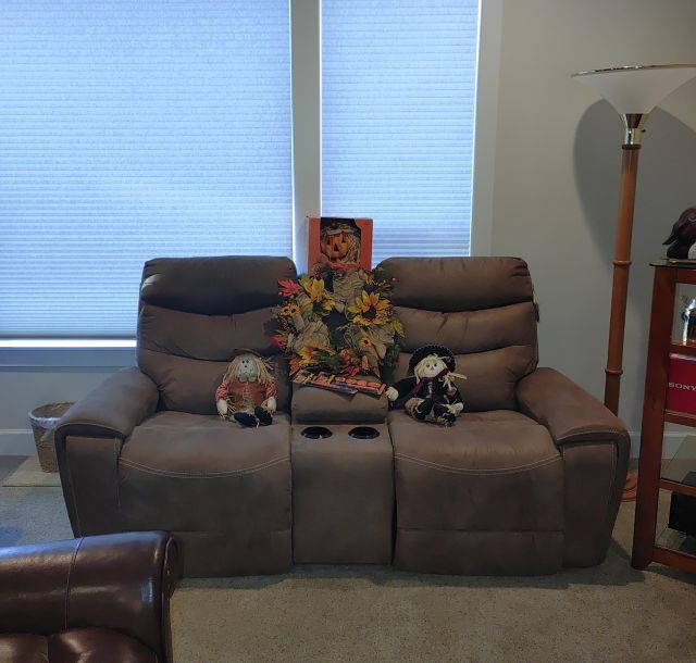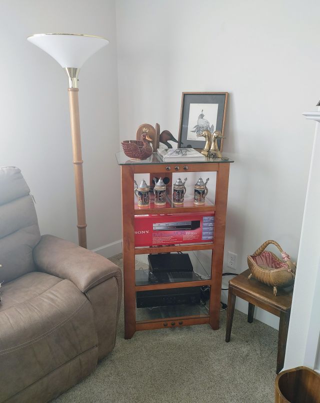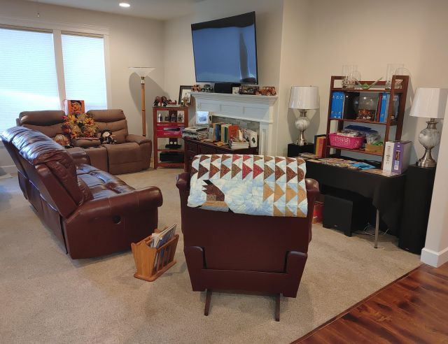 Living room: Leather power reclining sofa, and recliner, stamp collection, duck collection, Yamaha RX-V479 receiver, Klipsch speakers, and Model A collectibles.
