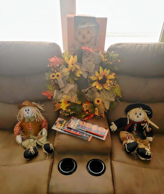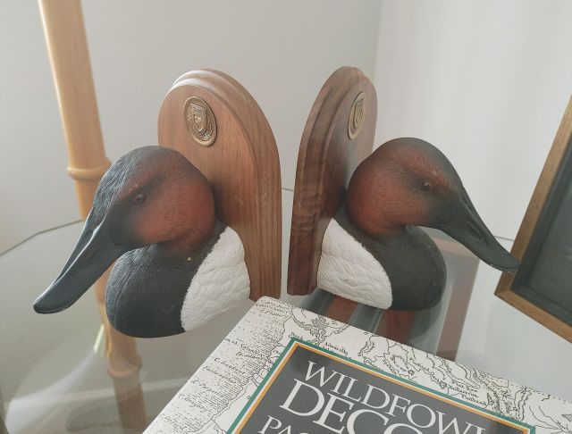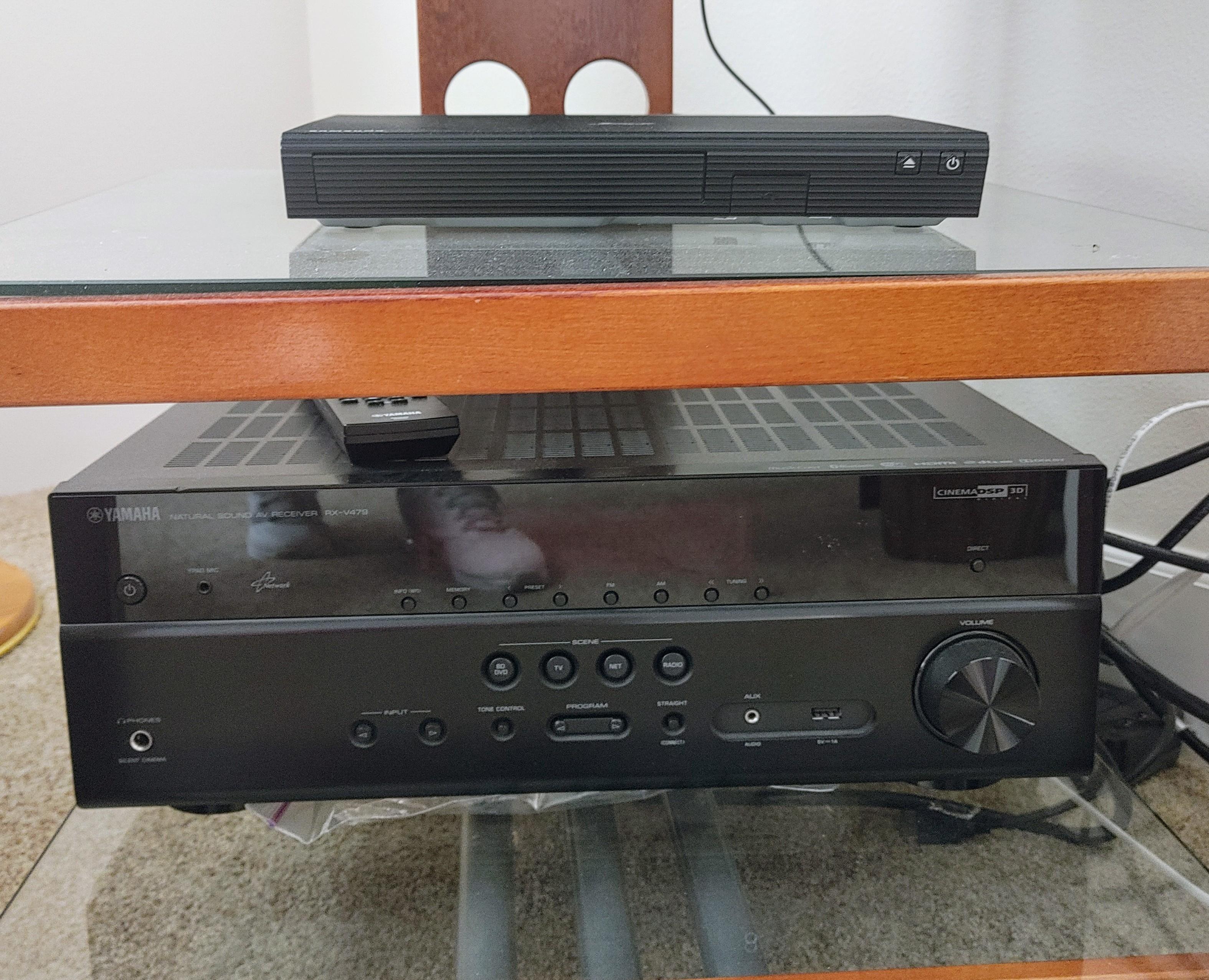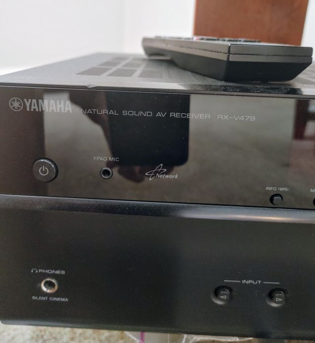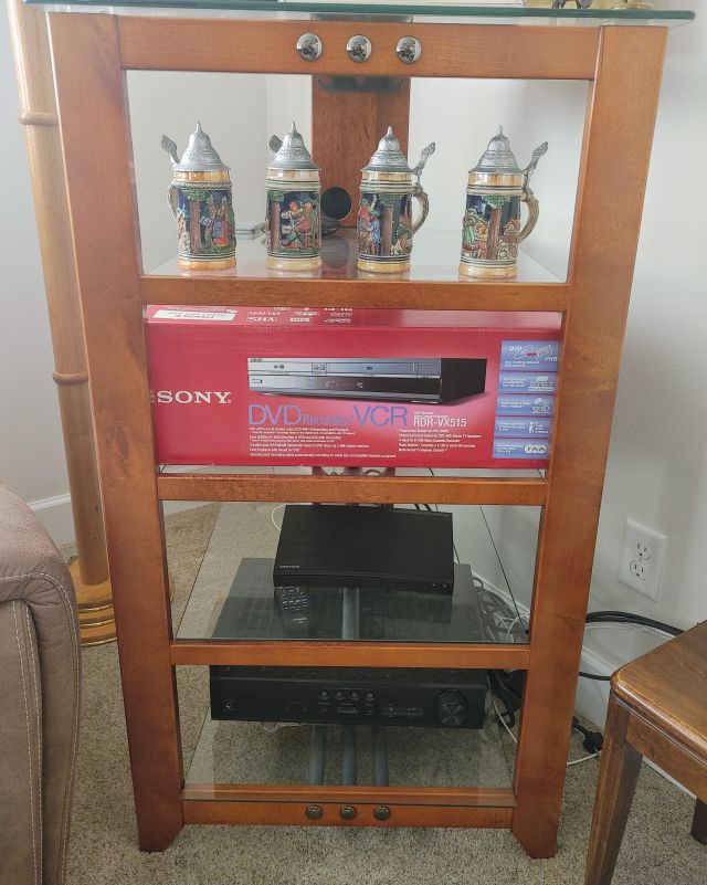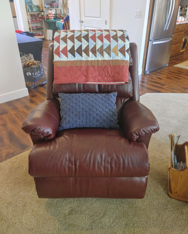Living room: Leather power reclining sofa, and recliner, stamp collection, duck collection, Yamaha RX-V479 receiver, Klipsch speakers, and Model A collectibles.