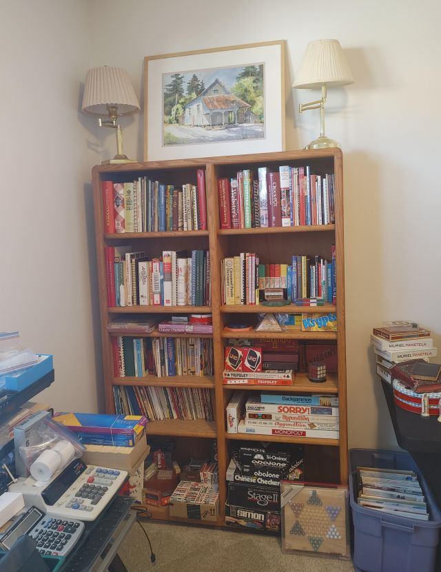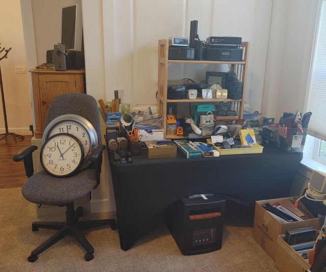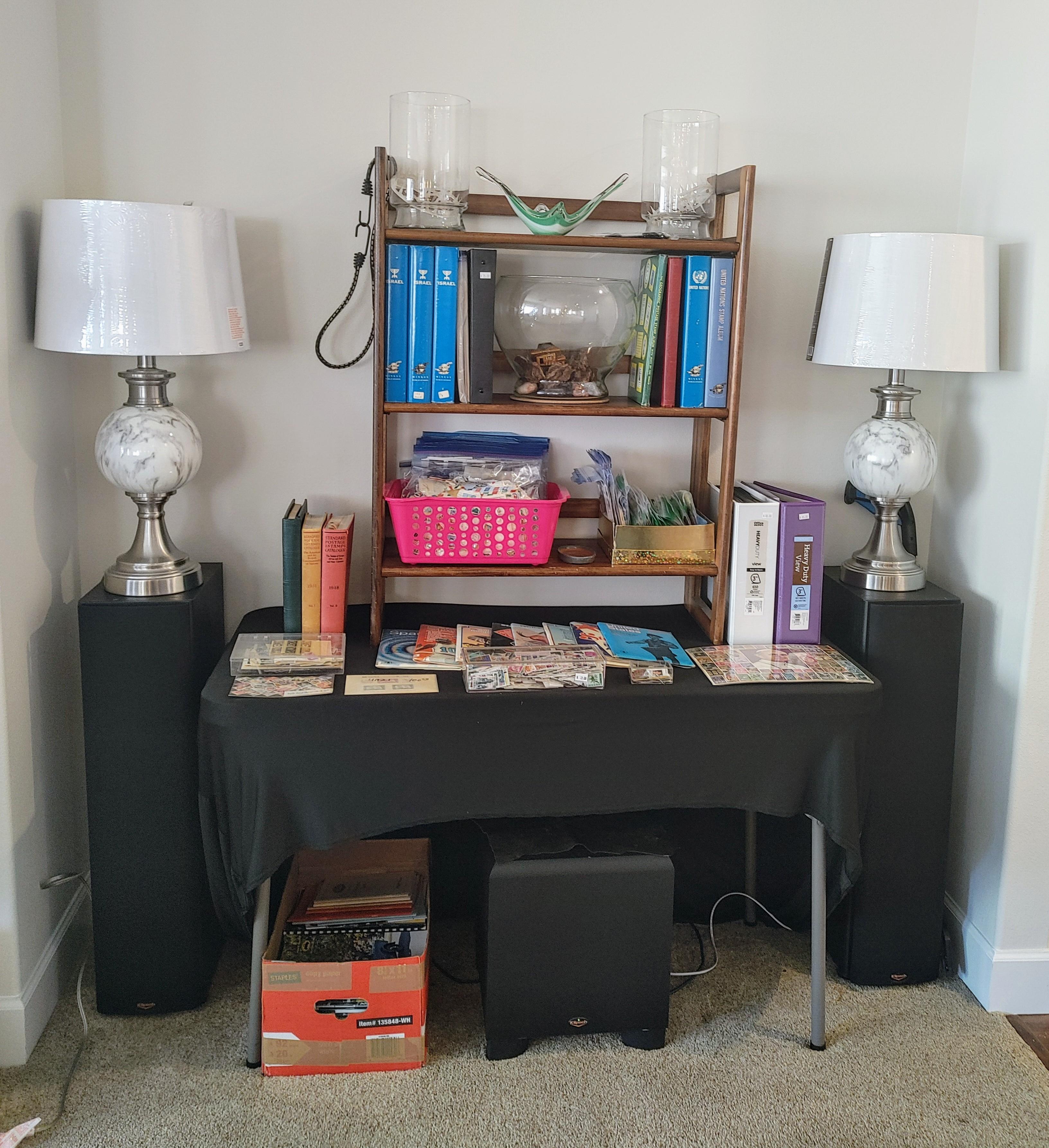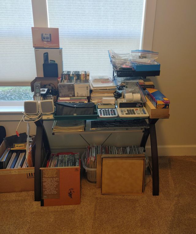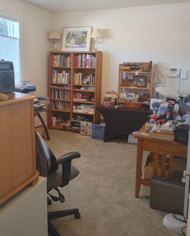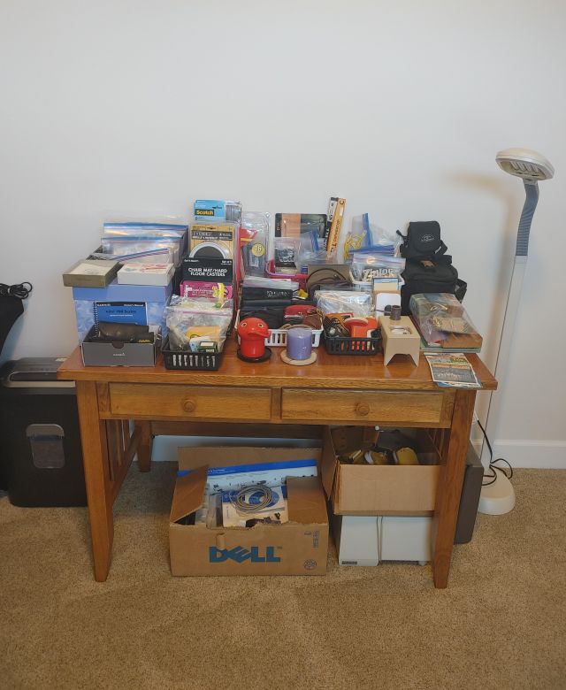 Office: Packed with office supplies with vintage treasures mixed in, plus books.