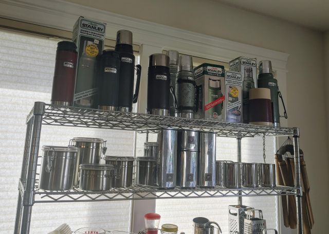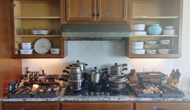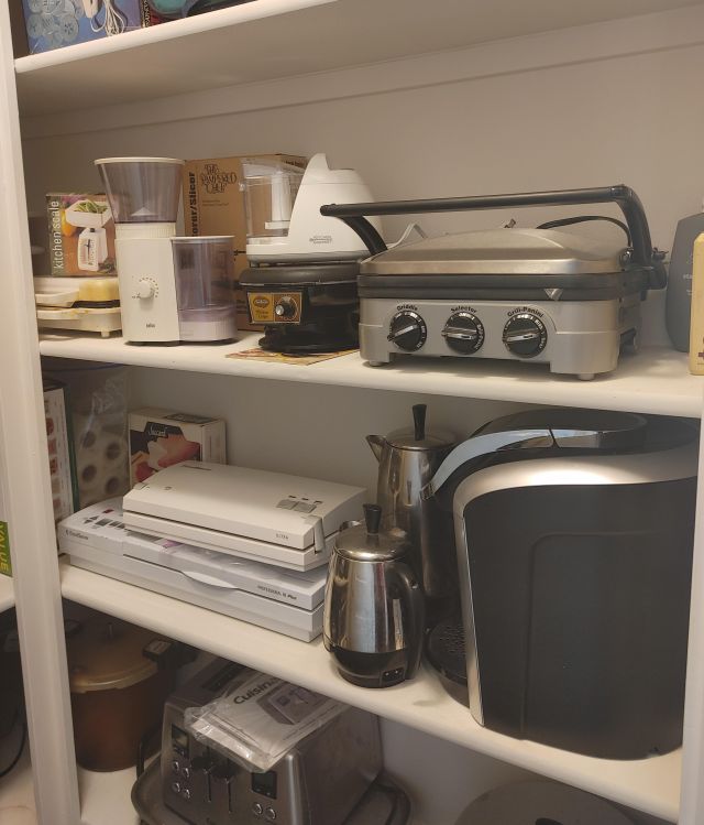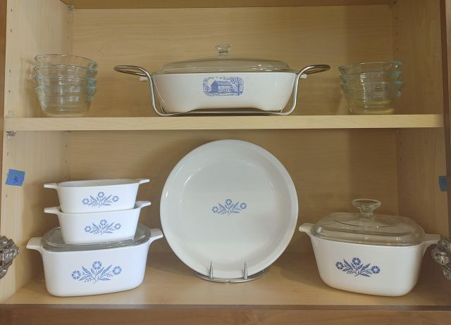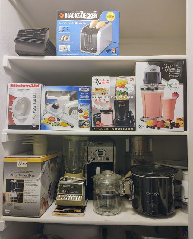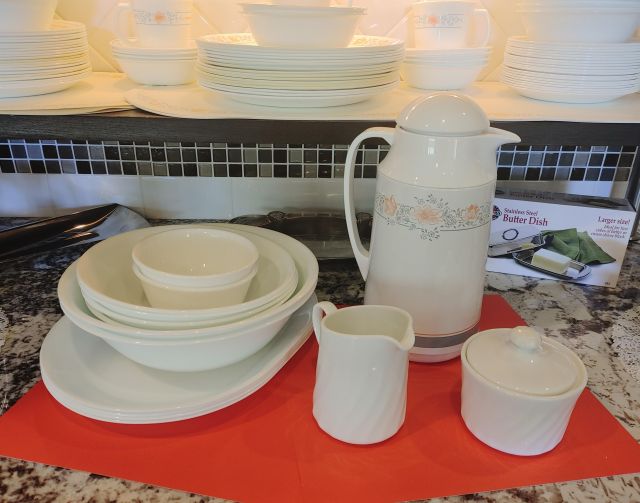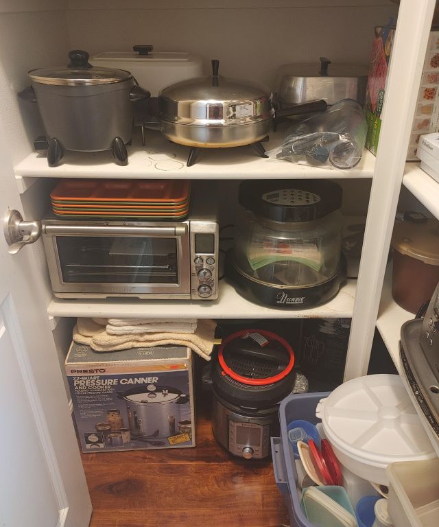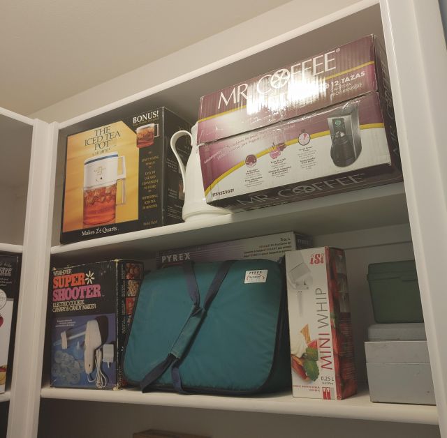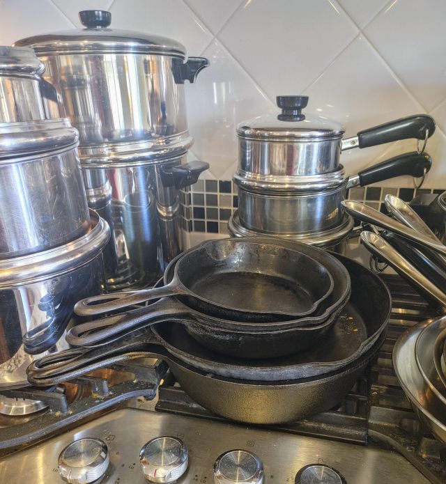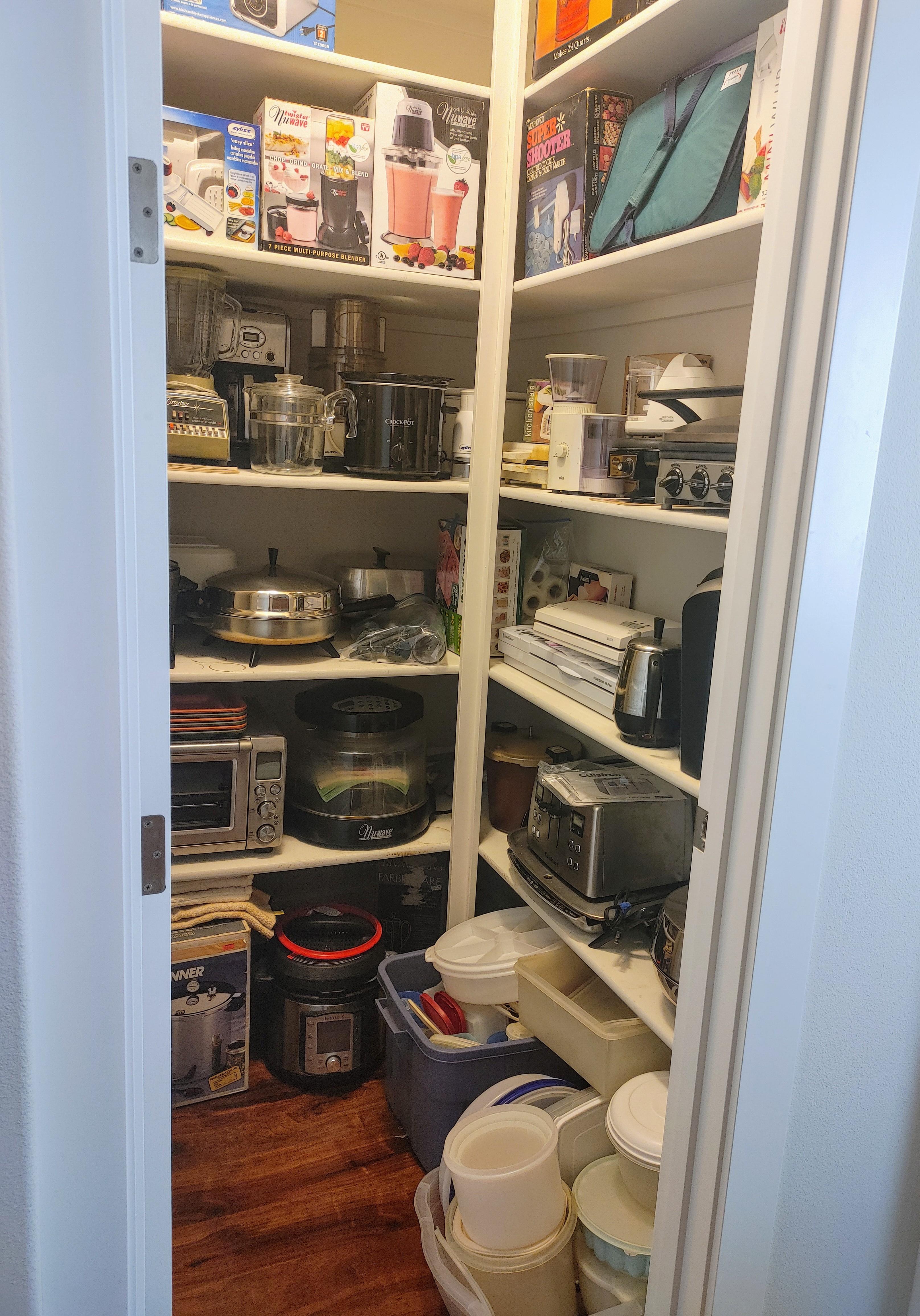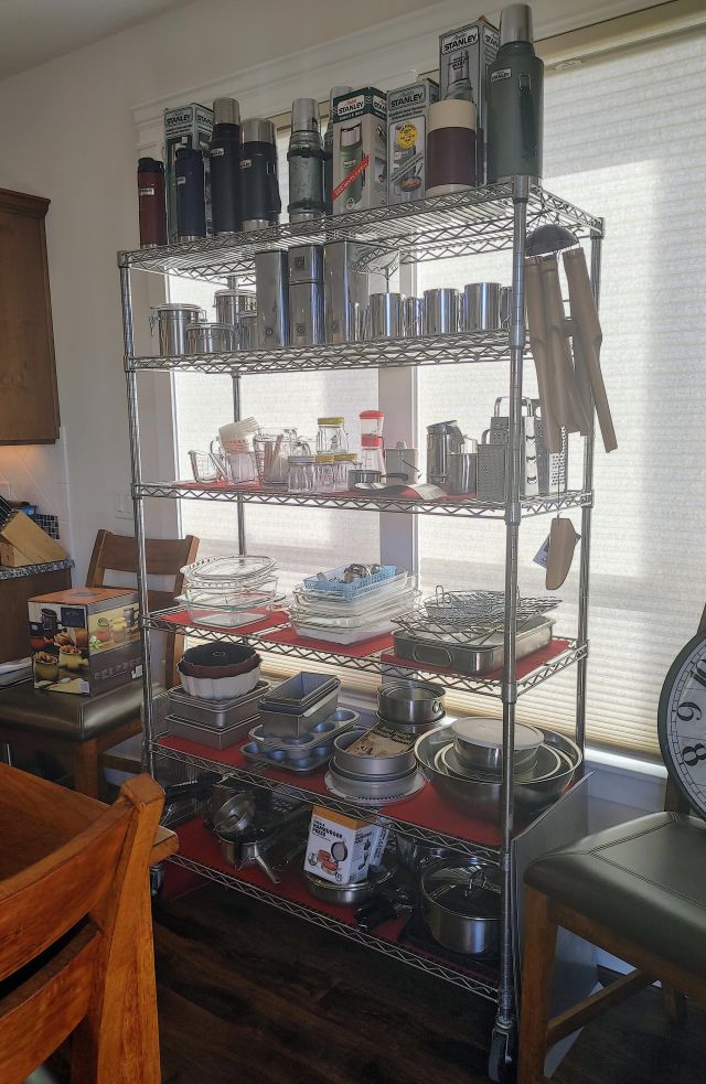 Kitchen: Lots of everyday basics, modern and vintage dishware, large collection of Stanley thermoses, large collection of J.A. Henckels knifes, pots and pans in every size, plus several cast iron pans in various sizes. We converted the pantry into a small appliance closet, includes a KitchenAid mixer, Food Saver, and many more modern and vintage appliances.