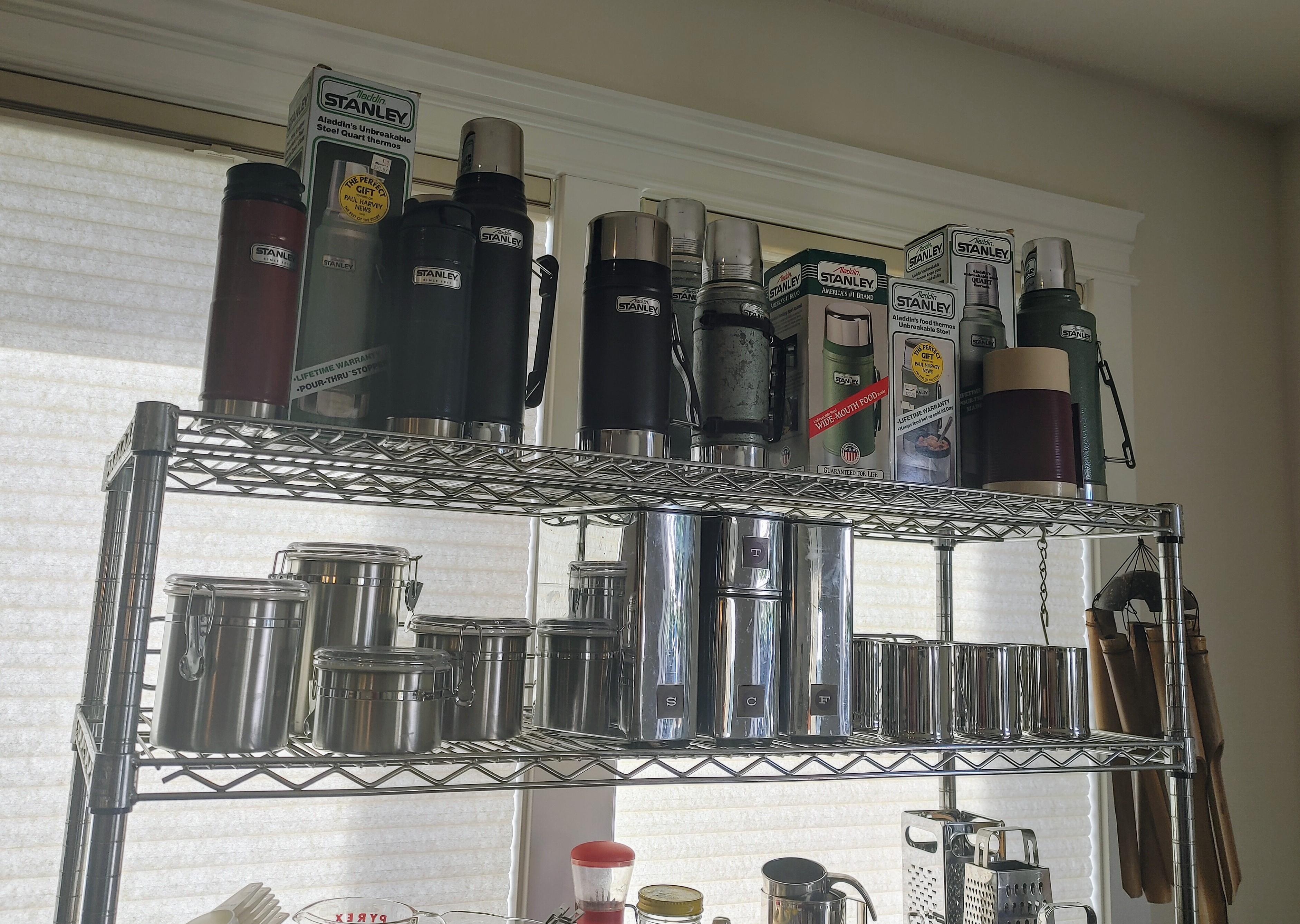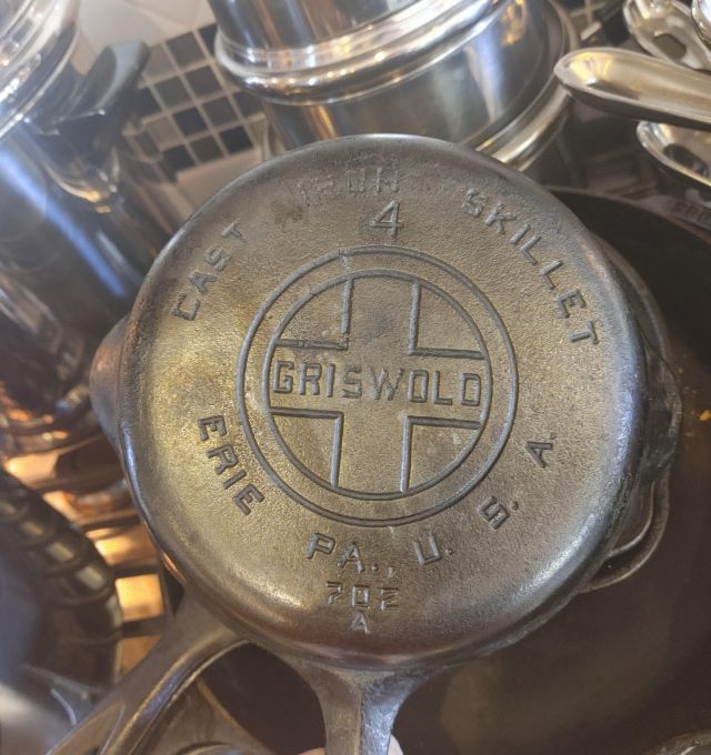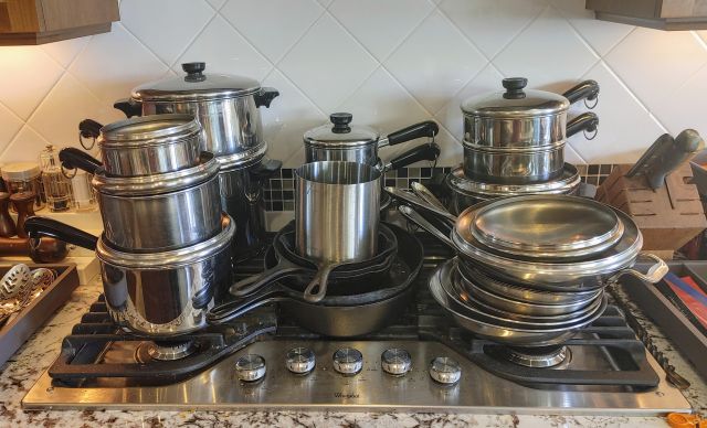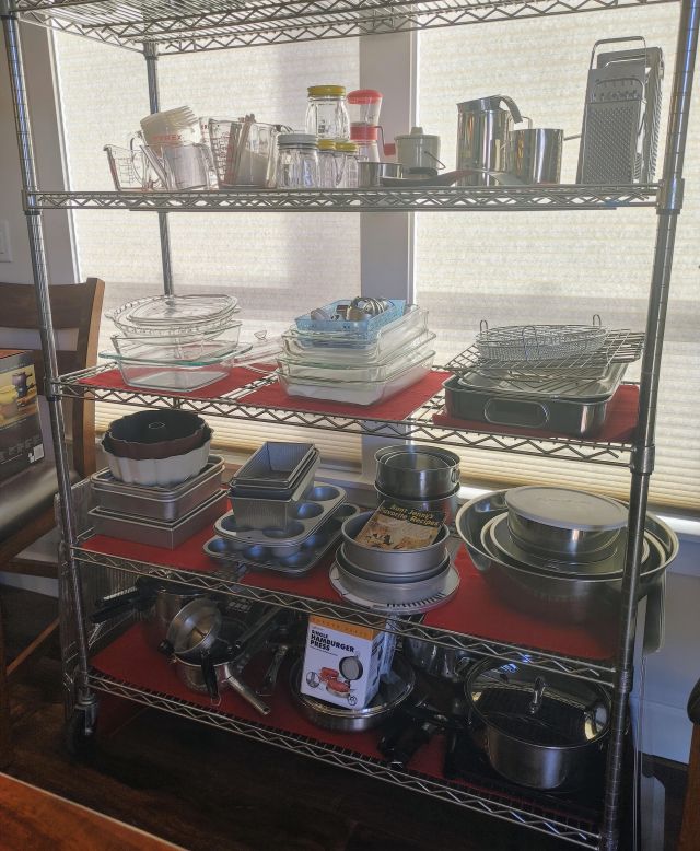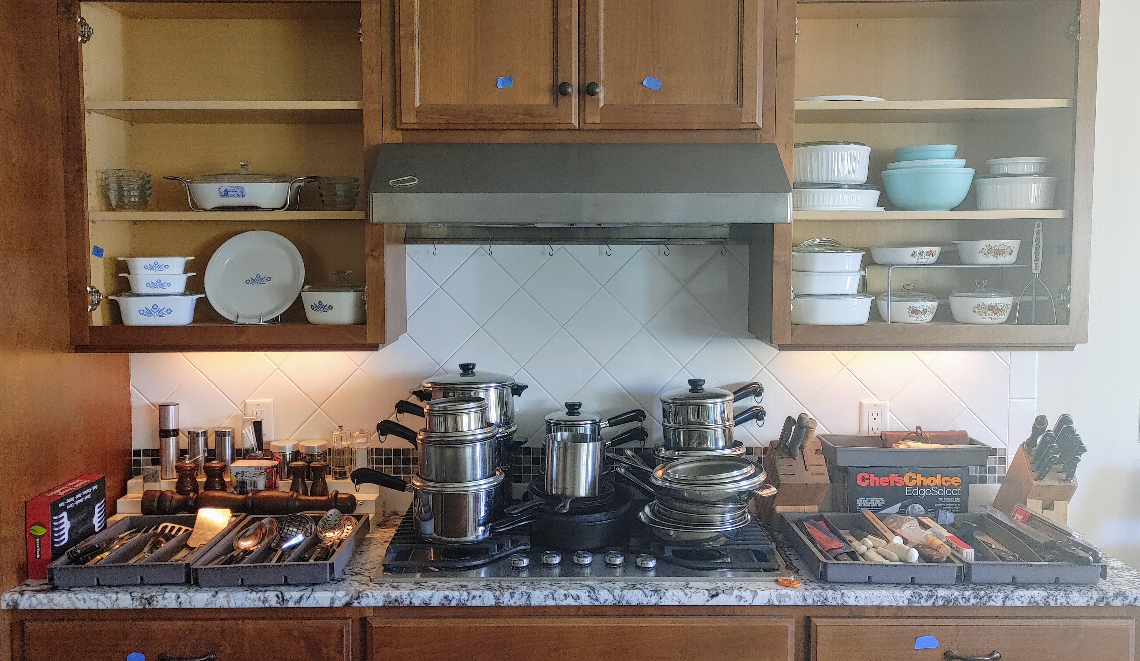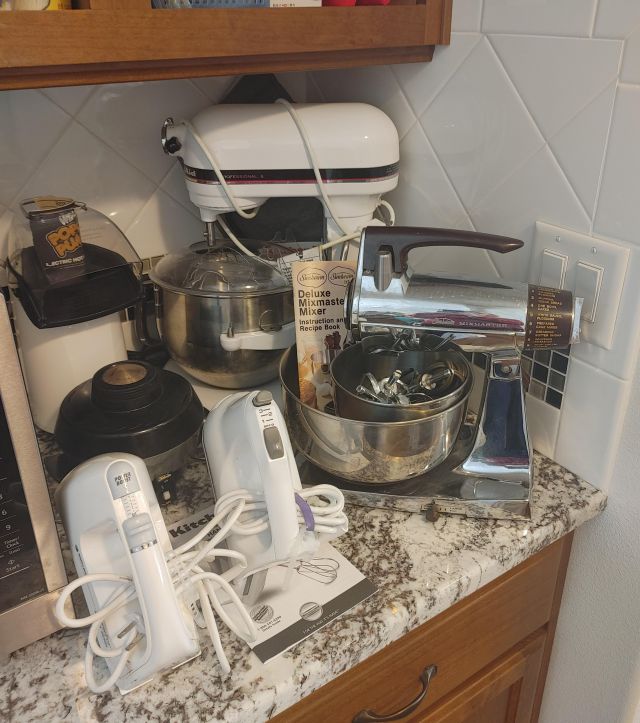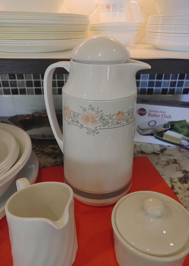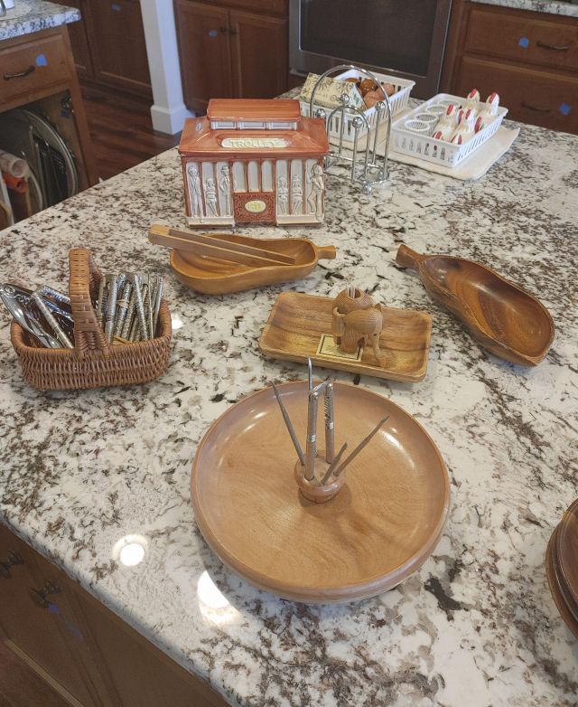 Kitchen: Lots of everyday basics, modern and vintage dishware, large collection of Stanley thermoses, large collection of J.A. Henckels knifes, pots and pans in every size, plus several cast iron pans in various sizes. We converted the pantry into a small appliance closet, includes a KitchenAid mixer, Food Saver, and many more modern and vintage appliances.