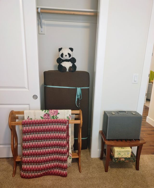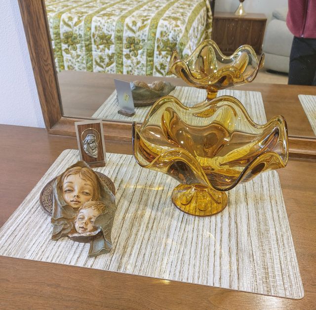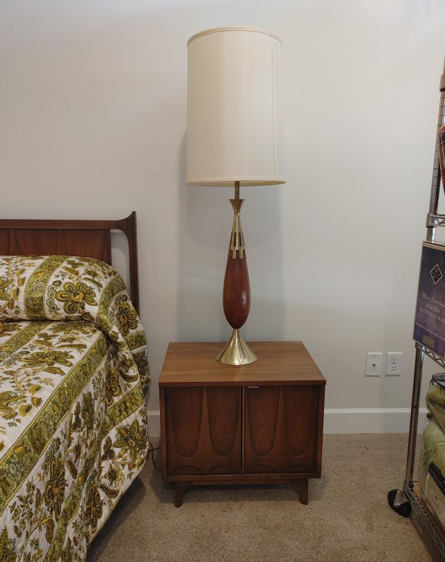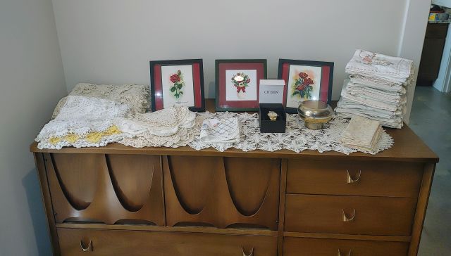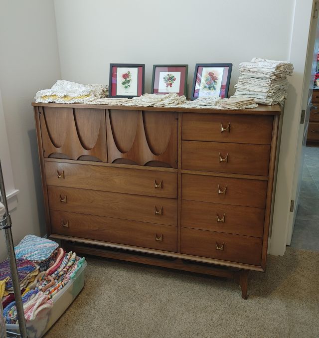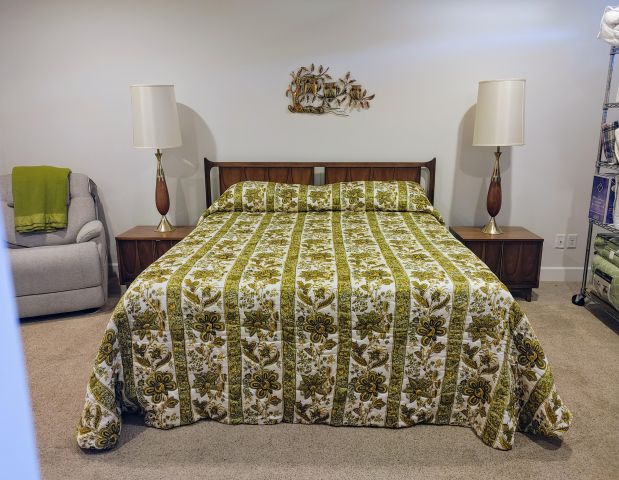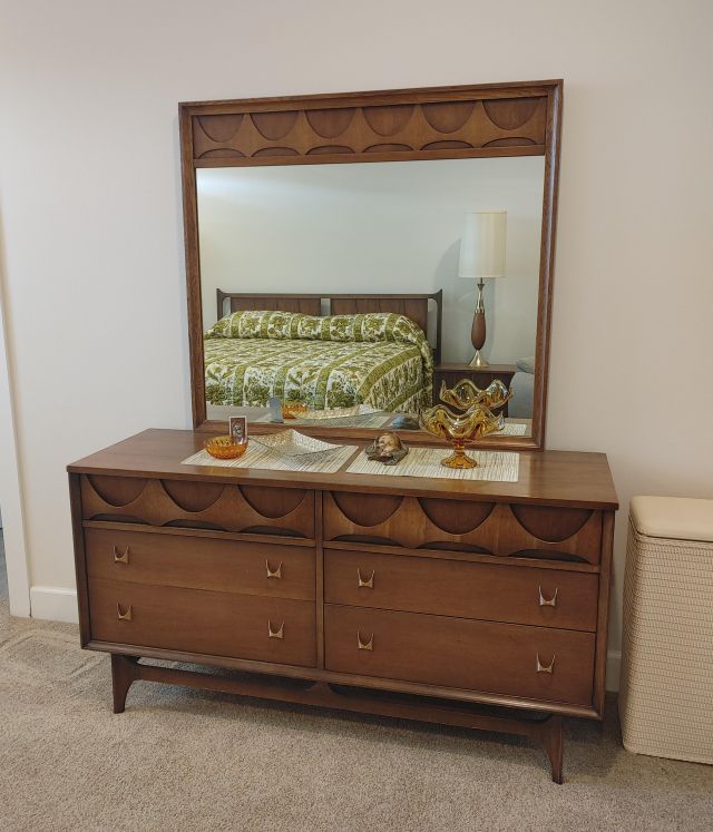 Primary bedroom: A must see MCM Broyhill bedroom suite, a like new recliner, and linens.