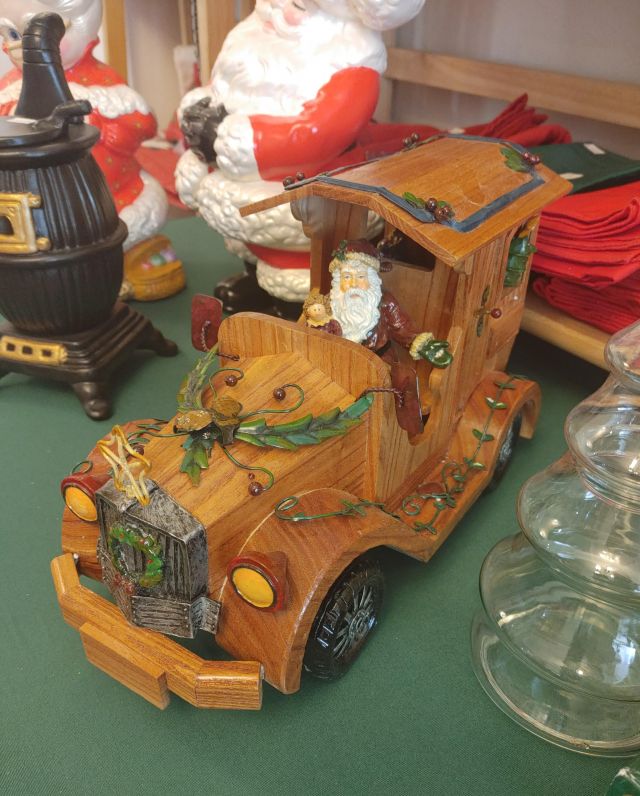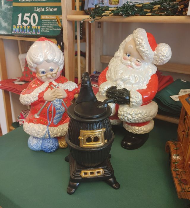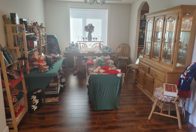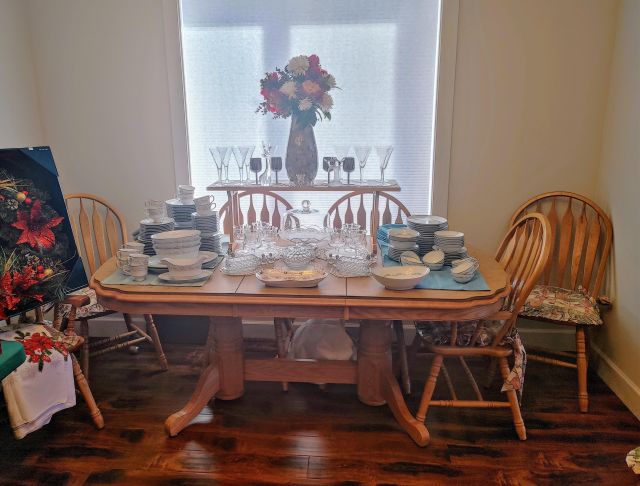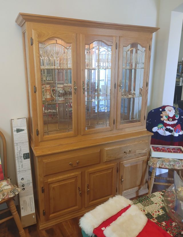 Dining room: Classic oak table and hutch, vintage dishware, and Christmas decor.