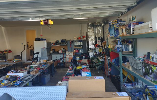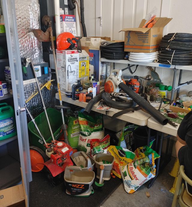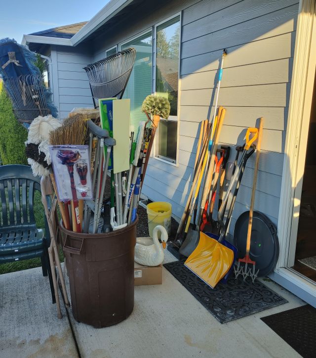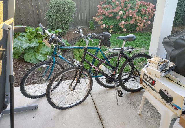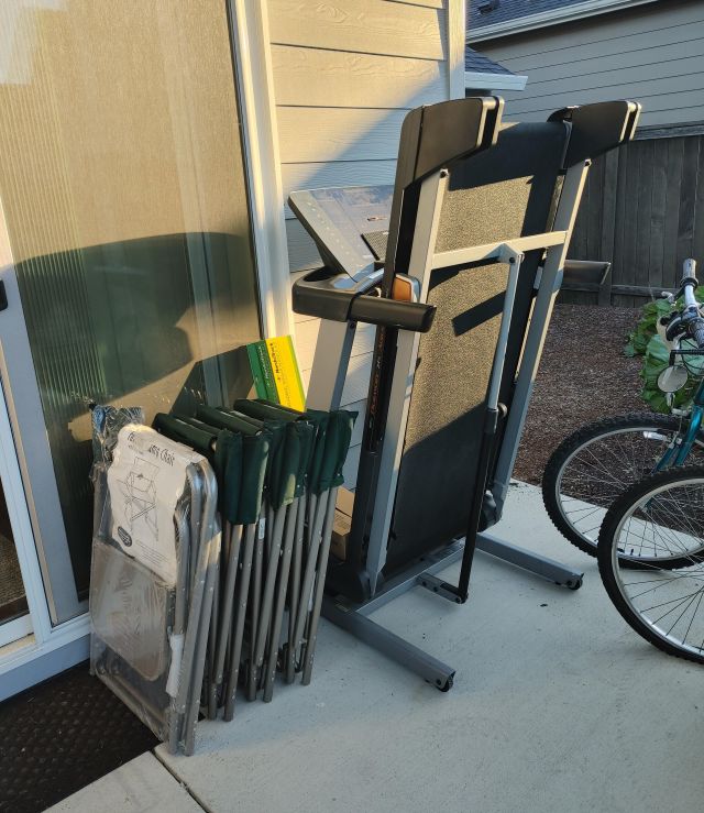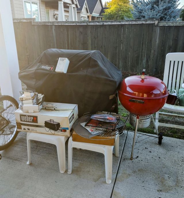 Patio: Weber grills (gas and charcoal), camp chairs, 2 Trek bikes, treadmill, and garden tools.