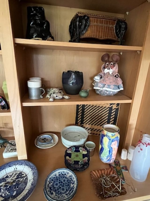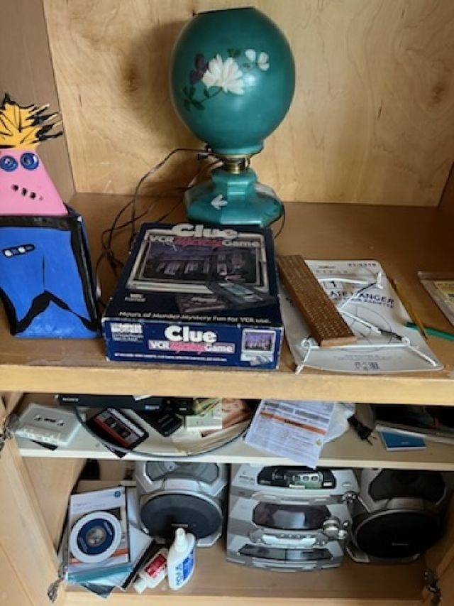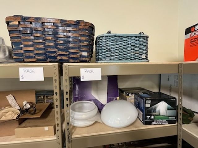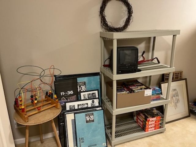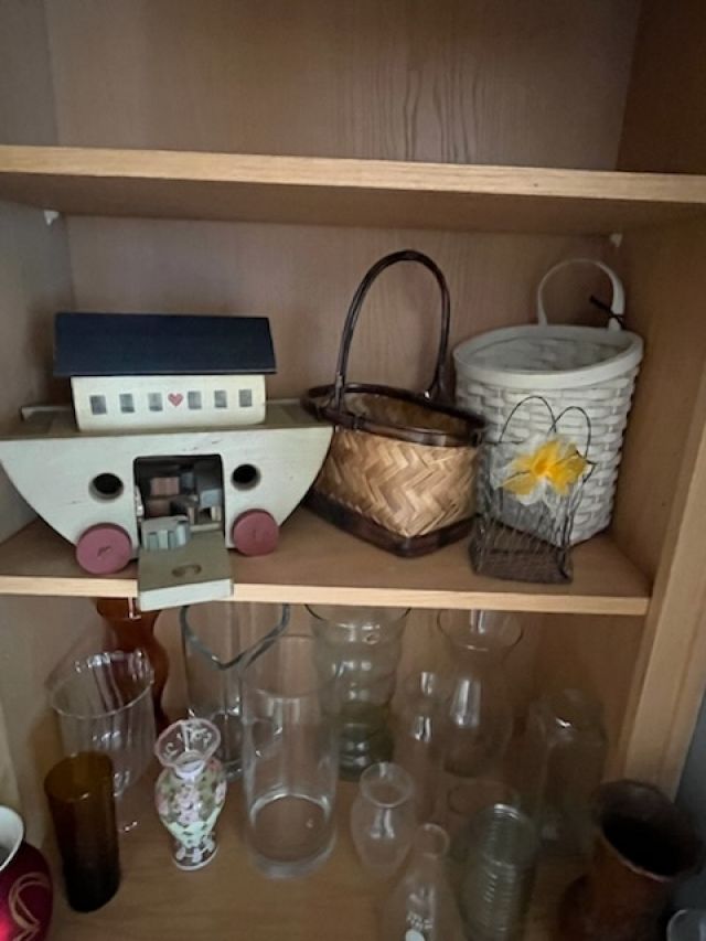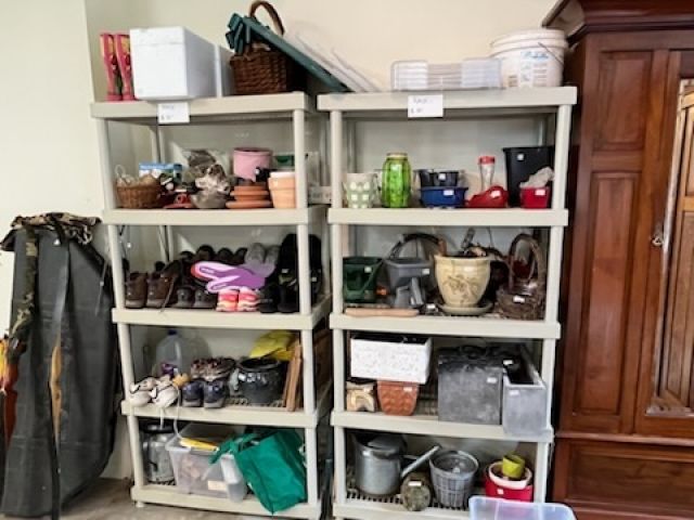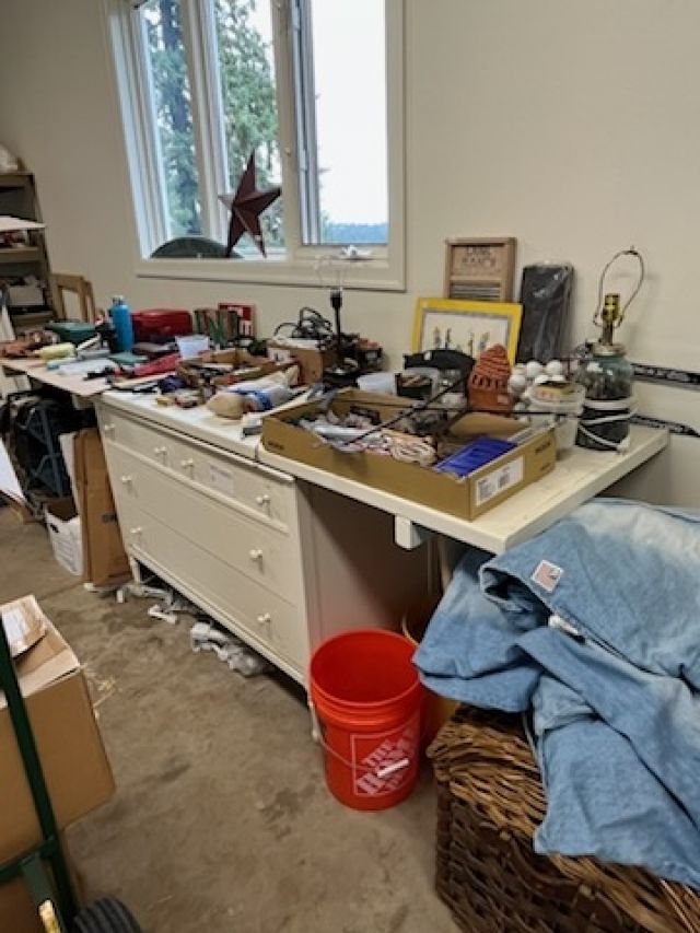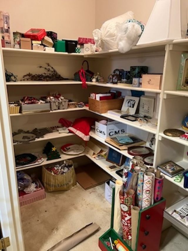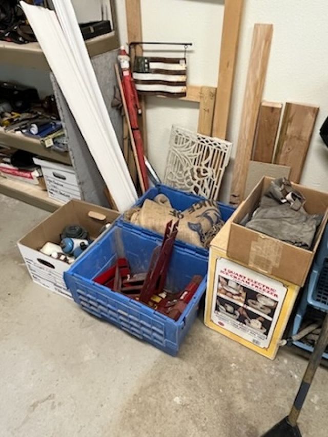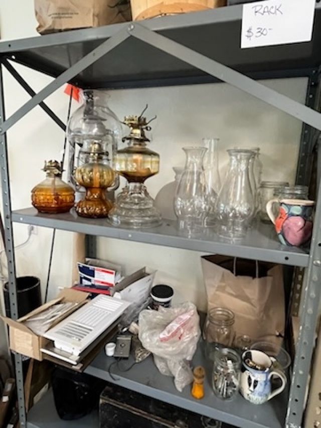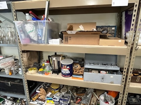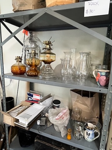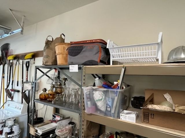 Cleansers, Linens, Lots of Books, Shoes, Clothes, Hats, Lots of Health and Beauty Aids, Umbrellas, Candles, Ornaments, Food, Dishes, Window Drapes, Luggage, Office Supplies, Painting Supplies, Lots of Canning, Vacuum, Holmes Air Purifier, CDs, Christmas Wrap, Bags, Andirons, Wagner Cast Iron,