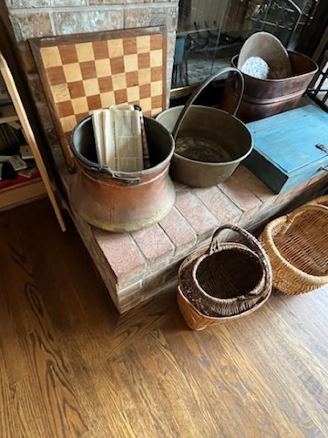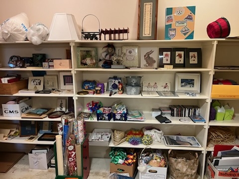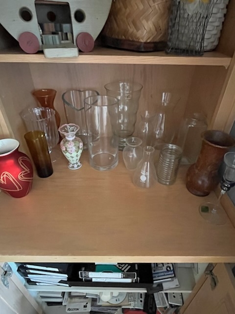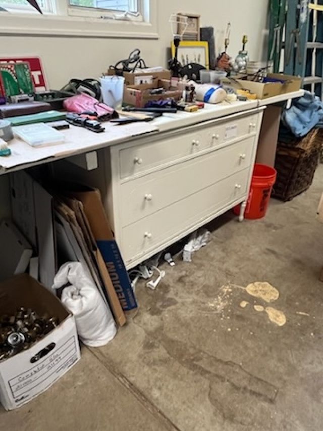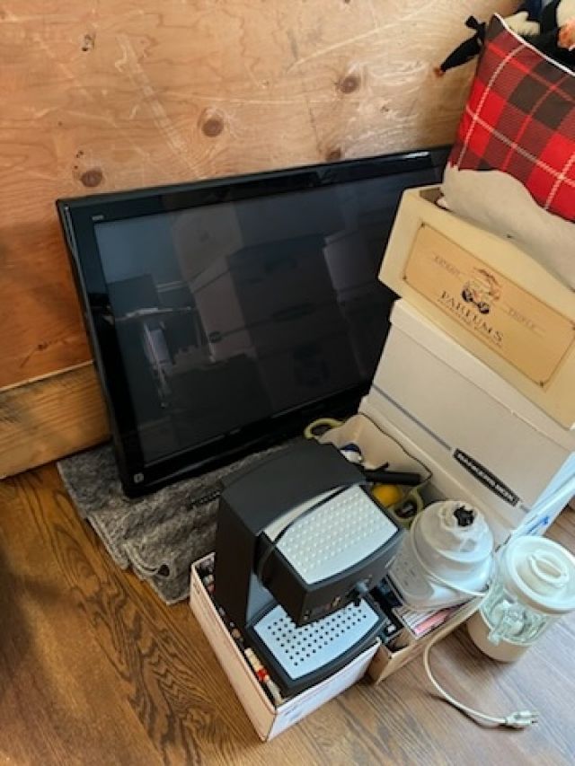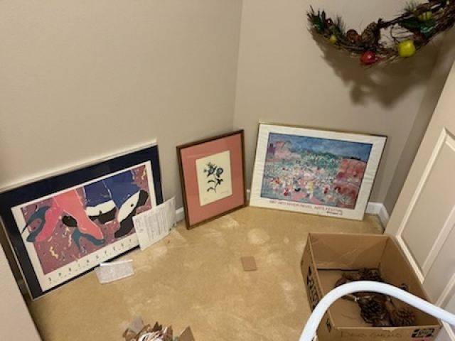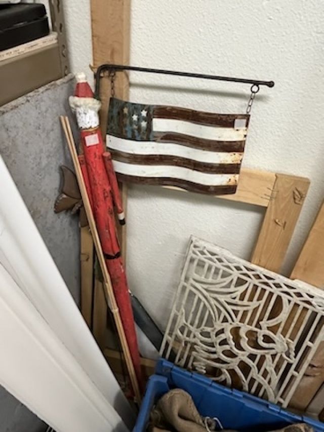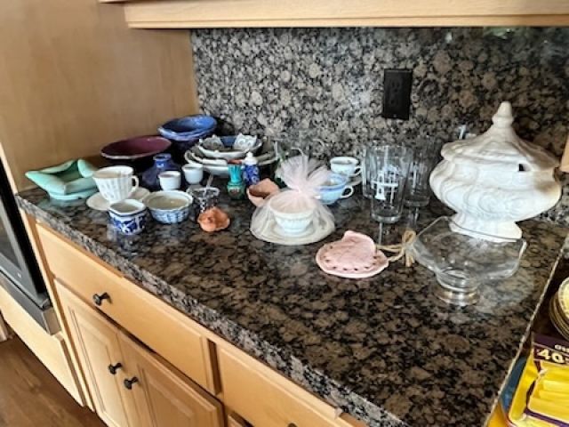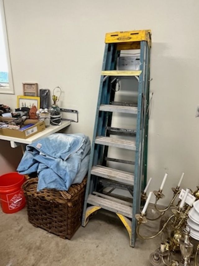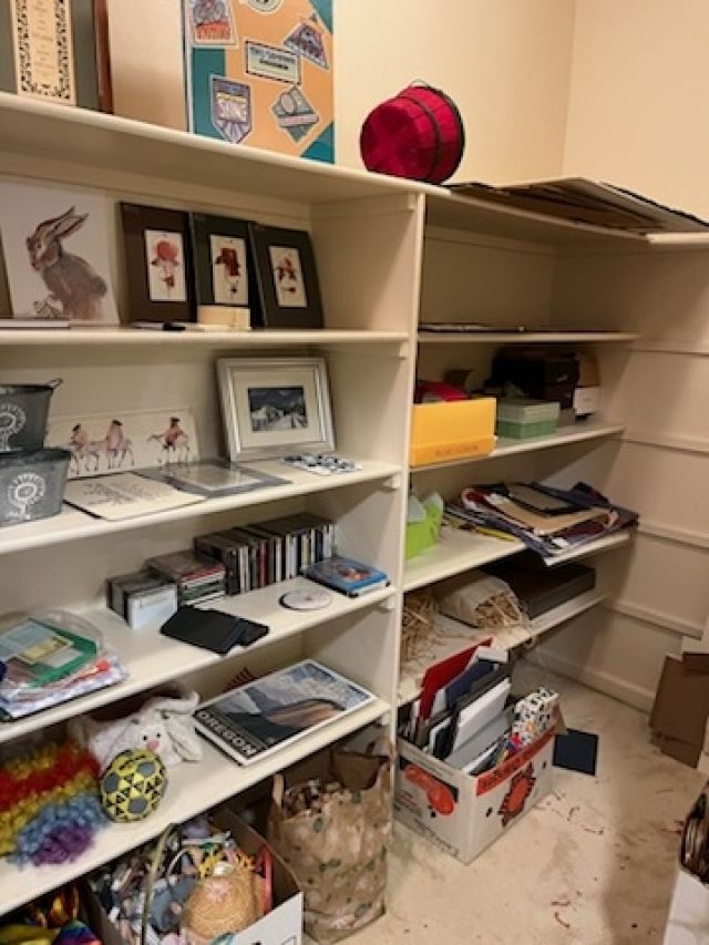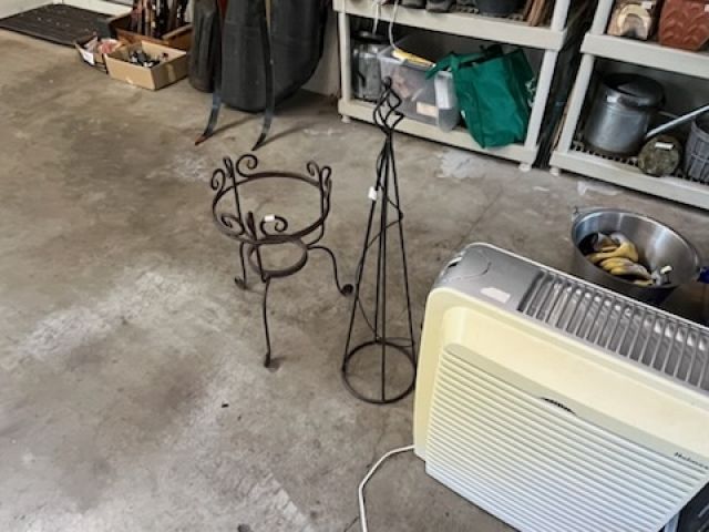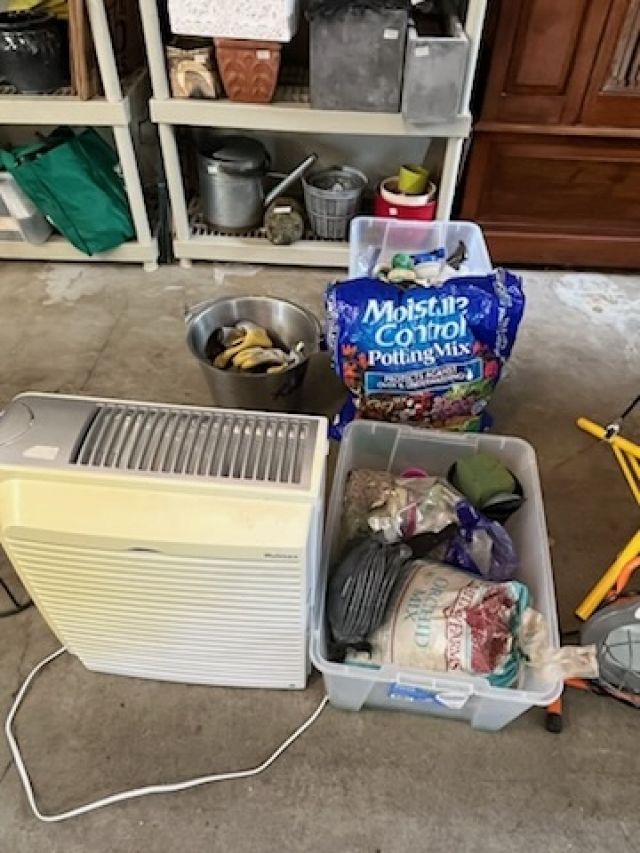 Cleansers, Linens, Lots of Books, Shoes, Clothes, Hats, Lots of Health and Beauty Aids, Umbrellas, Candles, Ornaments, Food, Dishes, Window Drapes, Luggage, Office Supplies, Painting Supplies, Lots of Canning, Vacuum, Holmes Air Purifier, CDs, Christmas Wrap, Bags, Andirons, Wagner Cast Iron,