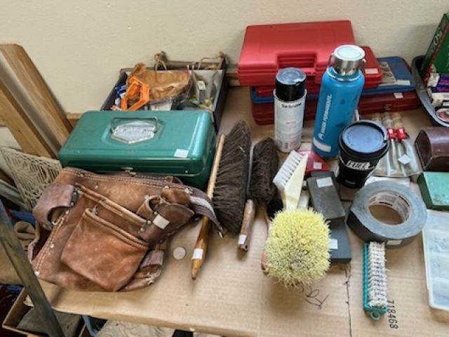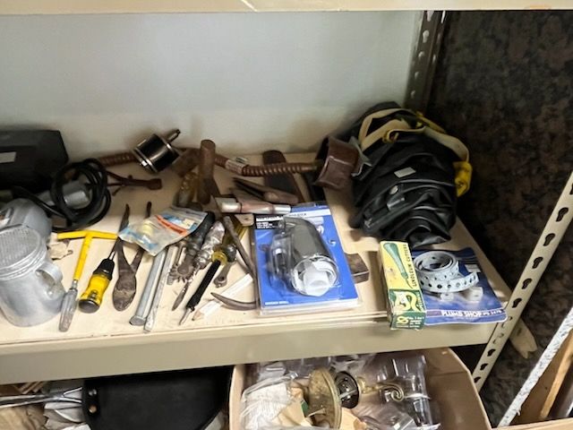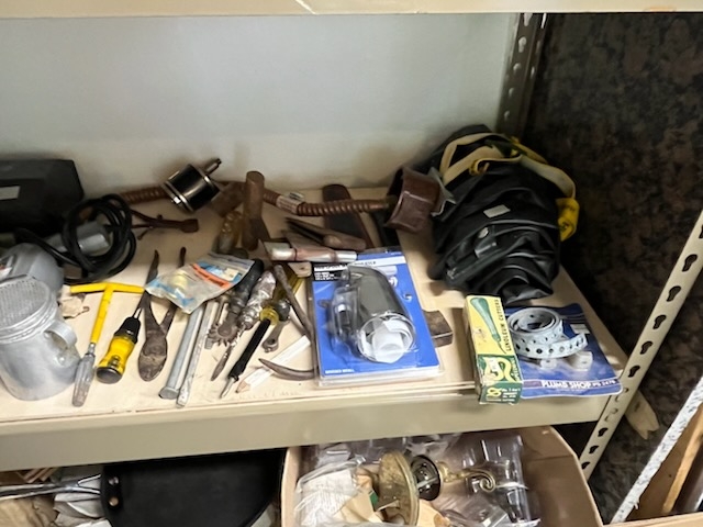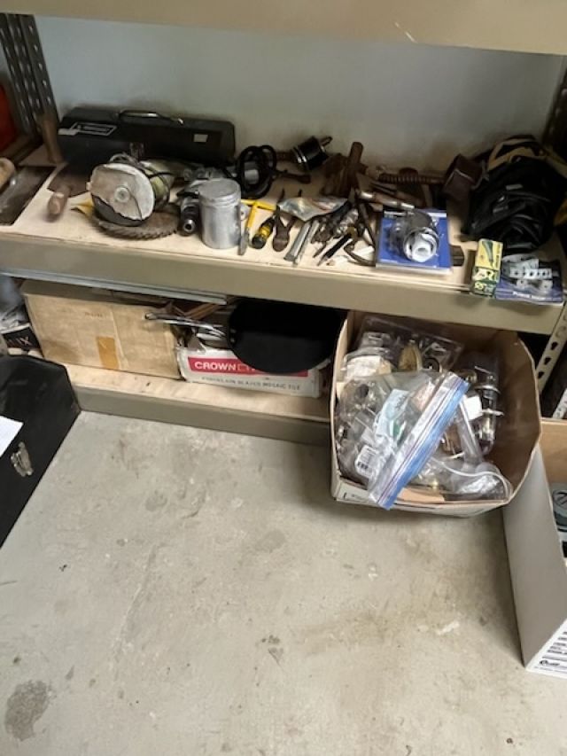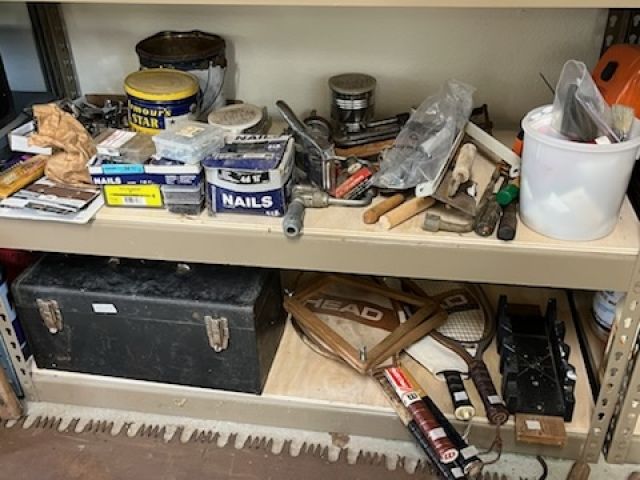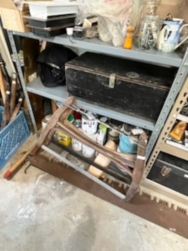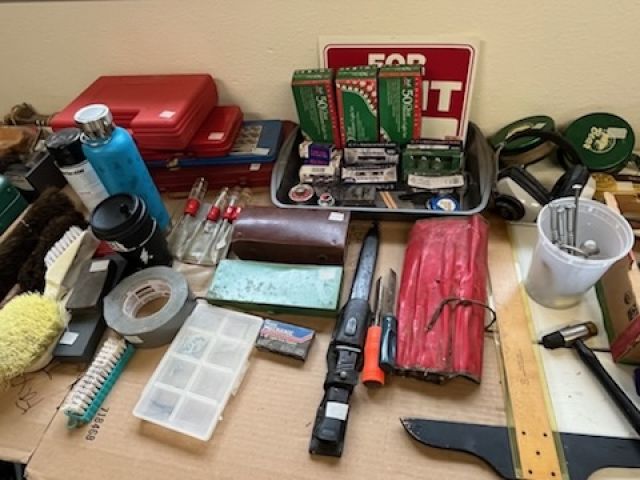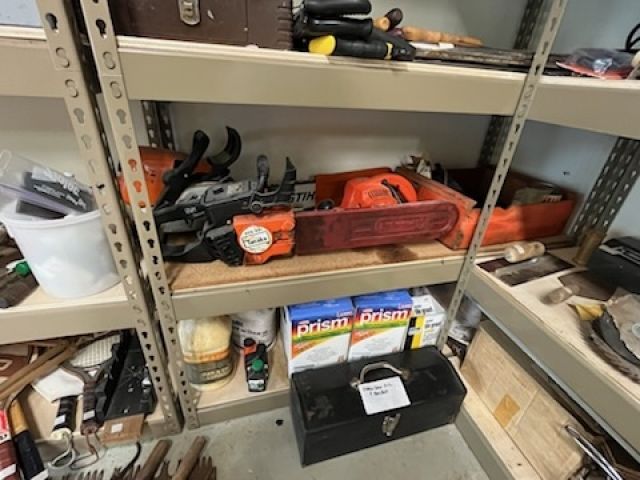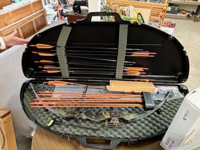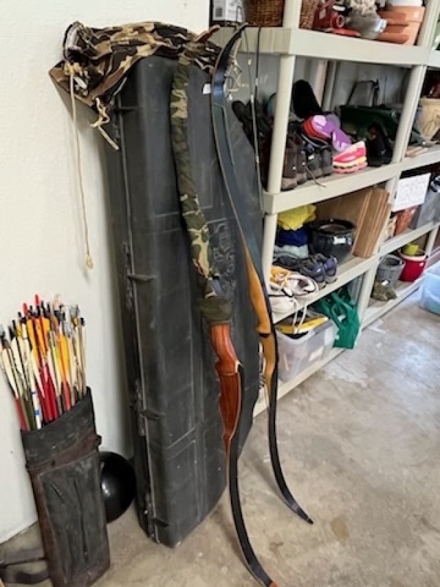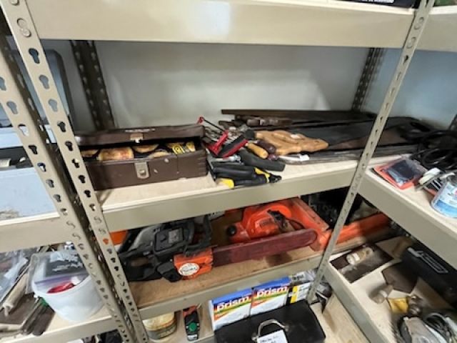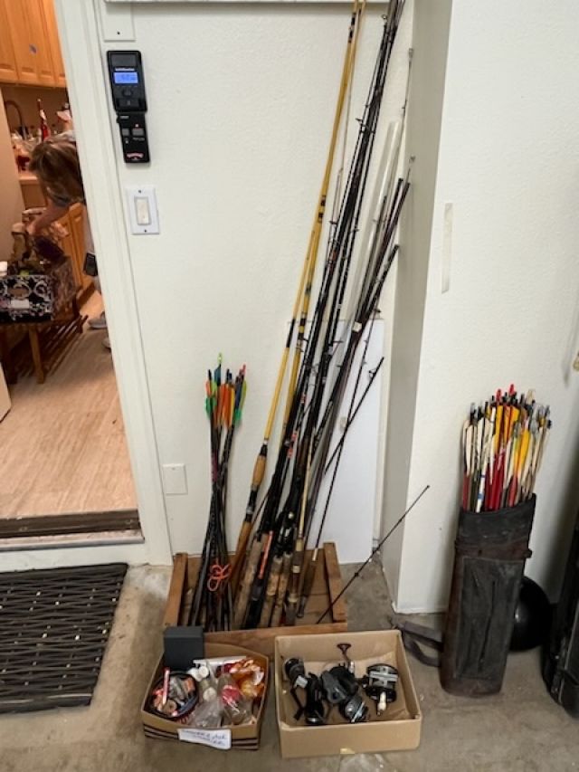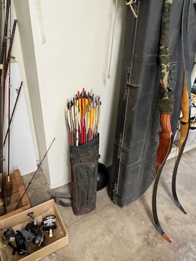 Lots of Fishing Rods, 2 Recurve Archery Bows, Compound Archer Box, Arrows, Loom, Lots of Tools, Ladders, Lawn Mower, Lawn and Garden Tools, Exercise Equipment, Bowflex, Lots of Hardware, Primitives, Snowboarding Helmet, Dart Board, Crab Pots, Kerosene Heater, Bear Rugs, Chainsaws, Pneumatic Tools, Vtg Tennis, Old Saws,