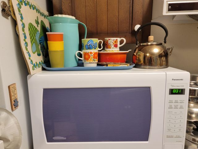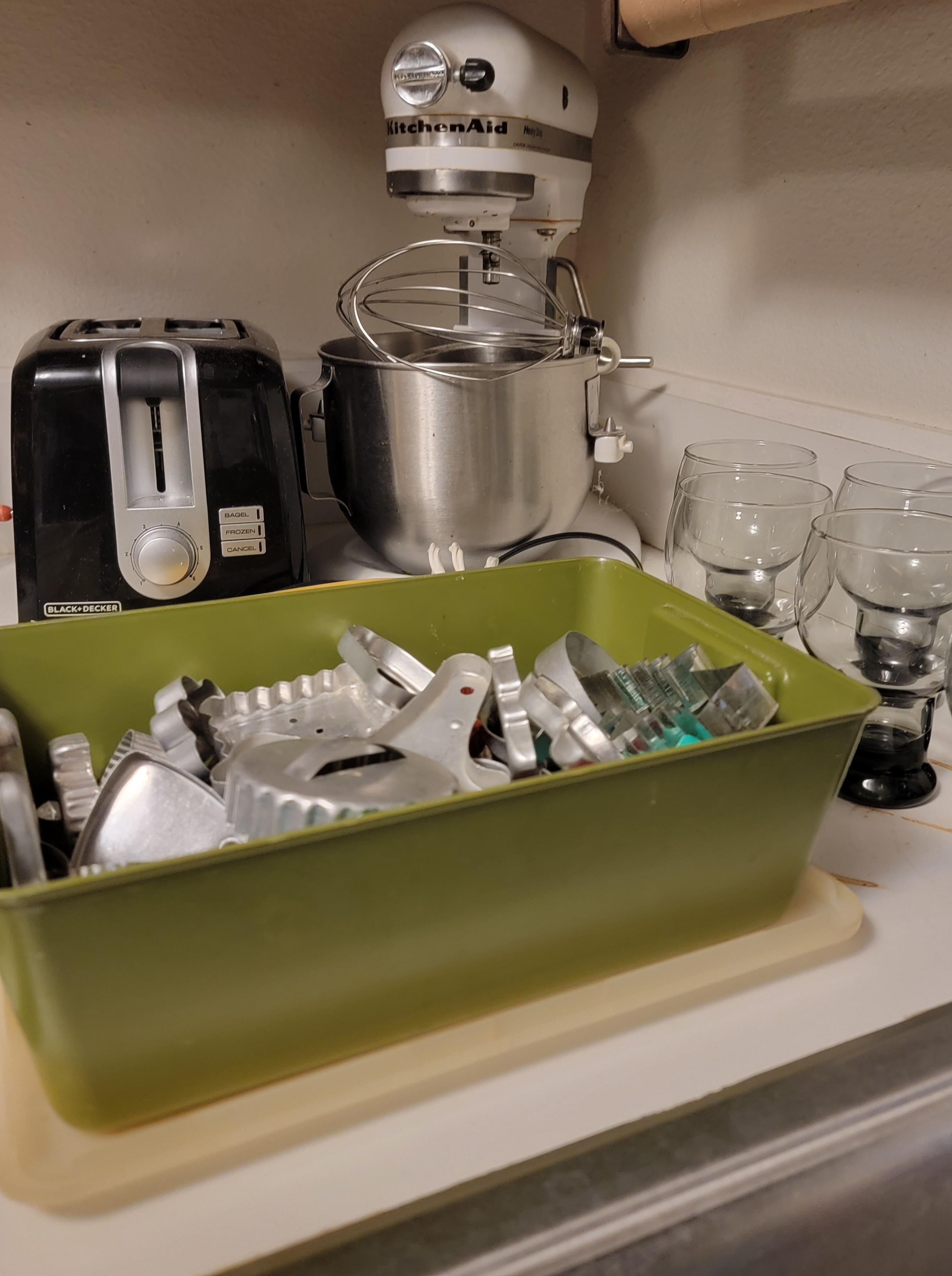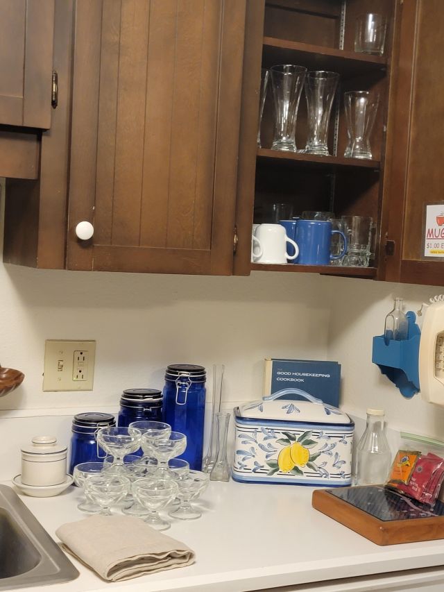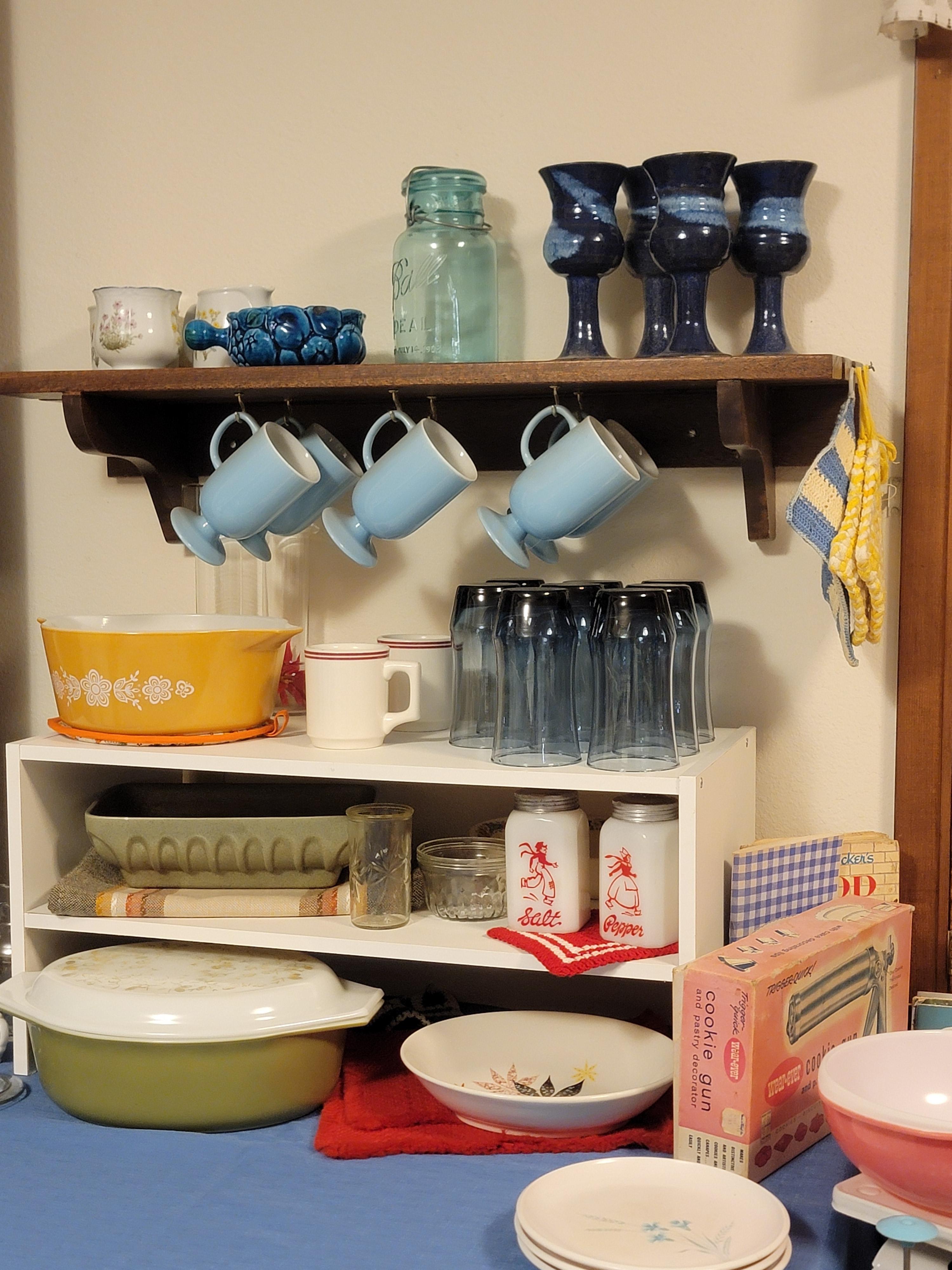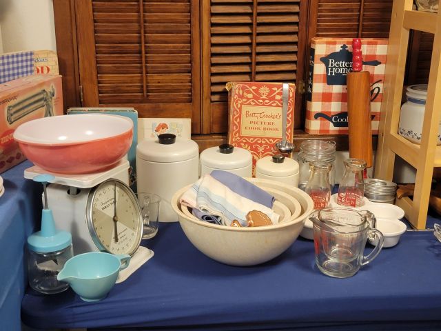 Kitchen items: Small appliances including a KitchenAid mixer, microwave, toaster, pressure cooker, & more. Tableware, Flatware, cutlery, baking items, mixing bowls, Cookware/pots & pans, Fine china, Vintage Corelle Set, PYREX, Dinking glasses/mugs, Vintage crock, Utensils, Gadgets/Gizmos, Table linens, Cookbooks, Tupperware, Coffee Pot, Teapots, Canning, & lots of Decor.