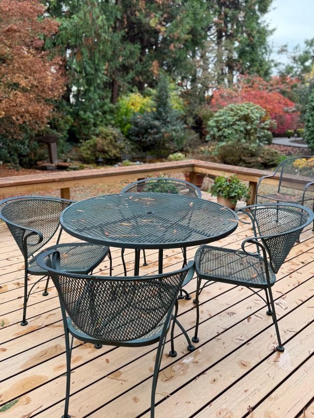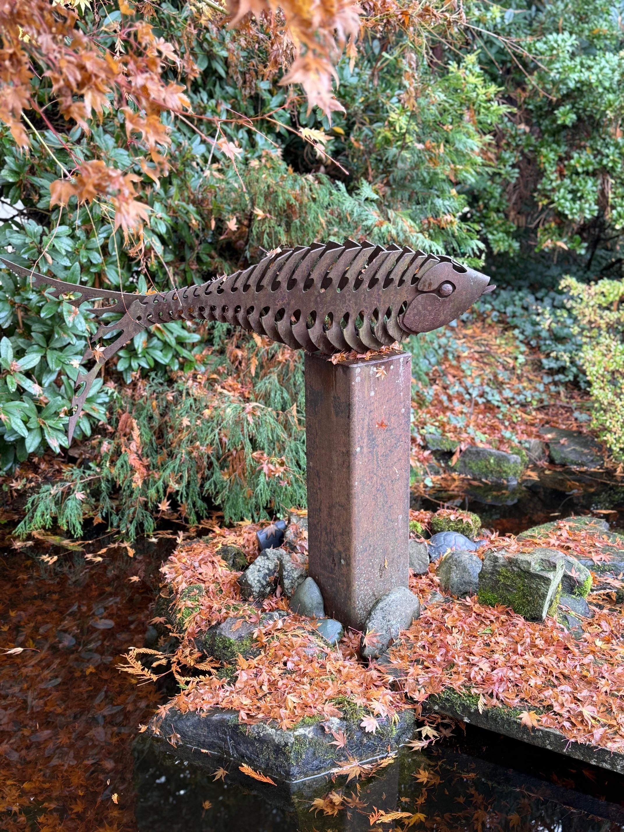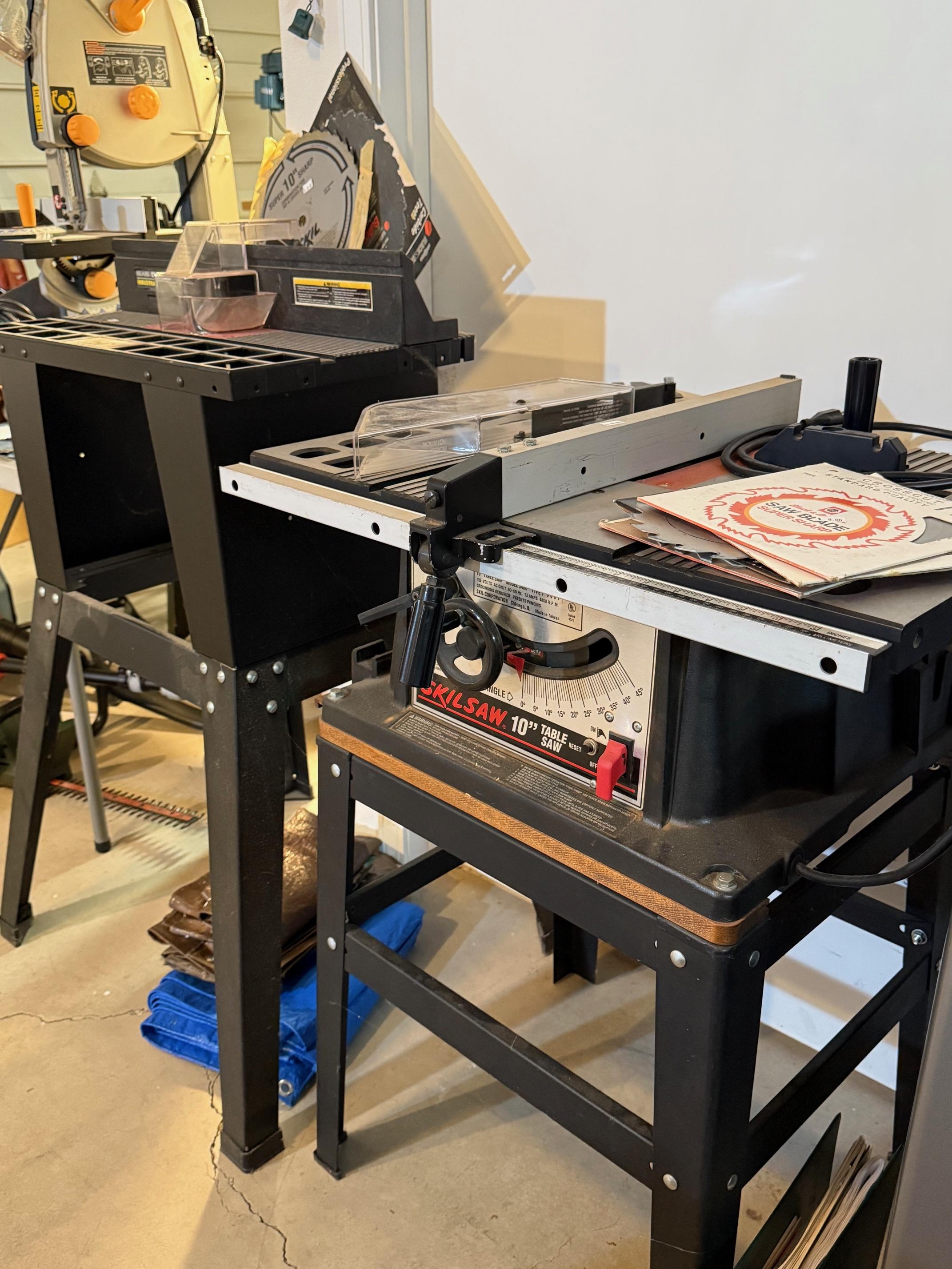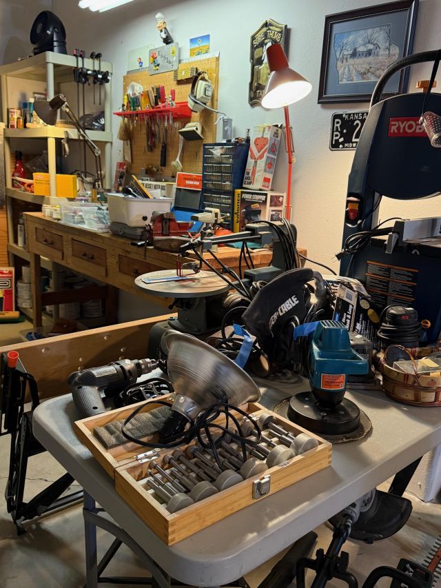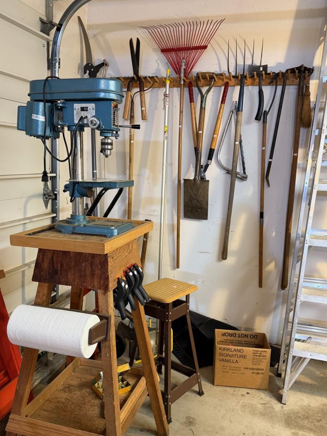 Garage loaded with tools, woodworking tools, hand tools. Fabulous fish sculpture nestled next to the outdoor patio set.