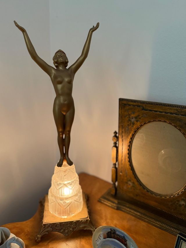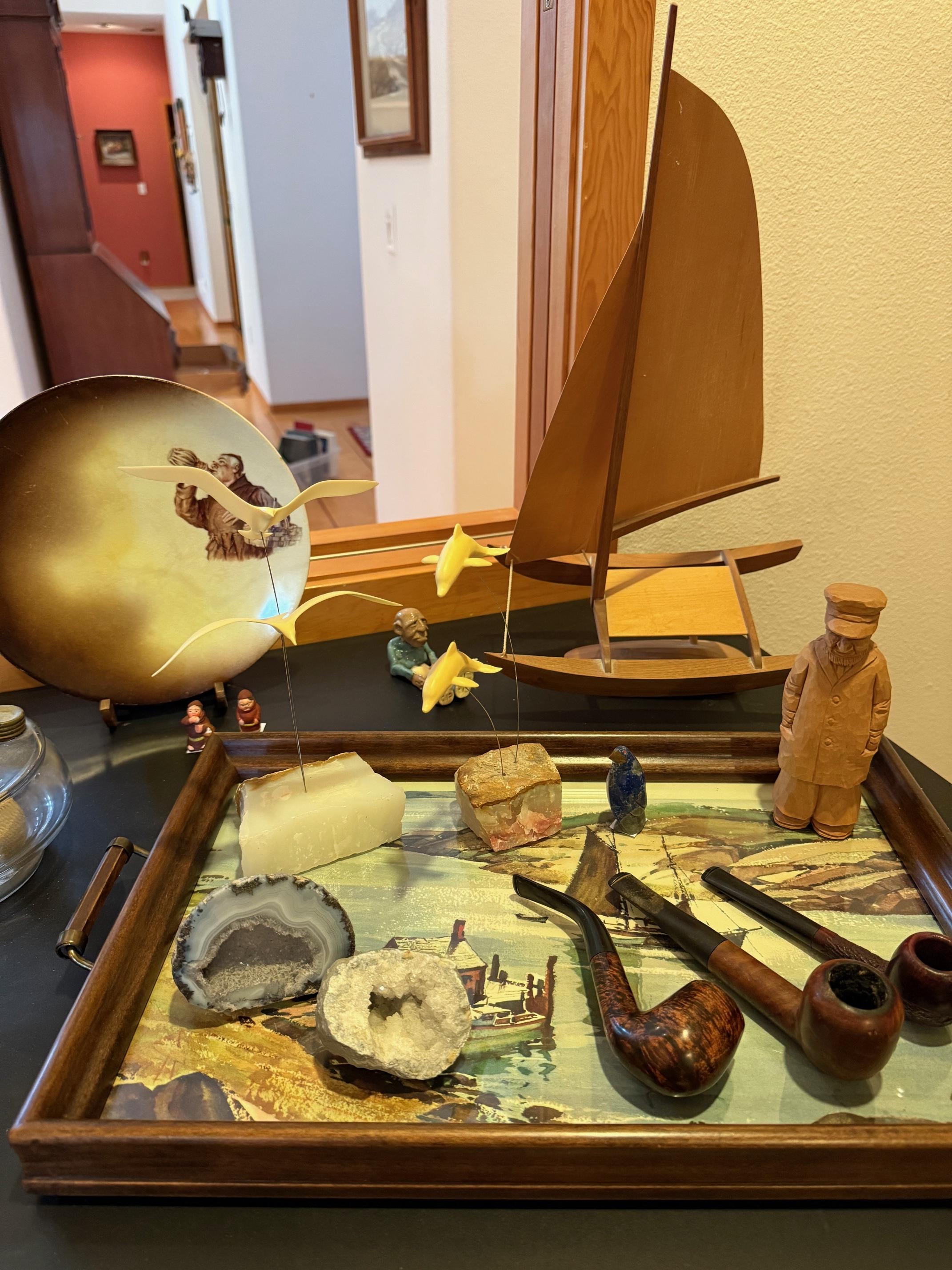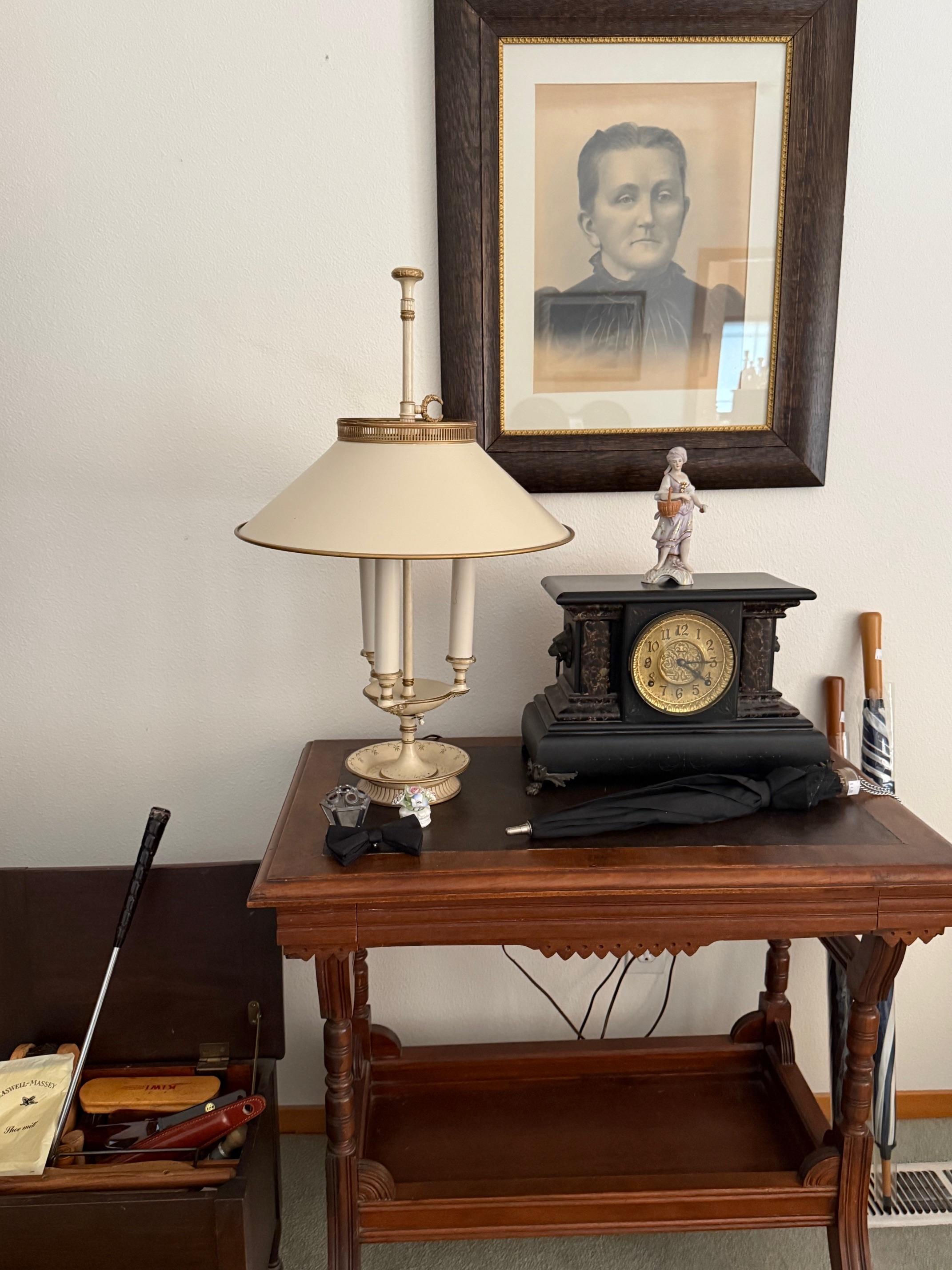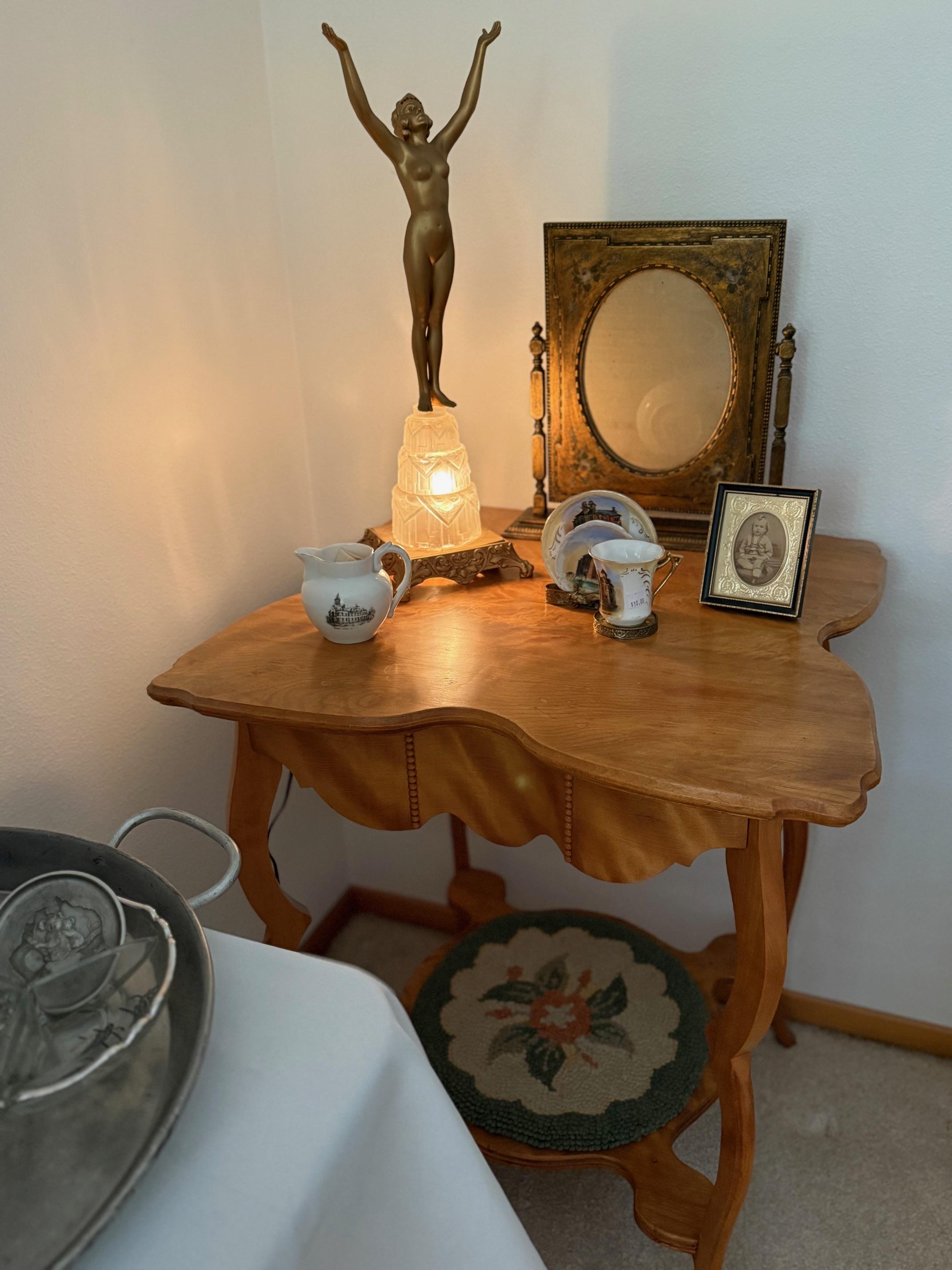 Antique quilts, dachshund boot scraper, military memorabilia, buttons, pins, fishing. Pin backs, medals, patches. Art. The must see elephant phone… Deco table Lamp
