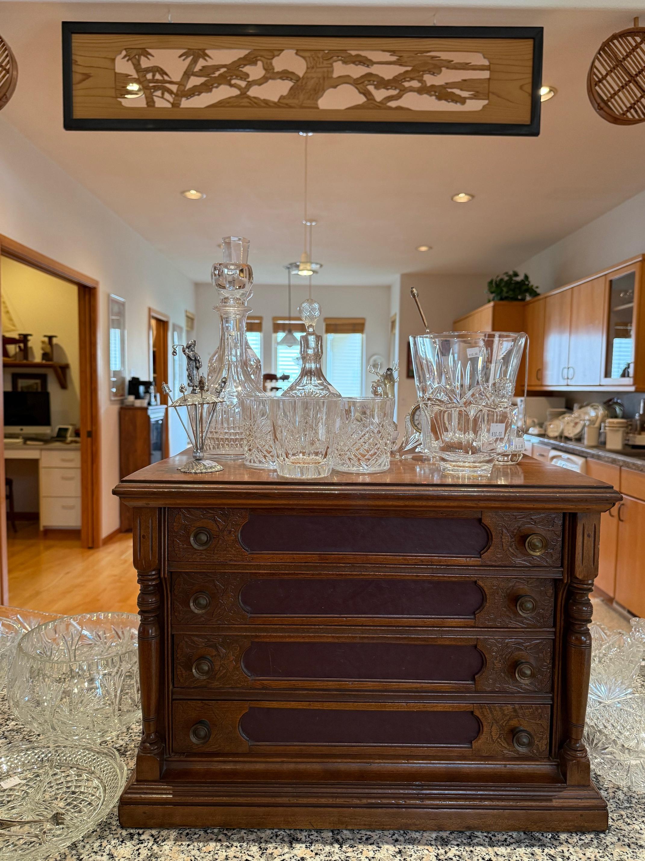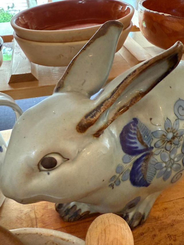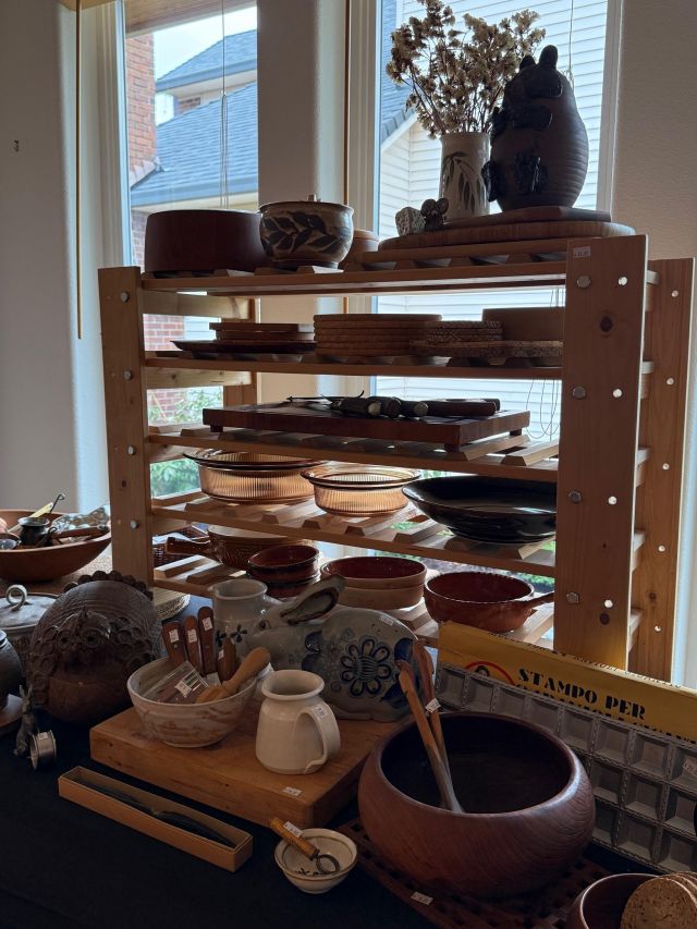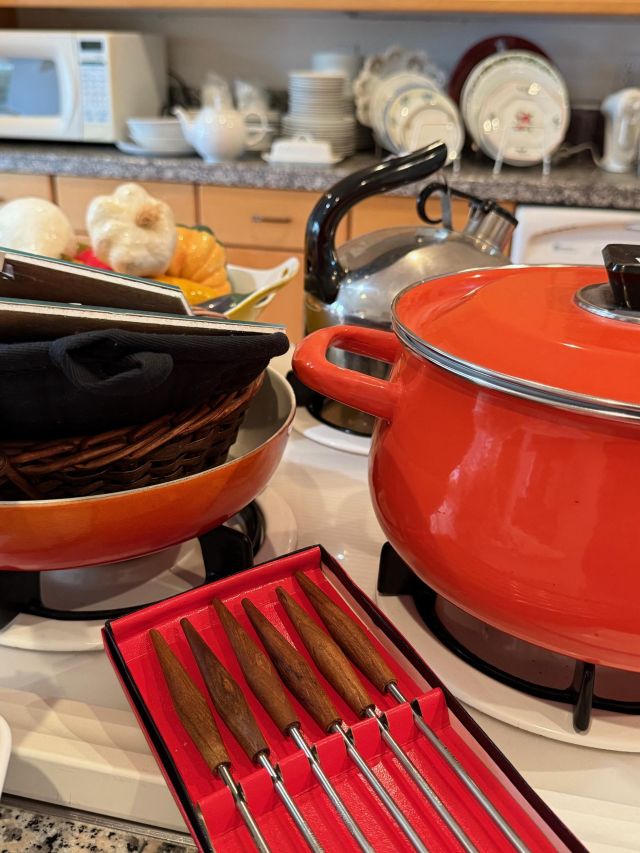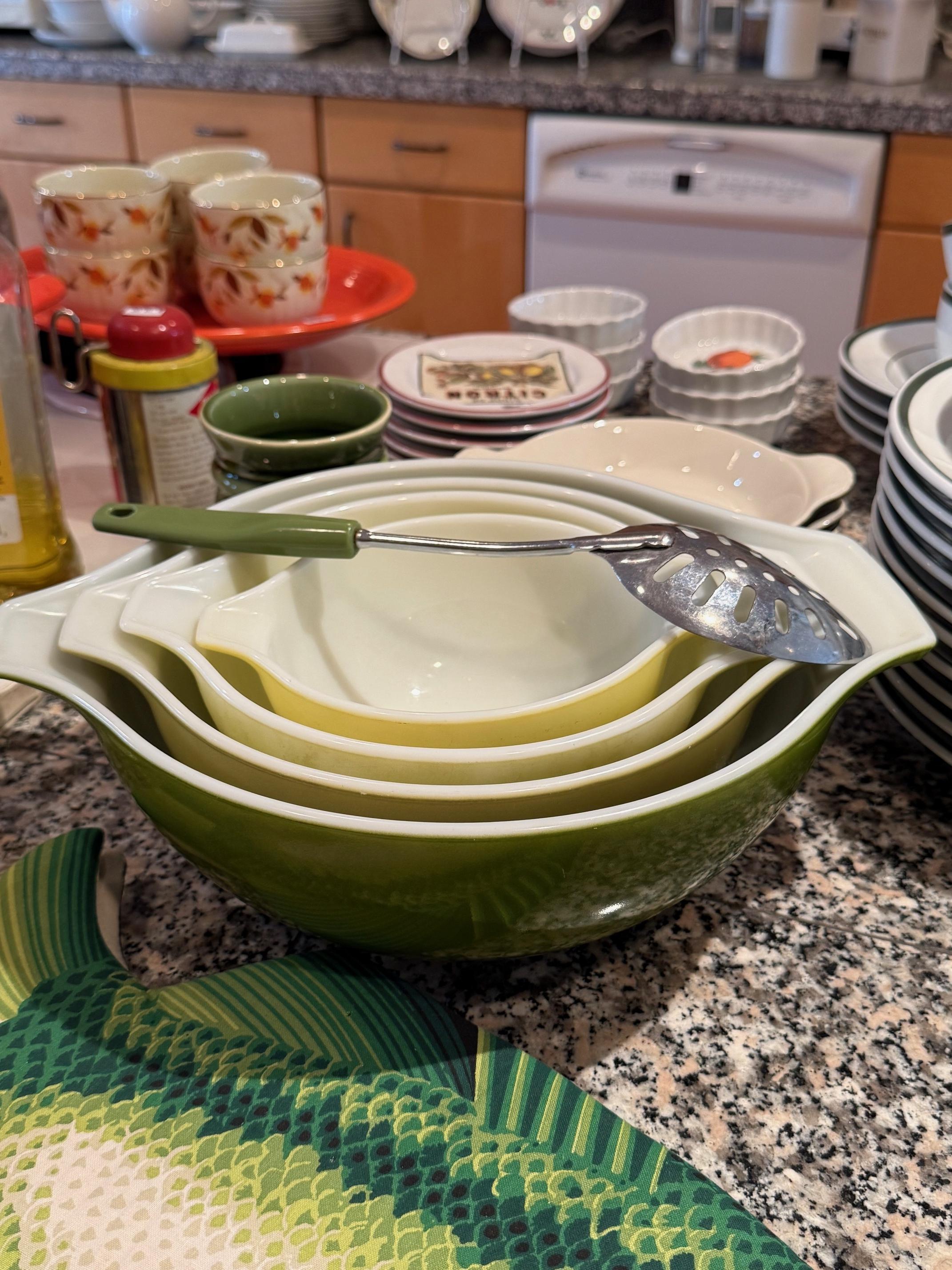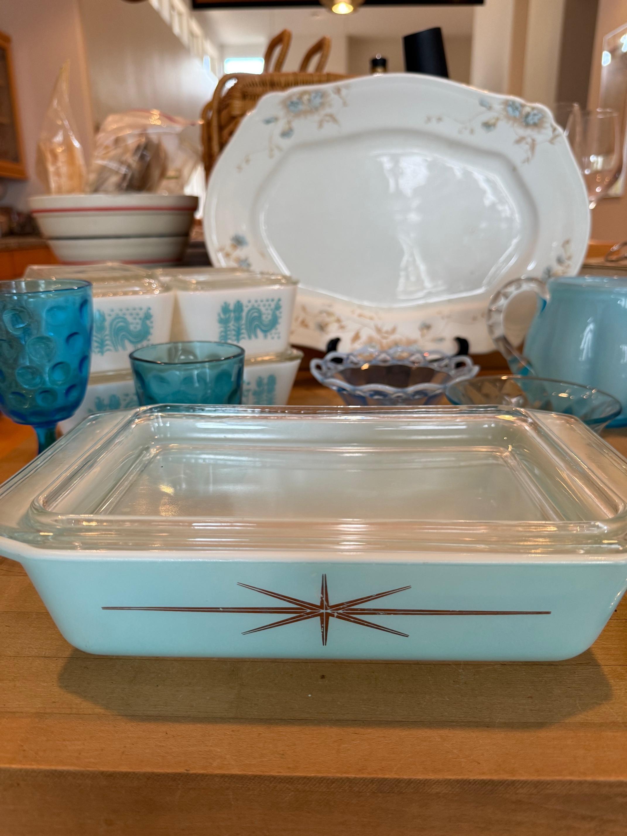 Kitchen is an entertainers dream, pottery, atomic Corning ware. Chopping block.