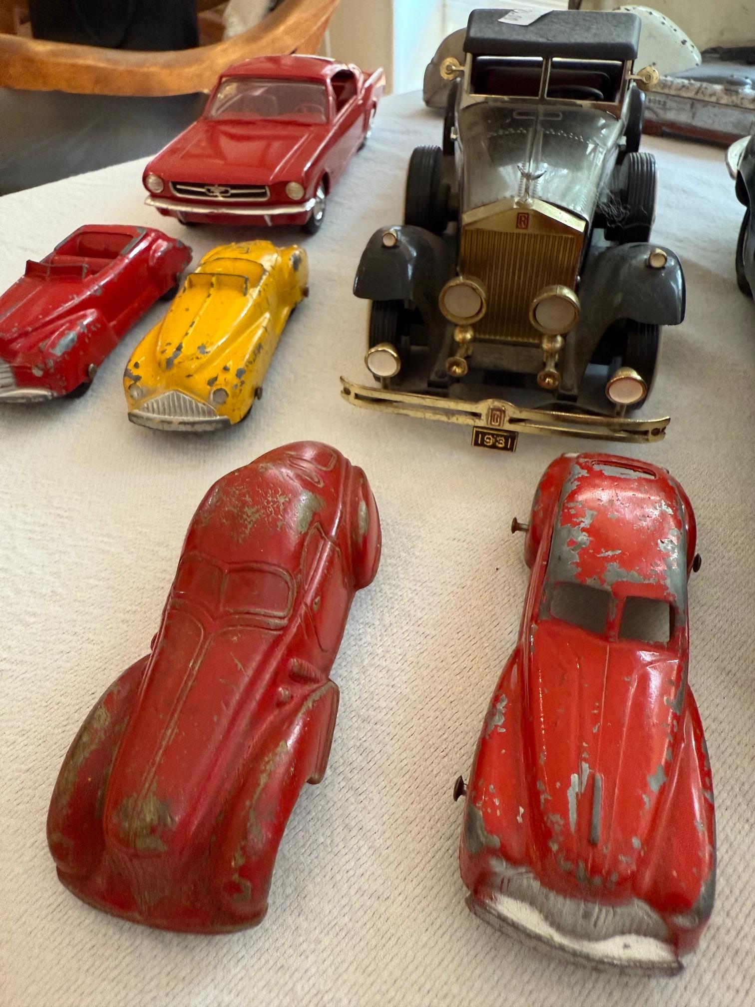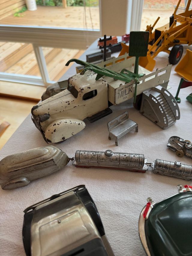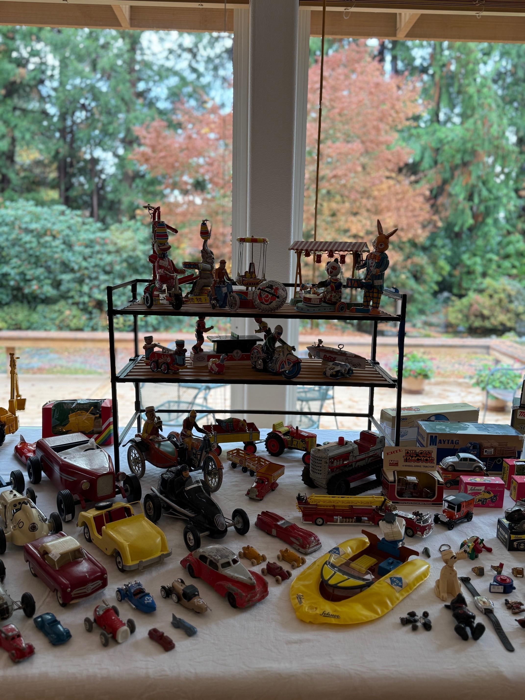 The toys…Cars, planes, models, more cars, Early Disney, tractors and trailers, Massey-Ferguson and John Deere. Gas powered Motors, Original Thimble drome cars!!! Gas powered. Vintage tin, Corgi, Schuco, tin vintage toys.