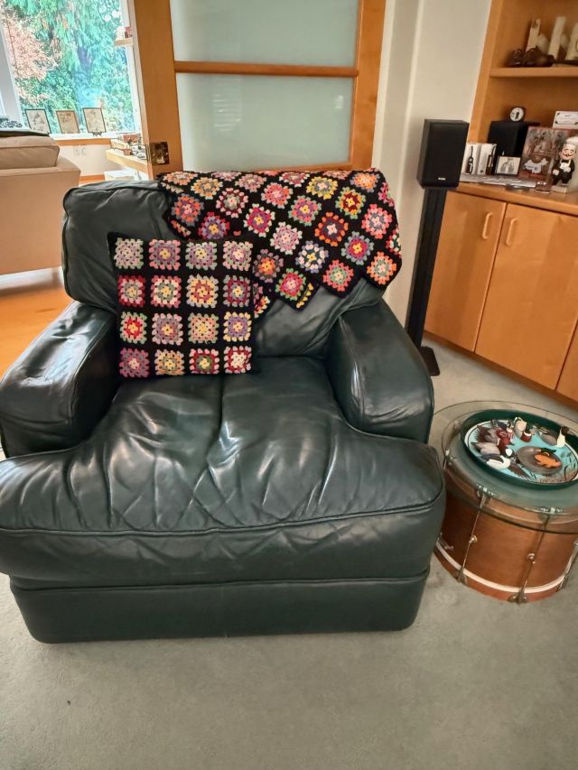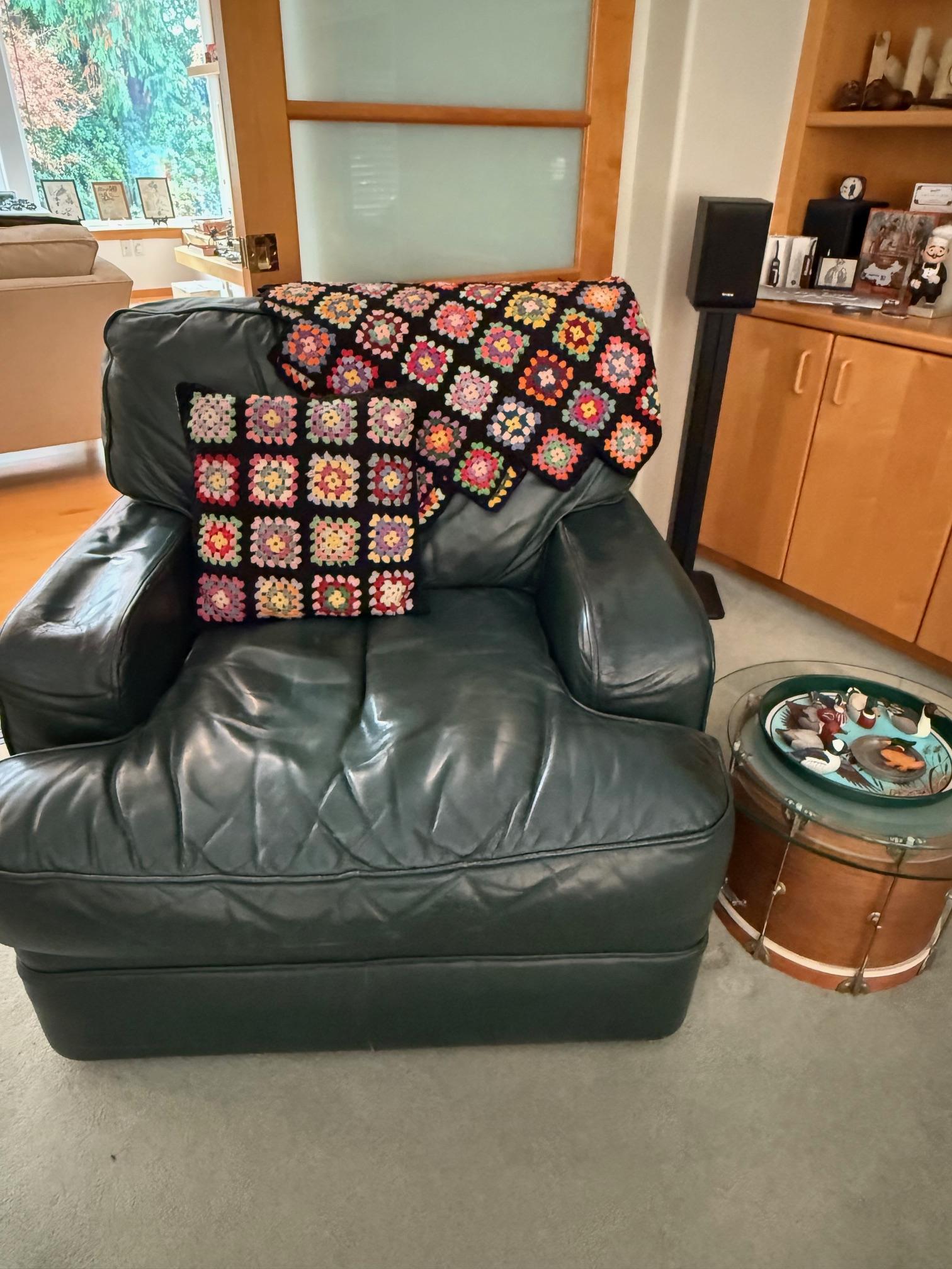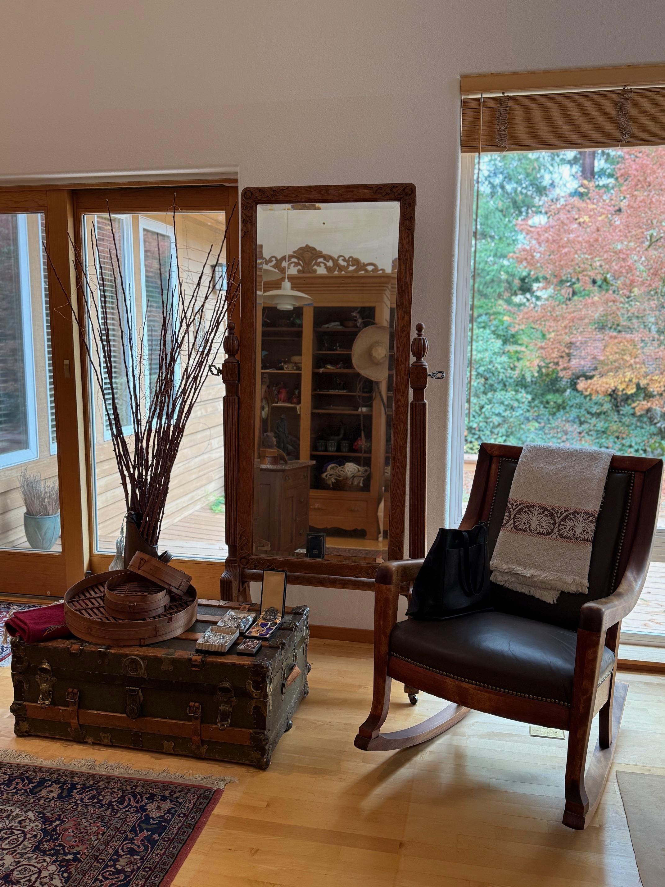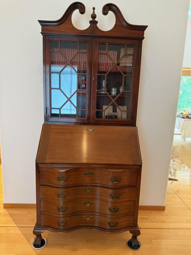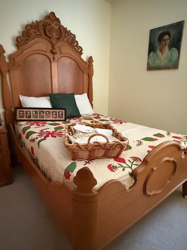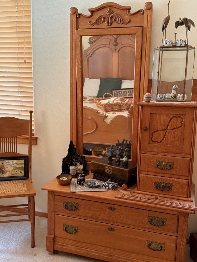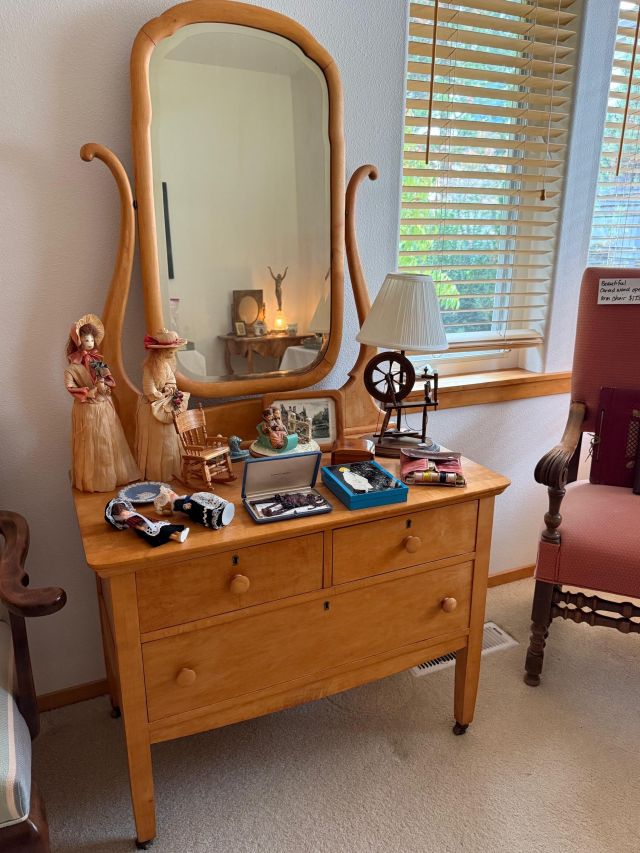 Leather sofa and chair. Antiques everywhere…nothing but quality here. That bed..dressers, stack book case, secretary, accent tables and chairs. Lovely spool cabinet.
