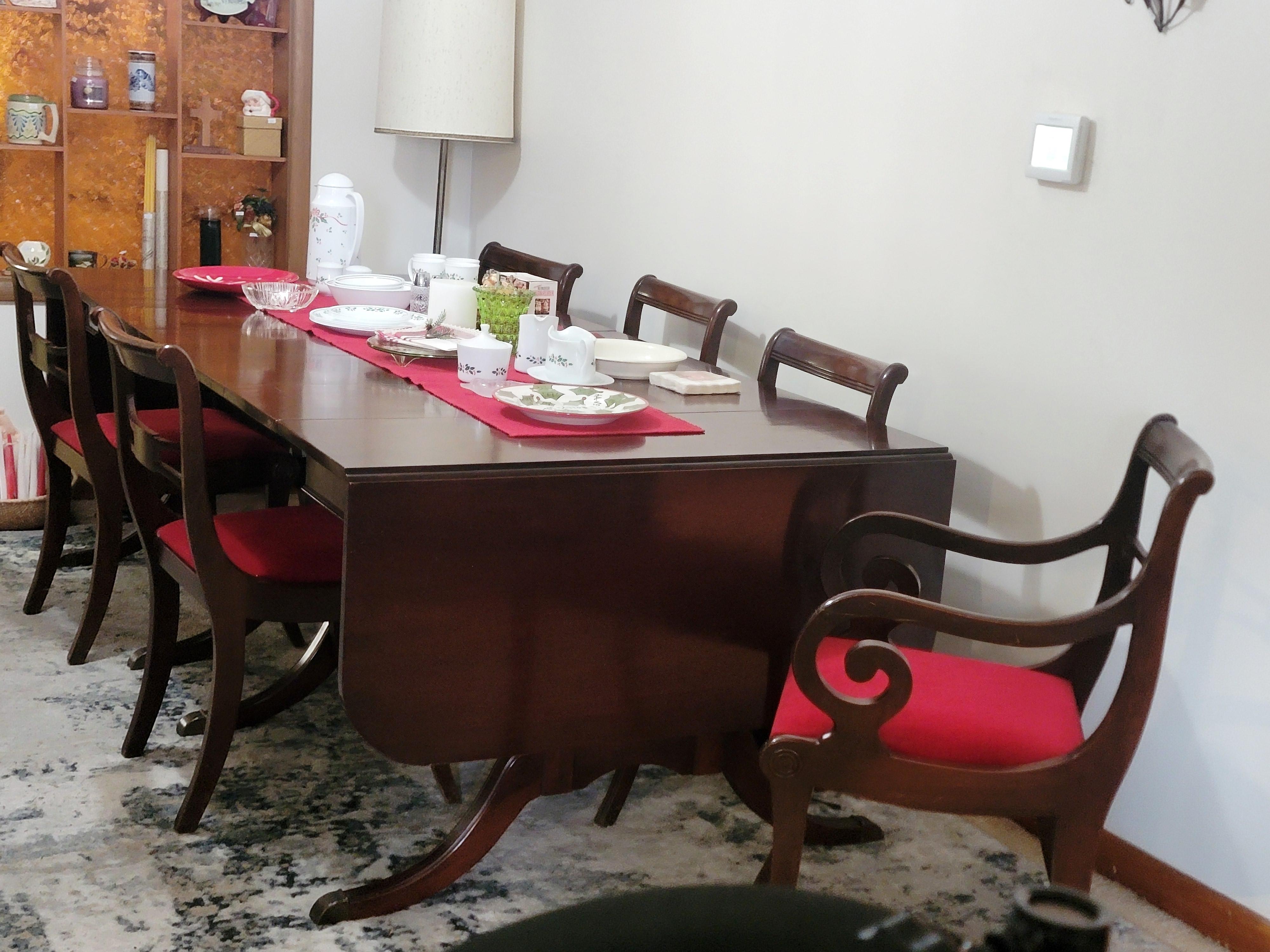 Gorgeous antique drop leaf dining room table with multiple leaves and scrolled arm chair.
