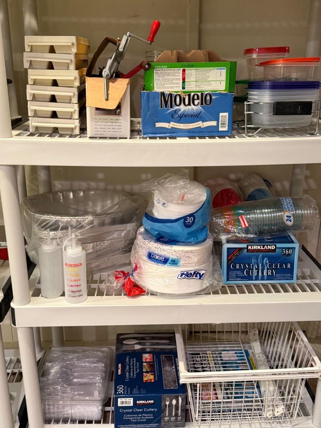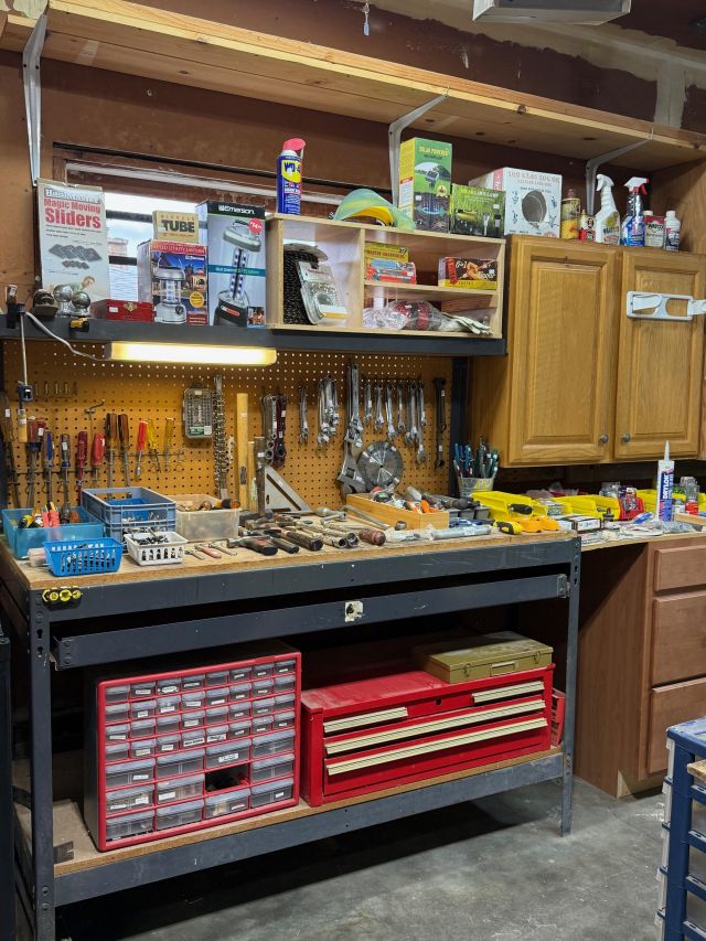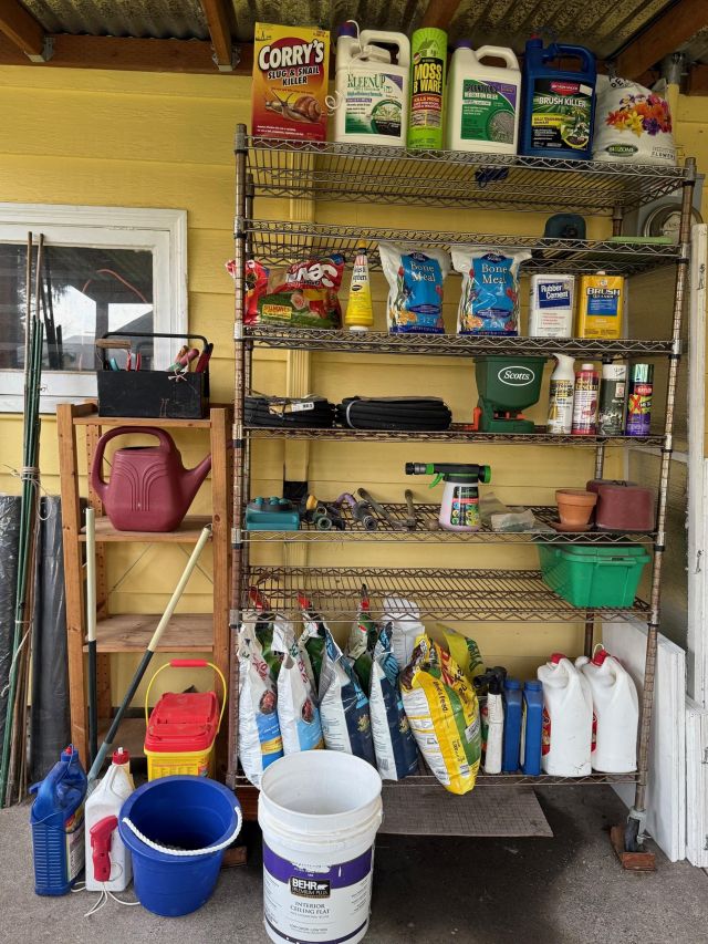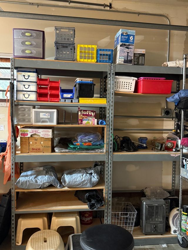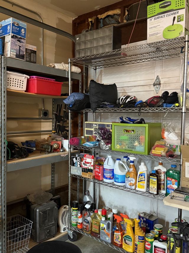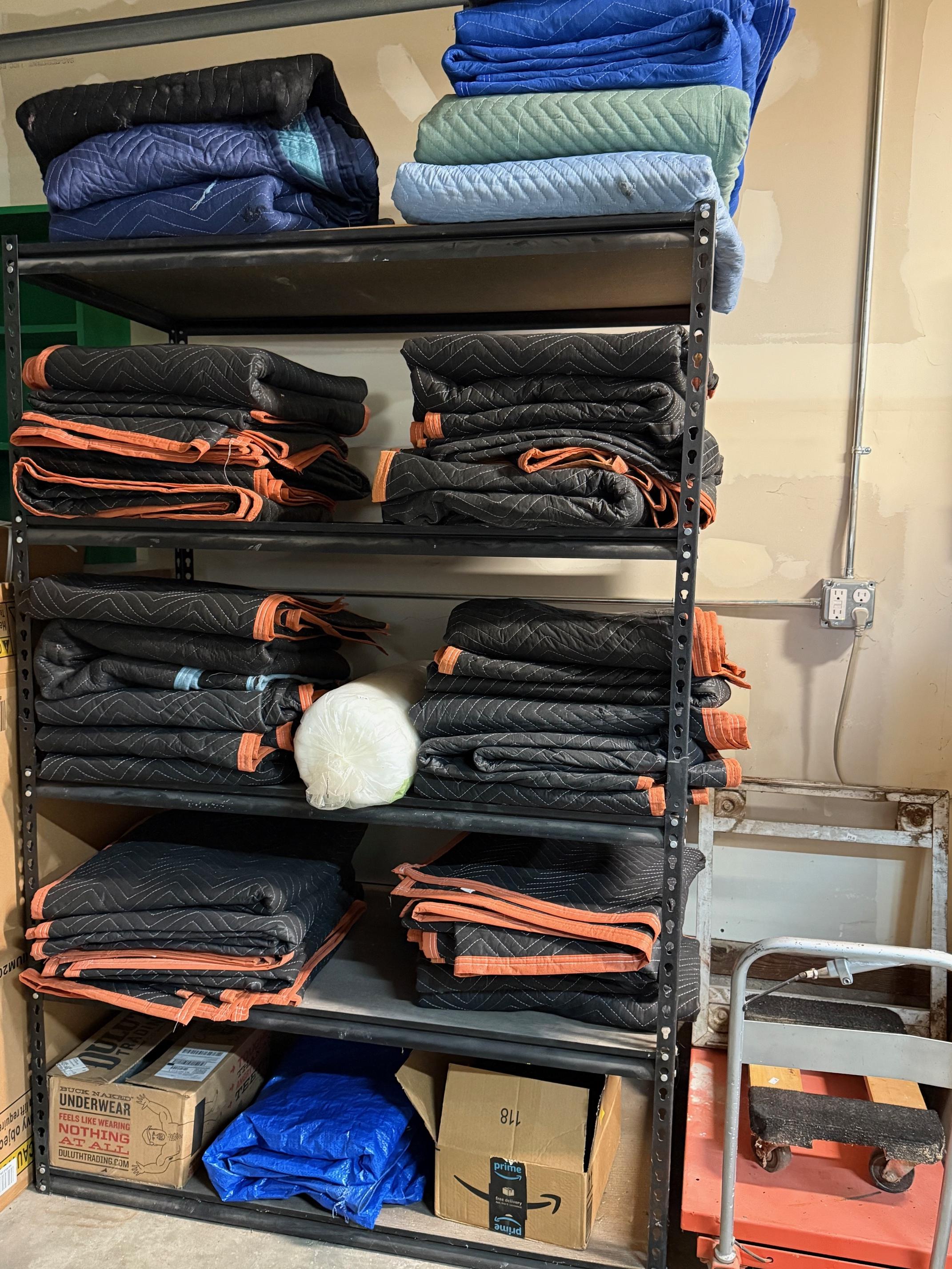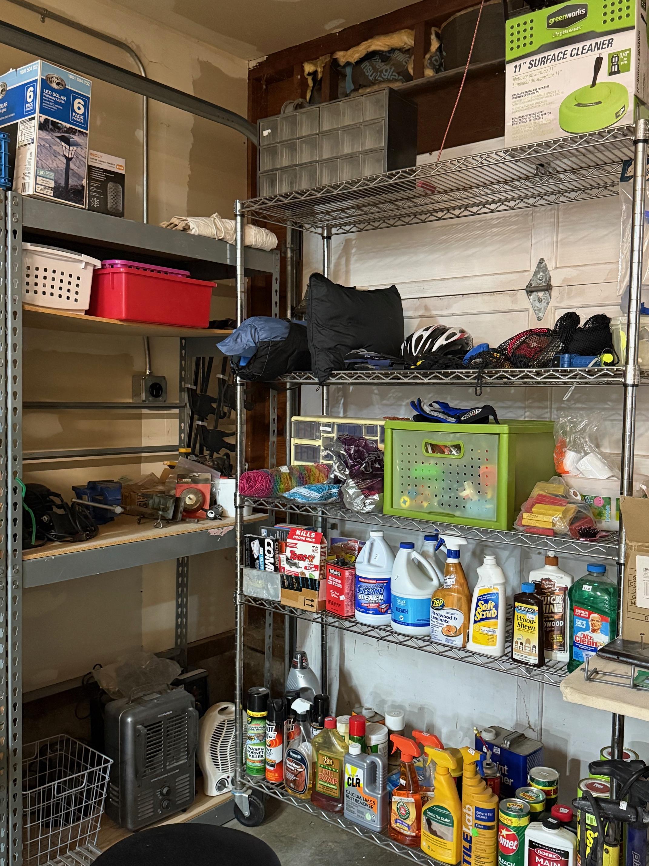 The garage is a feast for shopping! Tools, more storage, tables, hundreds of new moving boxes and moving blankets. Heavy metal Racking.