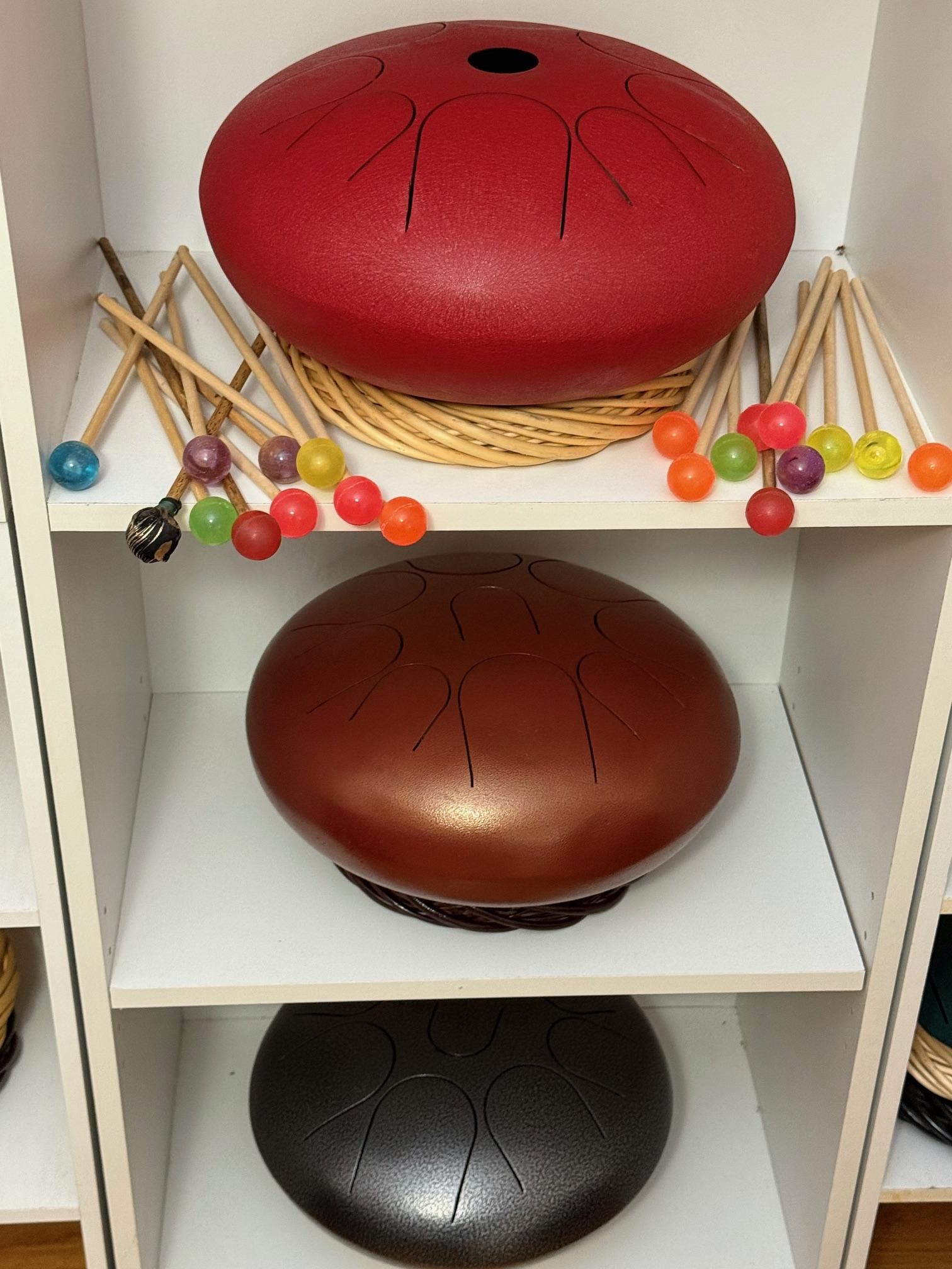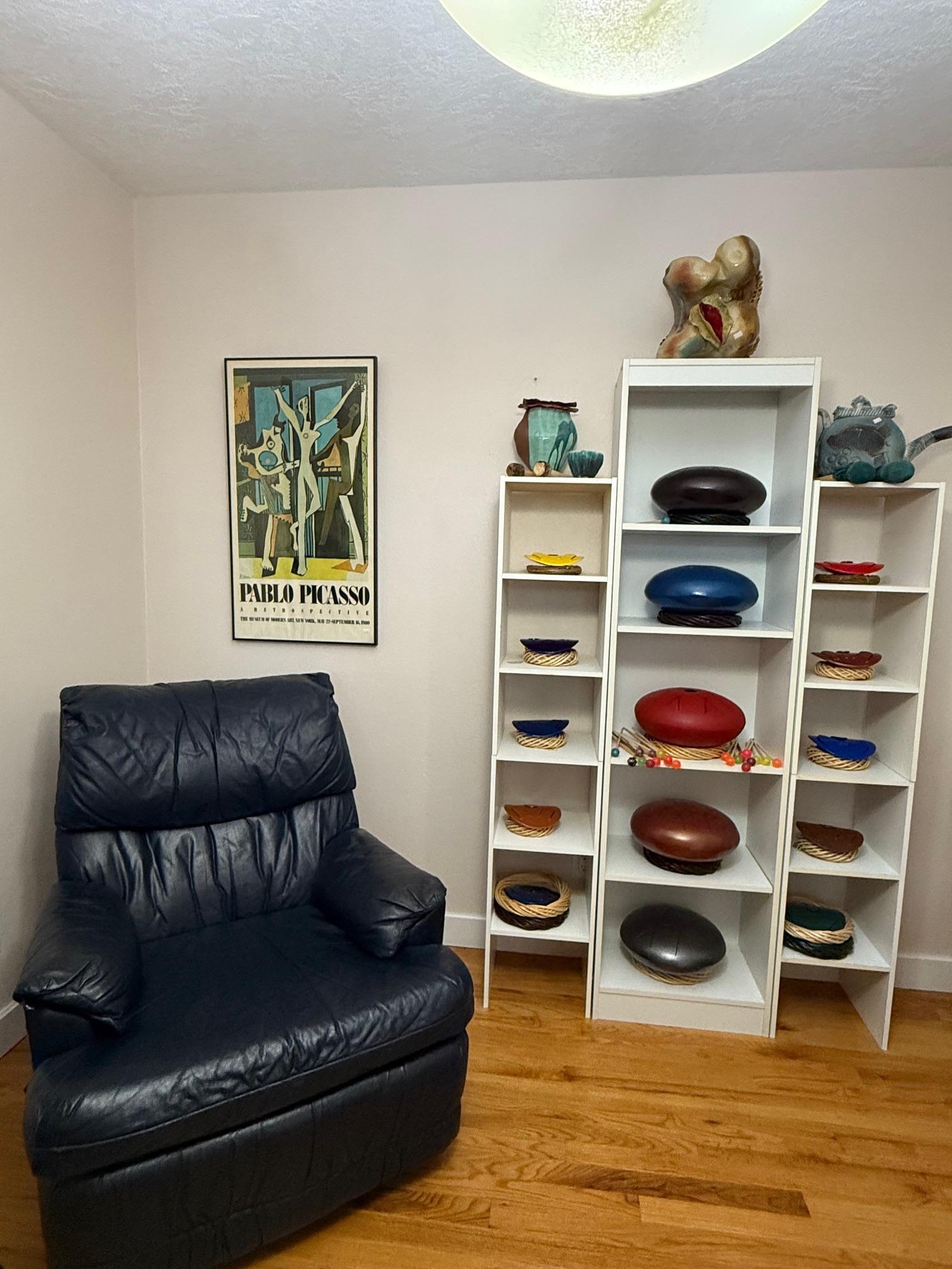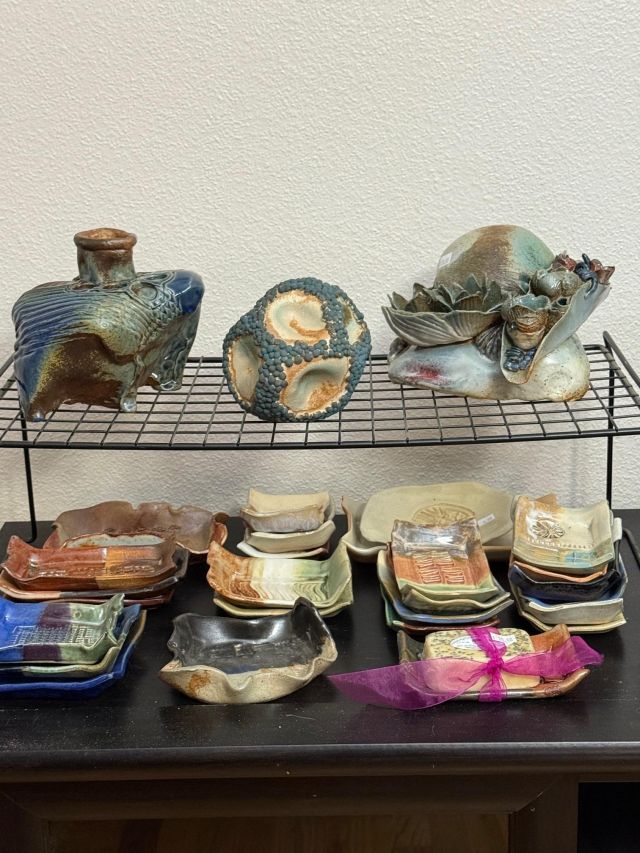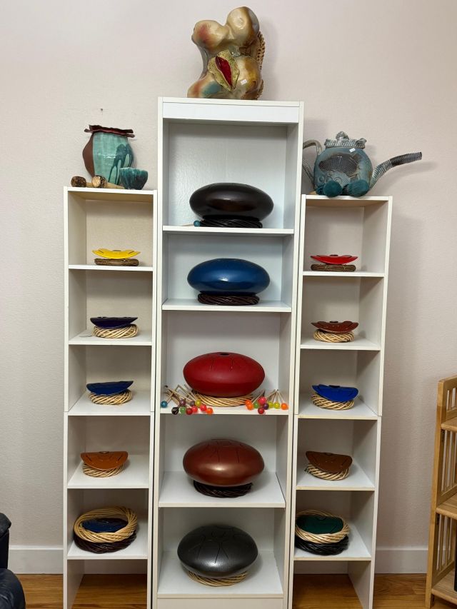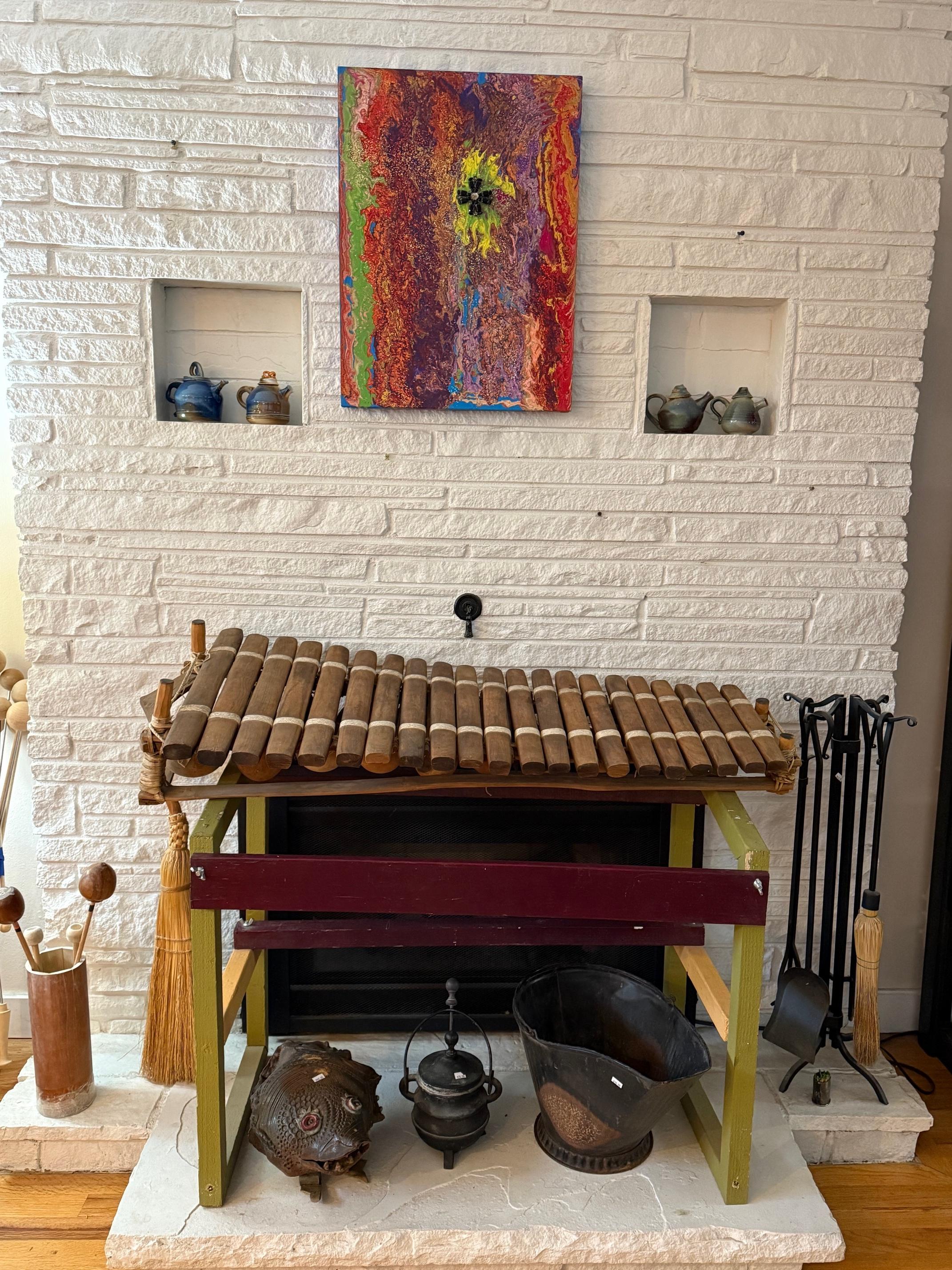 Tongue drum collection. Colorful and the sounds are amazing. Large and small. Stunning xylophone …with stand. Pottery to surround it all. Accomplished potter left loads of pieces and variety.
