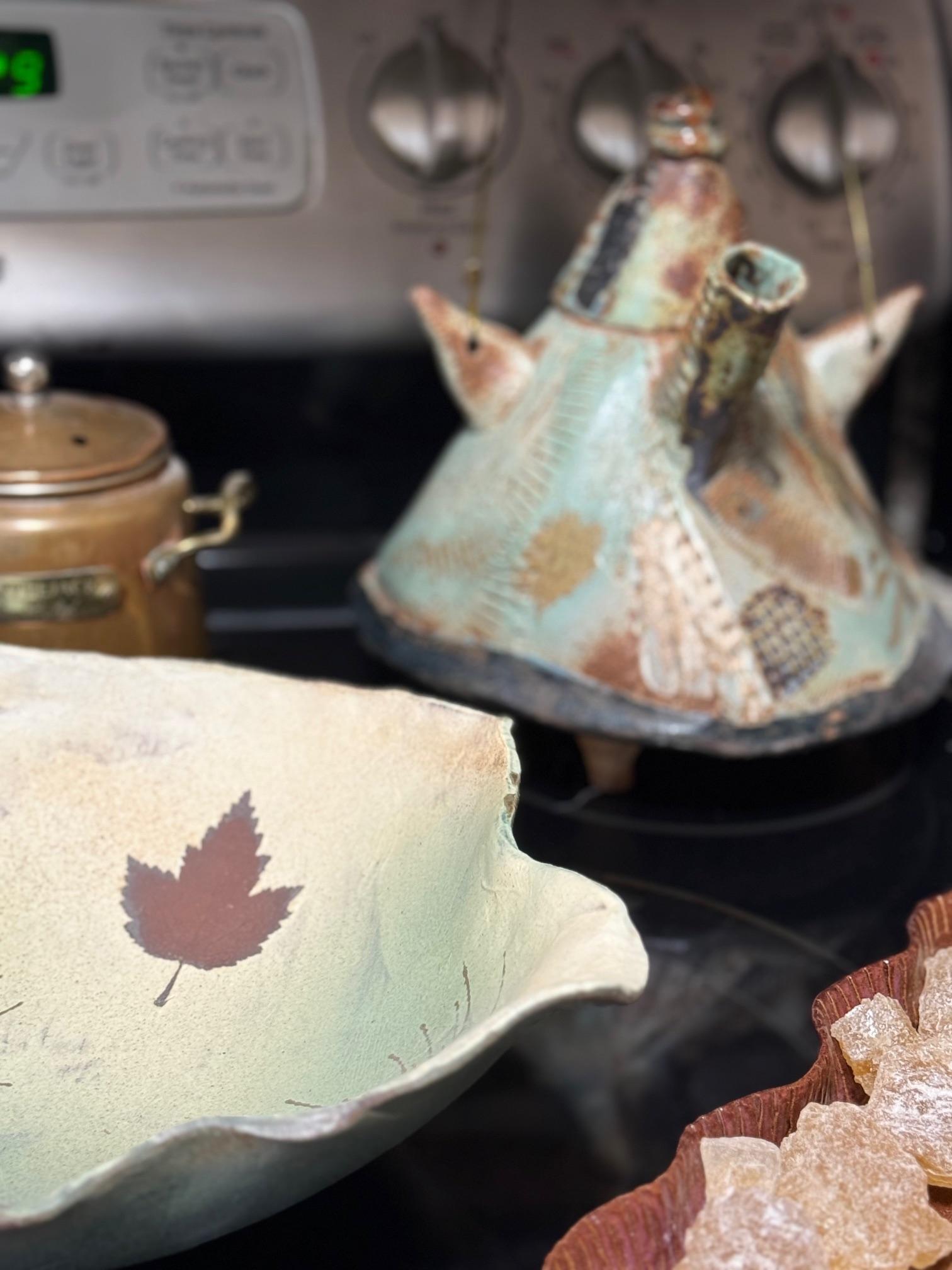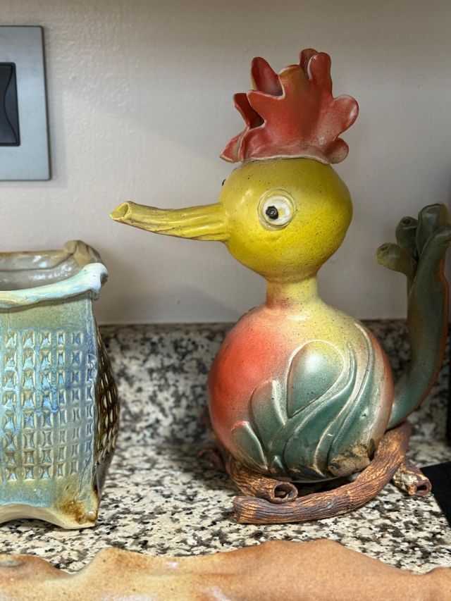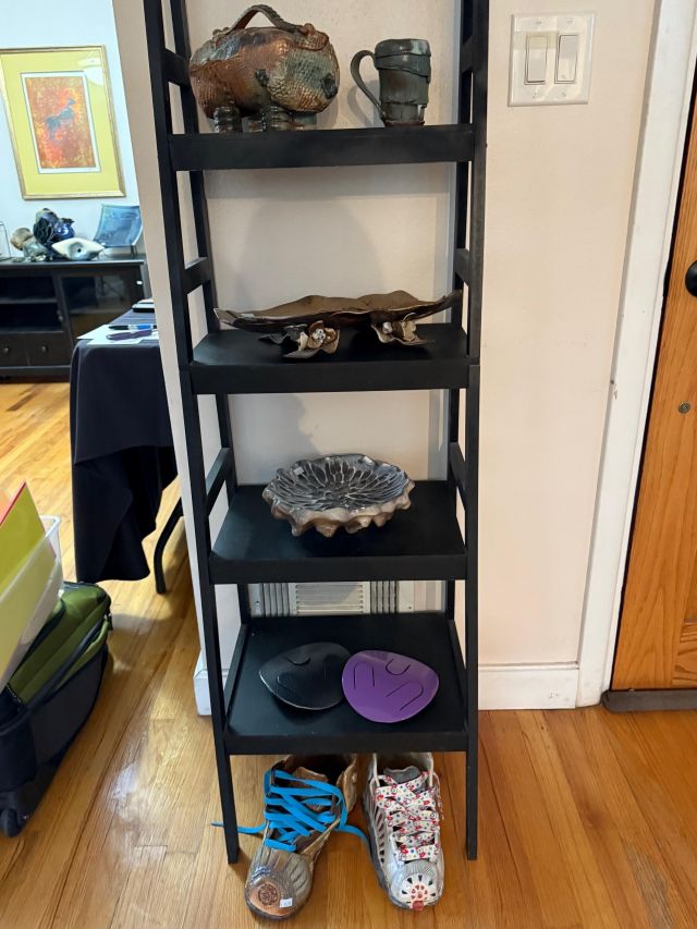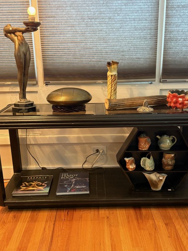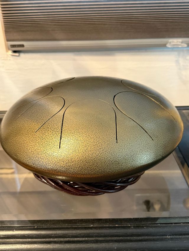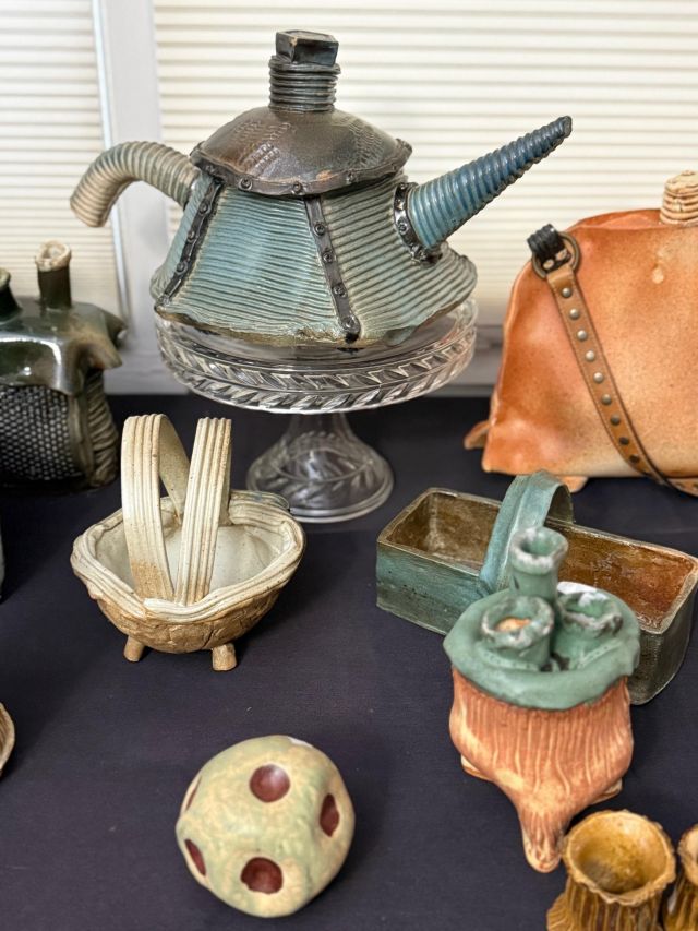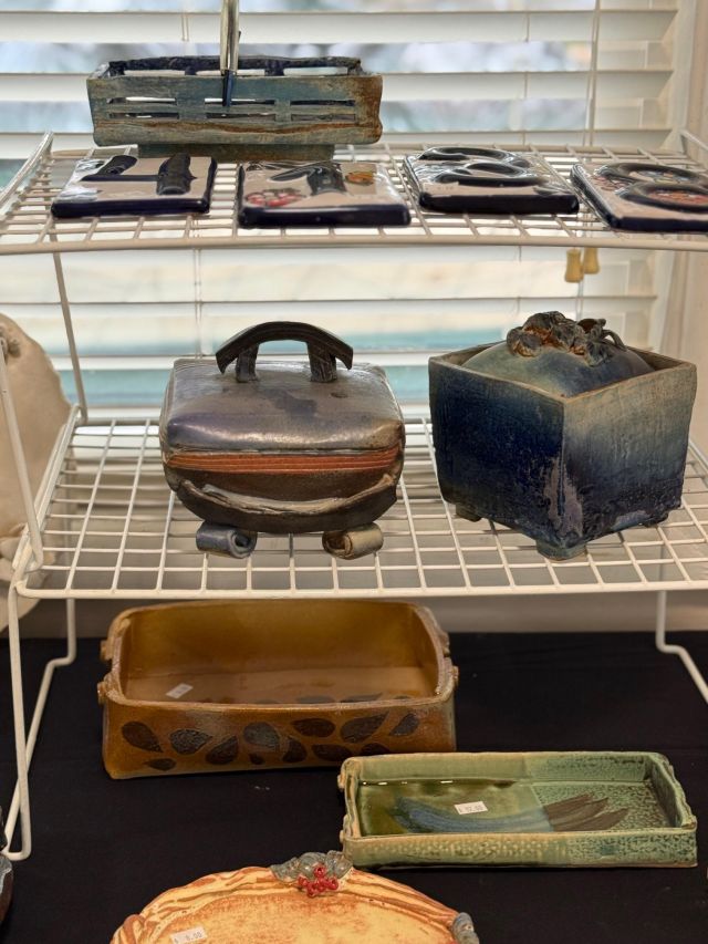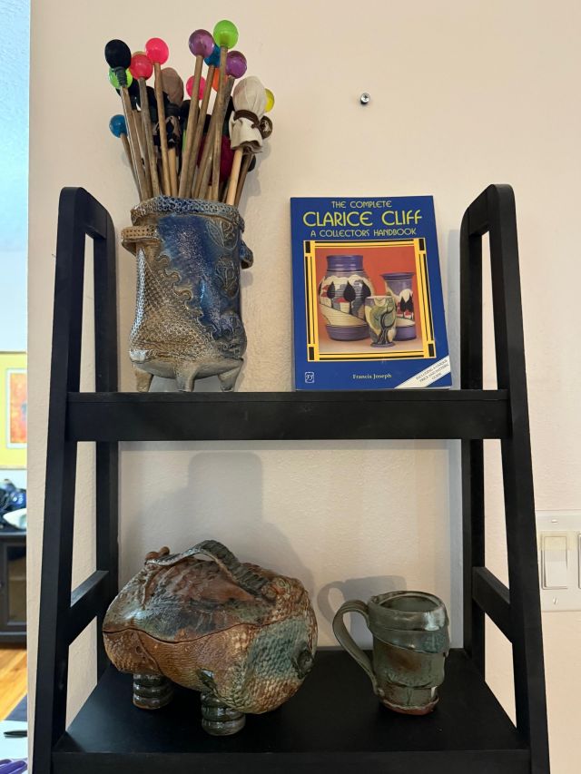 Tongue drum collection. Colorful and the sounds are amazing. Large and small. Stunning xylophone …with stand. Pottery to surround it all. Accomplished potter left loads of pieces and variety.