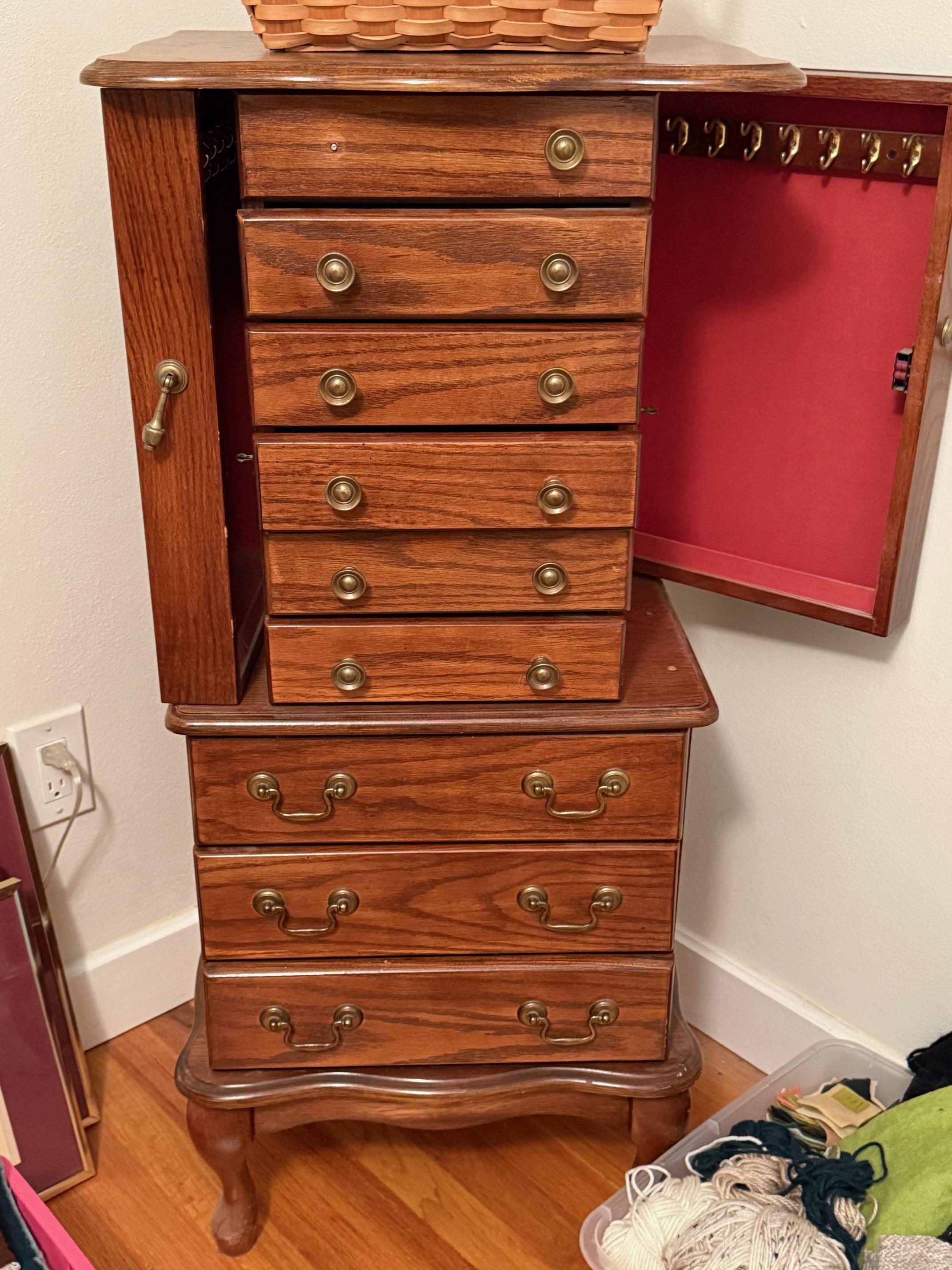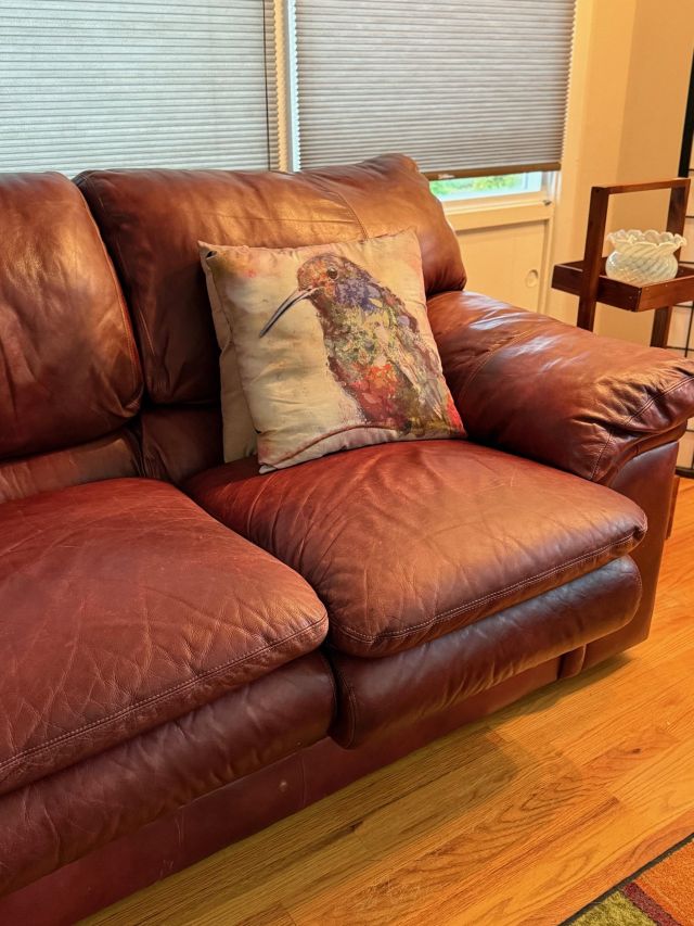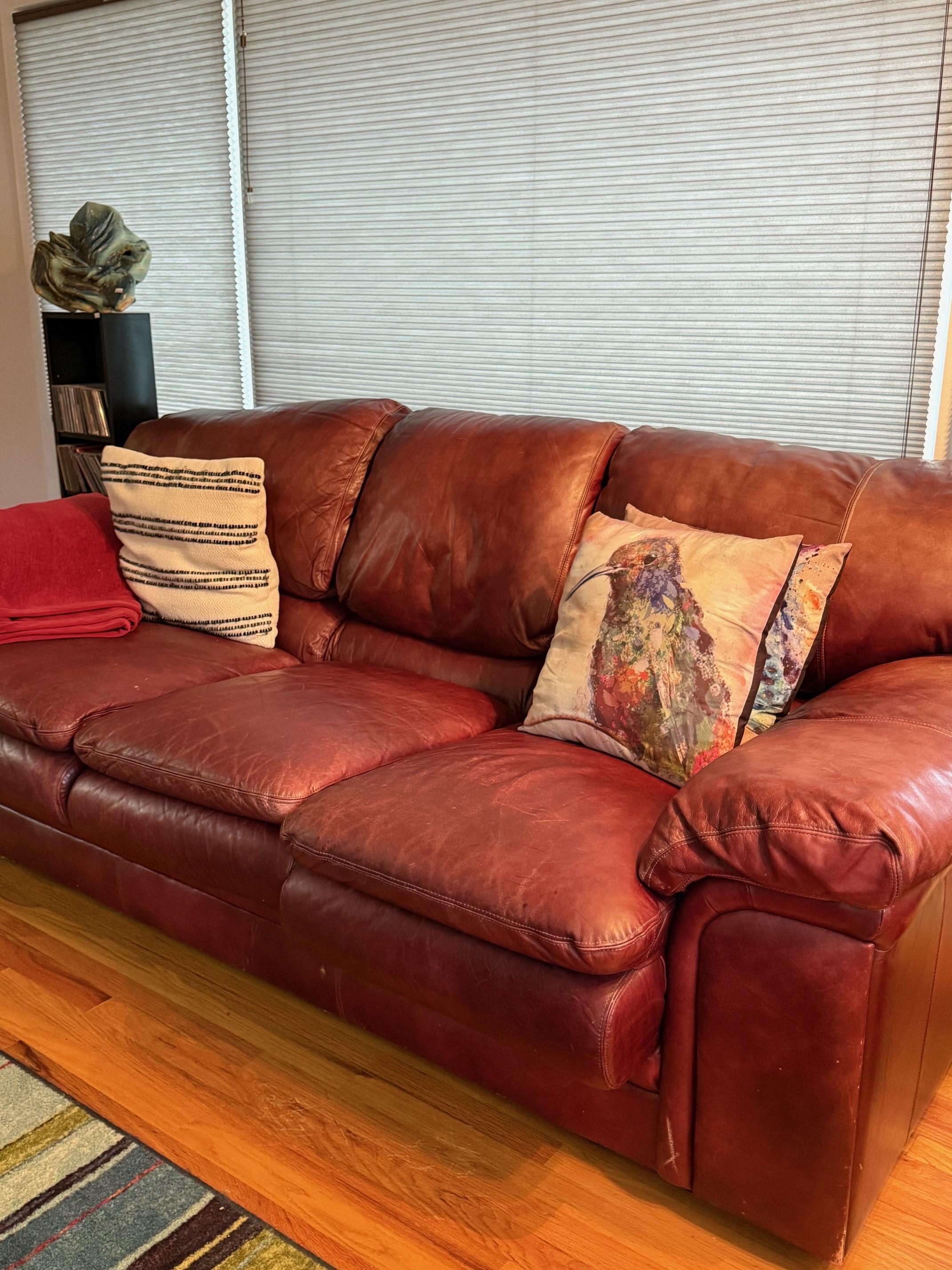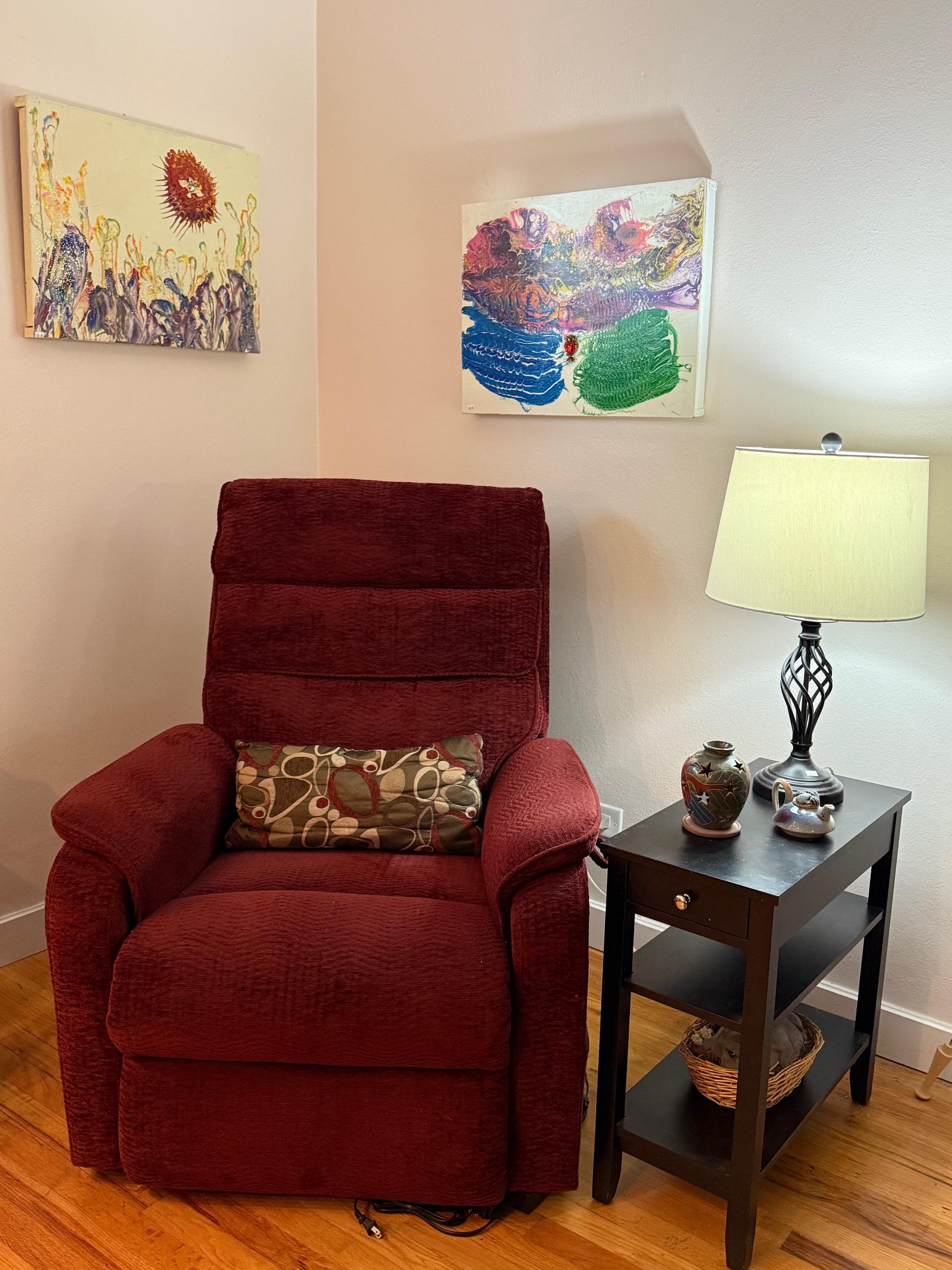 Comfiest lift chair. Red leather sofa, navy recliner. Complete Art Deco waterfall bedroom suite. Dressers, bed, chest, desk and mirrors. Queen mattress. Storage for anything! Clothes, shoes, racks and cubbies.