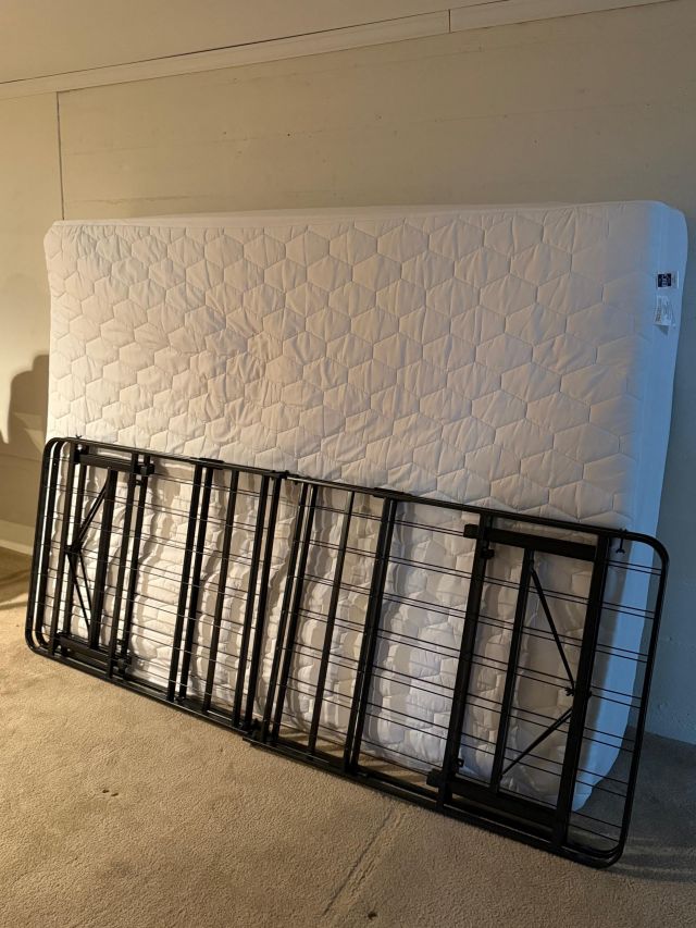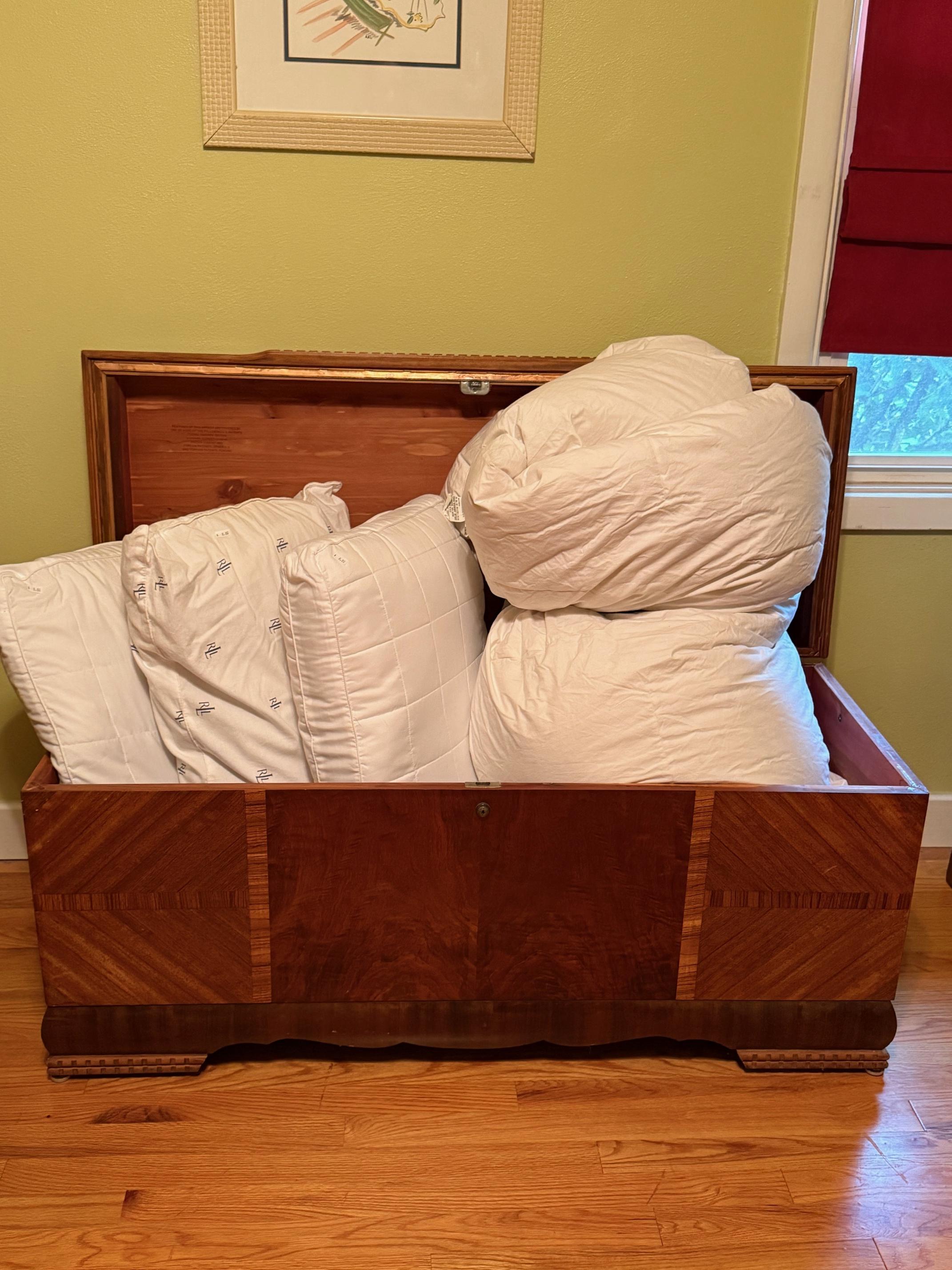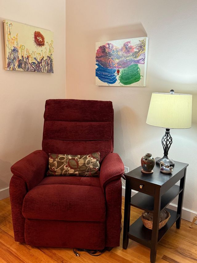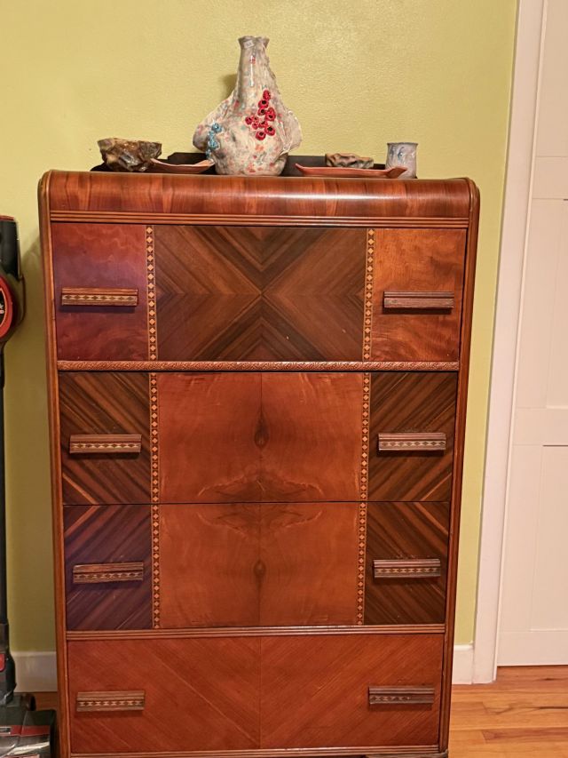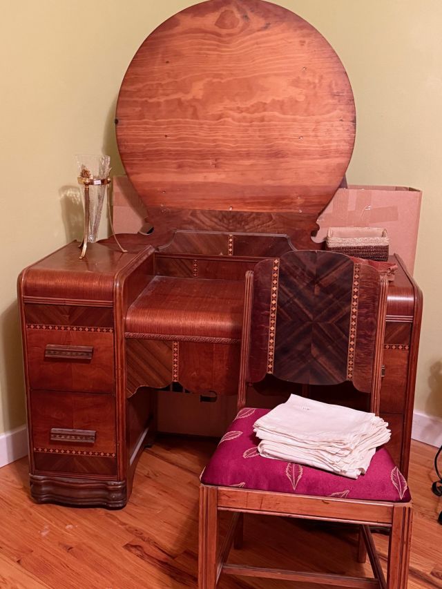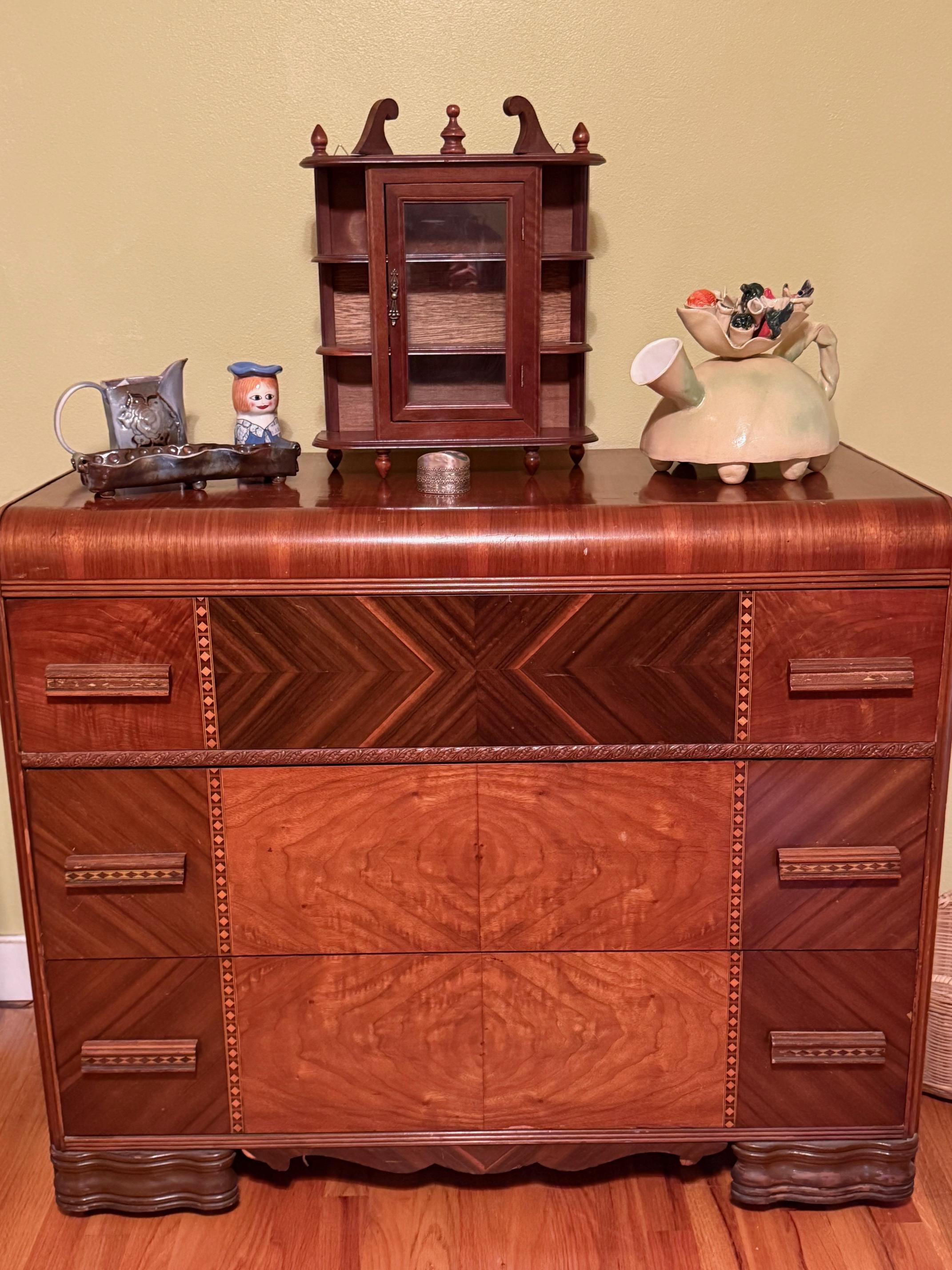 Comfiest lift chair. Red leather sofa, navy recliner. Complete Art Deco waterfall bedroom suite. Dressers, bed, chest, desk and mirrors. Queen mattress. Storage for anything! Clothes, shoes, racks and cubbies.