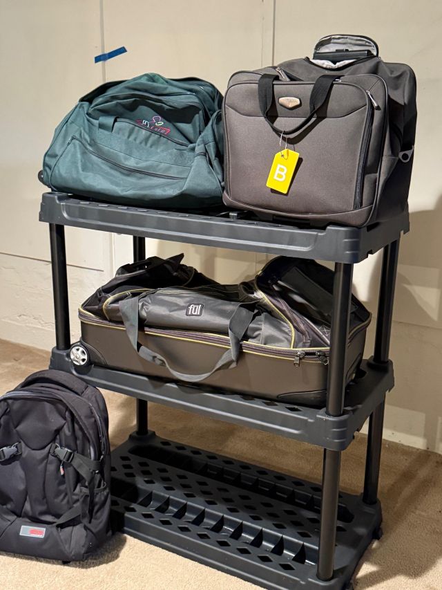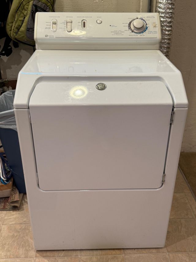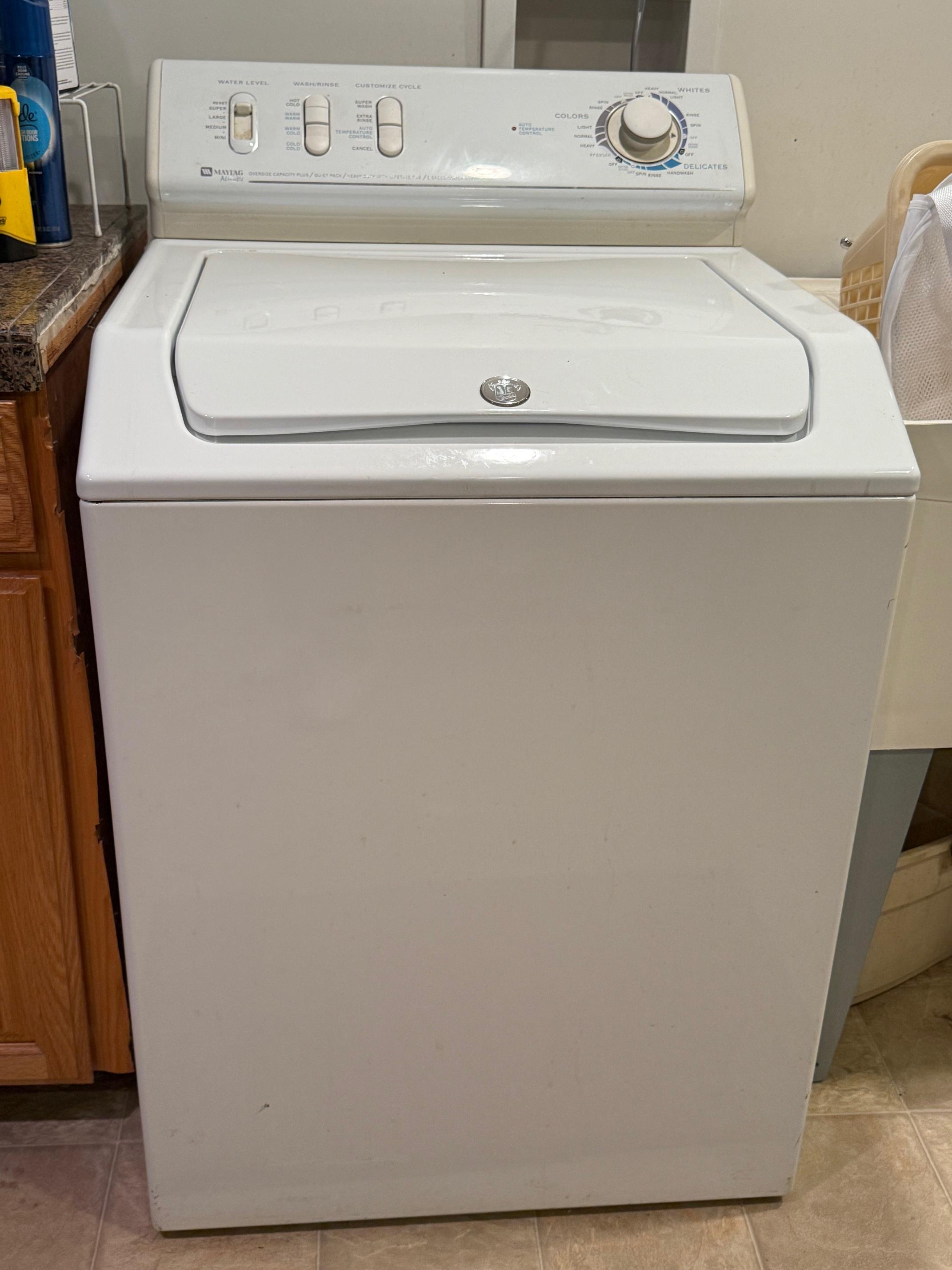 Fridge, Maytag washer and dryer. Luggage, backpacks.
