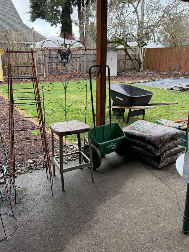 And outside! Garden goods. Wheelbarrow, yard art.