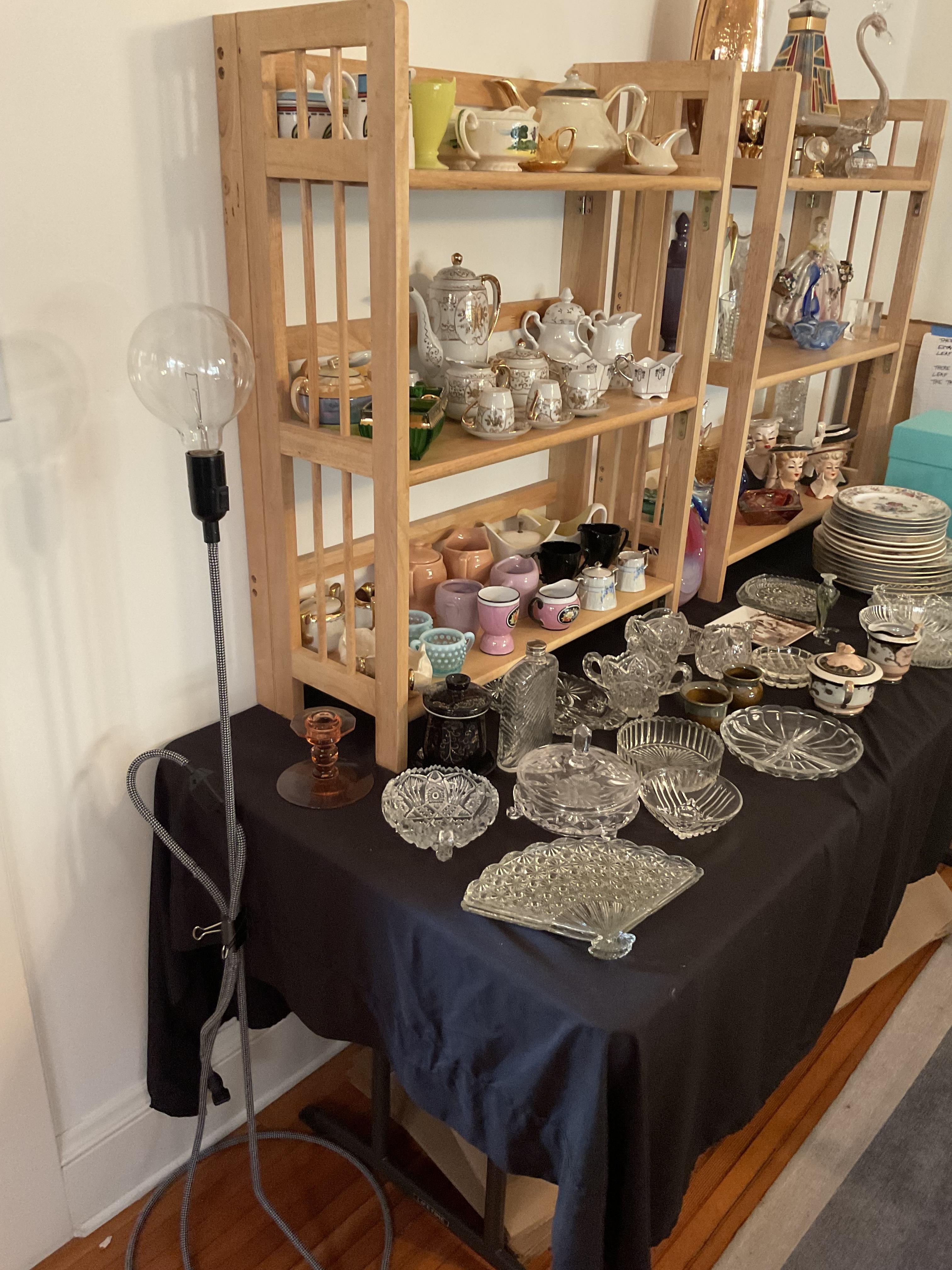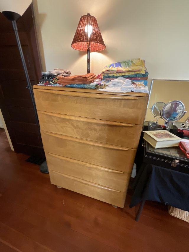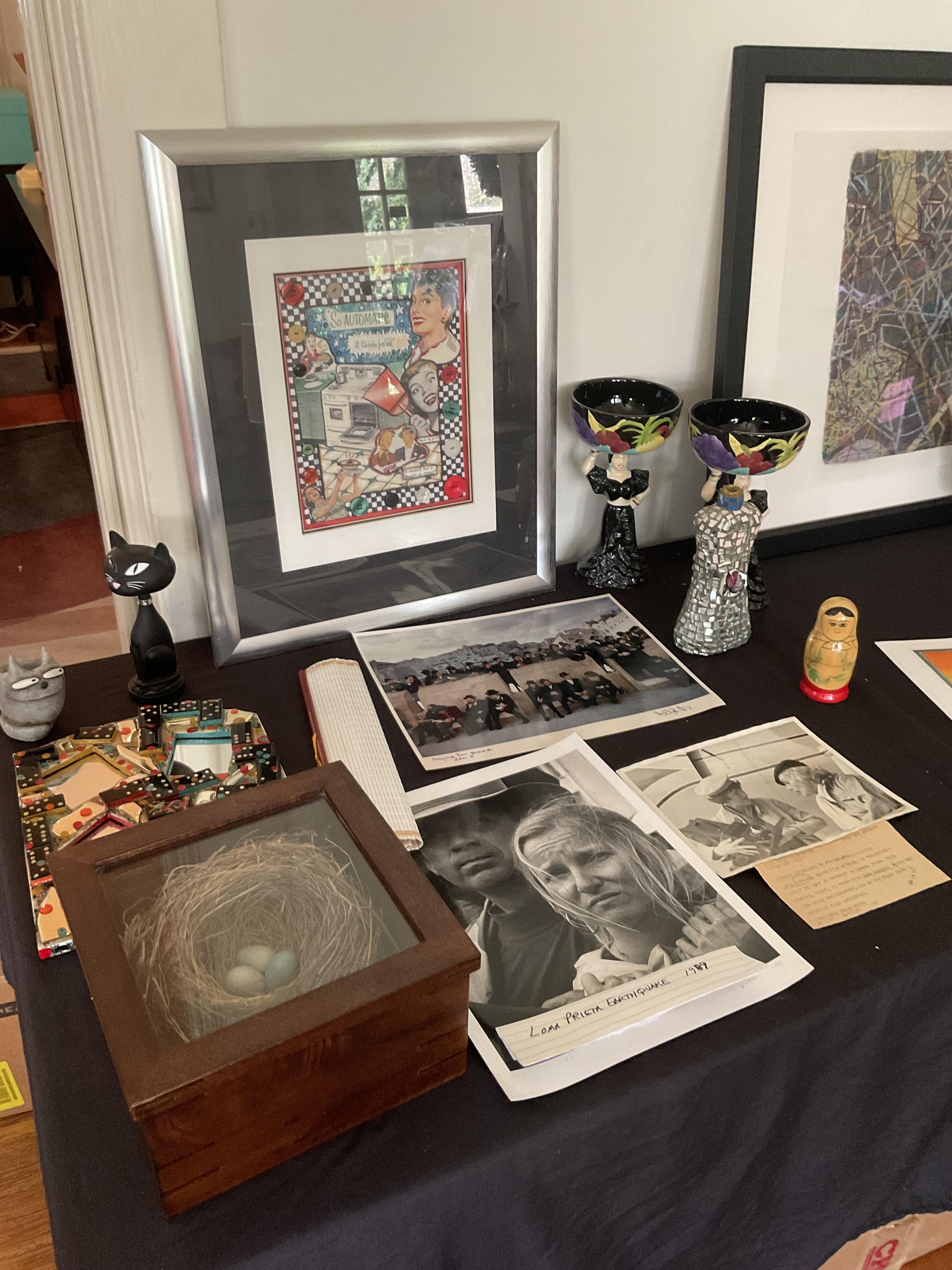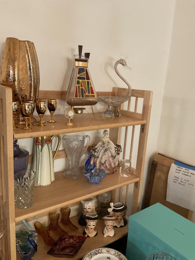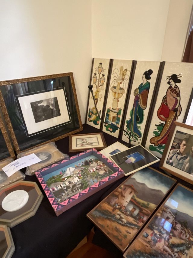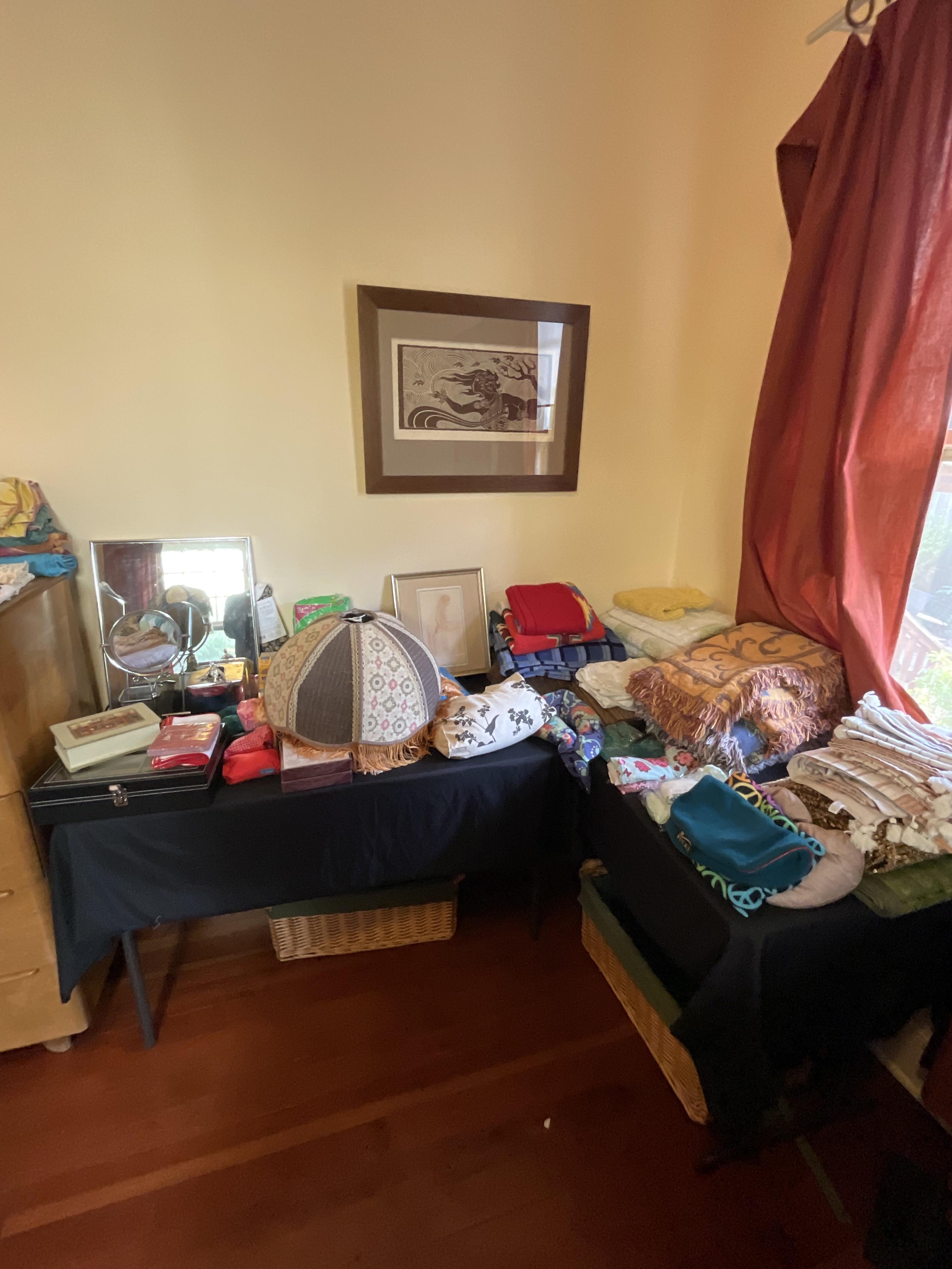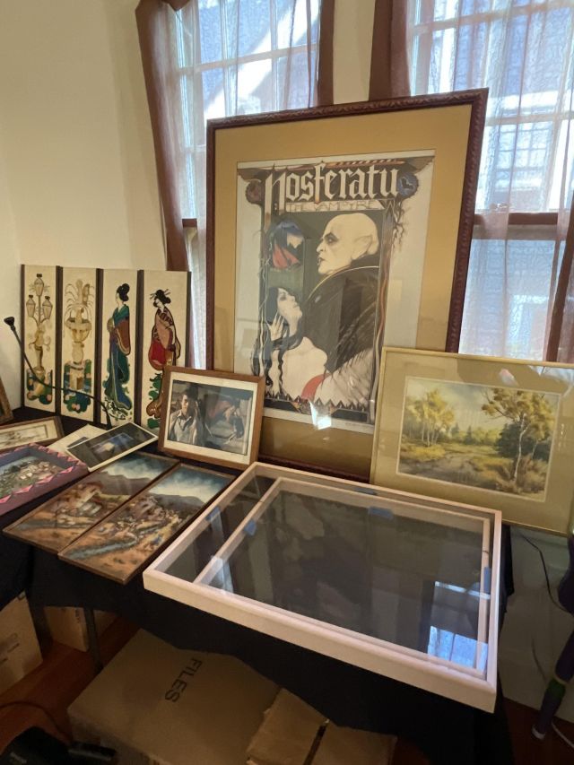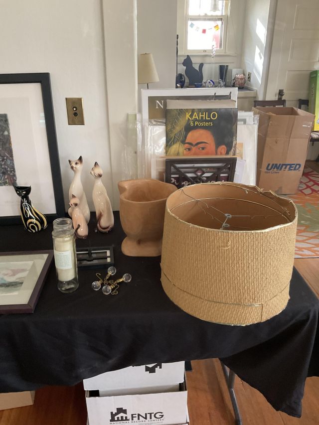 This week’s sale is a collector’s dream and located in a beautiful NE Portland craftsman home. As you can see from the photos provided, this house is packed with treasures. There is a very nice collection of furniture including a BRAND NEW CUSTOM BILTWELL couch, a Haywood Wakefield bedroom set, a beautiful five piece bookcase, antique telephone gossip chairs, a nice Duncan Phyfe style dining table with six chairs, leather chairs, occasional chairs, a queen size bed with side tables and matching dressers, a butcher block rolling cart, a beautiful mid-century serving cart, tons of lamps, rugs, home decor and so much more. There are a variety of kitchen appliances, pots and pans, cast iron pieces, two sets of Fiesta Ware, Ruby depression glass, a large collection of cream and sugar bowls, Haviland porcelain pieces, framed Limoges cameos, a Tigris Cat Vase by Anneleise Beckh, mid-century wall clocks and a variety of other collectable pieces, There is an extremely large collection of art pieces in this sale including pieces by Portland artist Chris Haberman, Navajo artist Ben Halwood, Samyak Yamauchi, Joe Zingaro and a monumental painting of the Statue of Liberty by Jean Francois (see his videos on You Tube). We also have one of the largest collection of albums that we have ever had in a sale. If you collect vinyl you need to come check out this collection. There is also a very nice selection of modern and vintage books. Also included in the sale is one of the nicest collections of women’s clothes (both casual and business attire), shoes, scarves, purses etc as well as a number of designer eye glass frames. Outside you will find some nice outdoor furniture, lawn care items, items for your pet, a very large unique concrete statue, and several bikes, including a vintage Schwinn (Peewee Herman style bike).