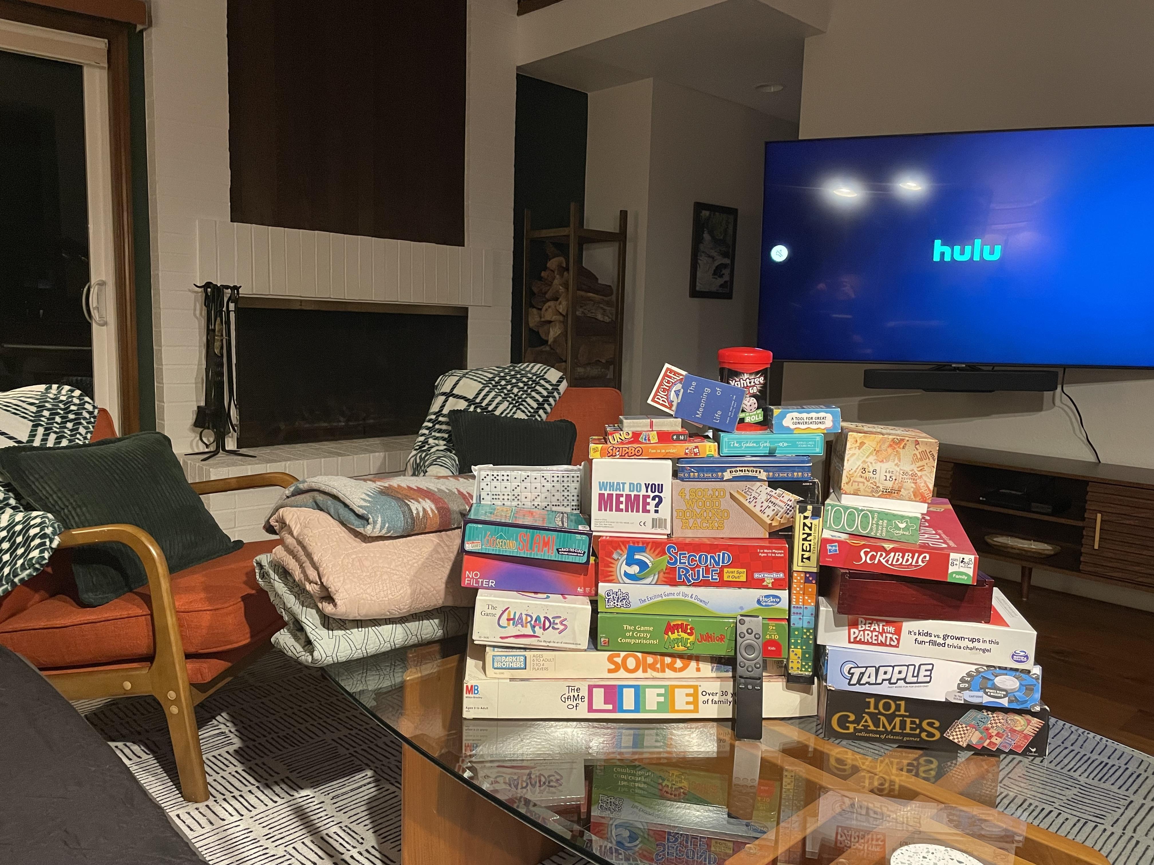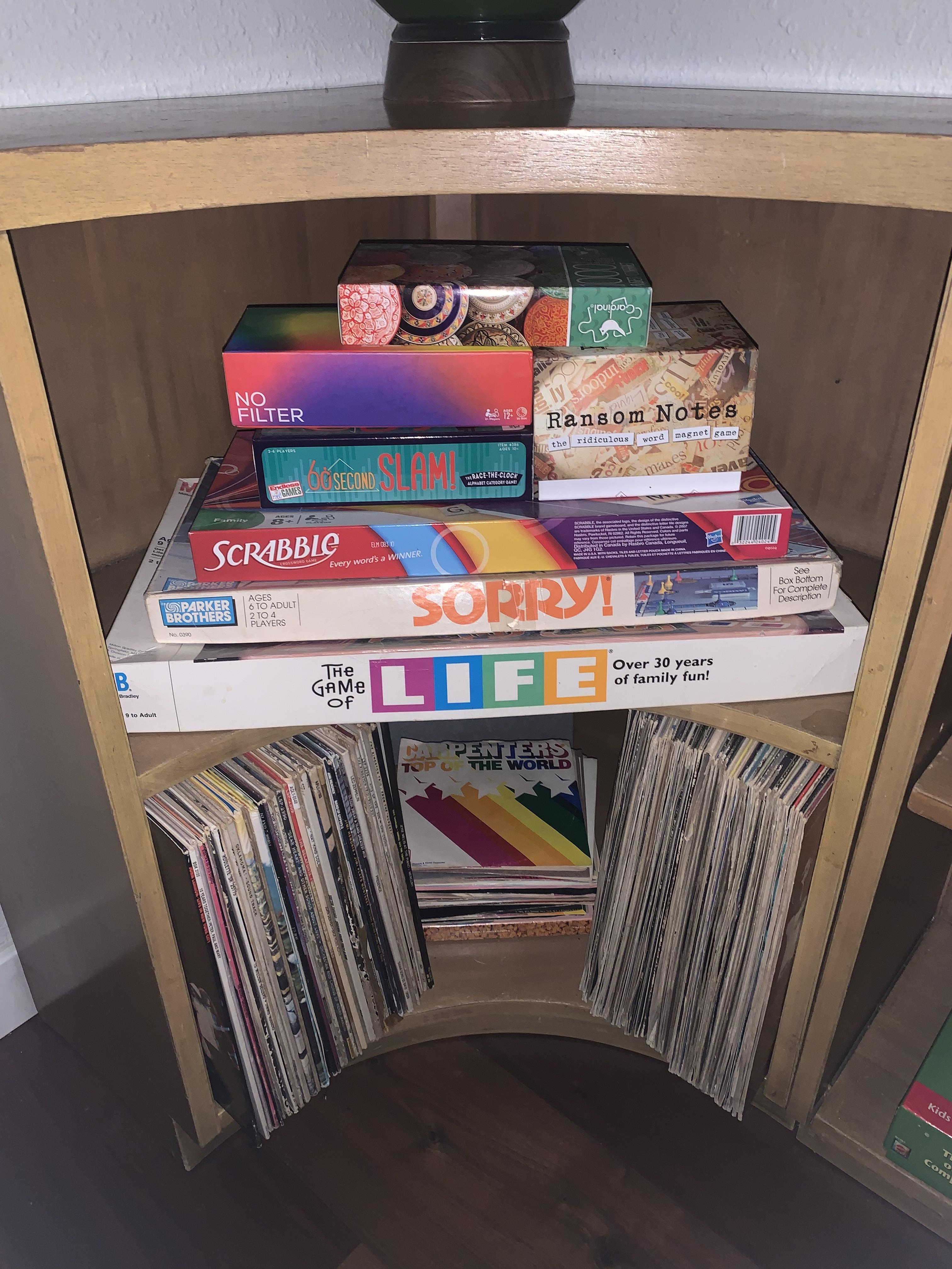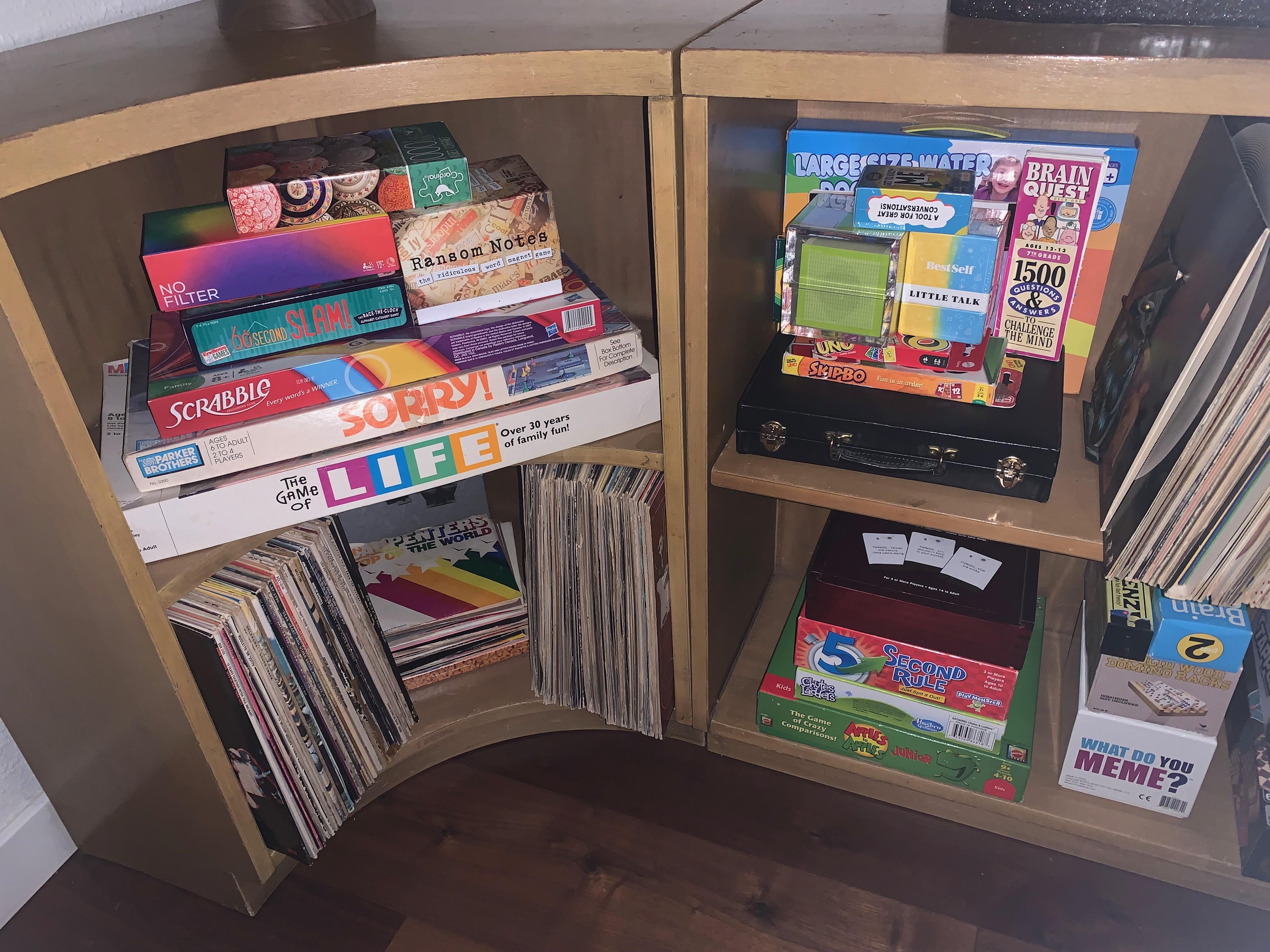 Large collection of Vinyl records, board games, yard games (cornhole), kids’ dishware and more
