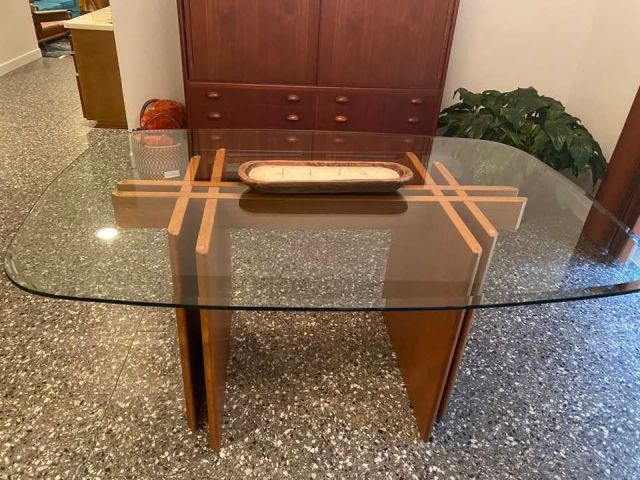 Glass + Teak Dining Table & 4 teak chairs: 62" × 42" × 28.5" H