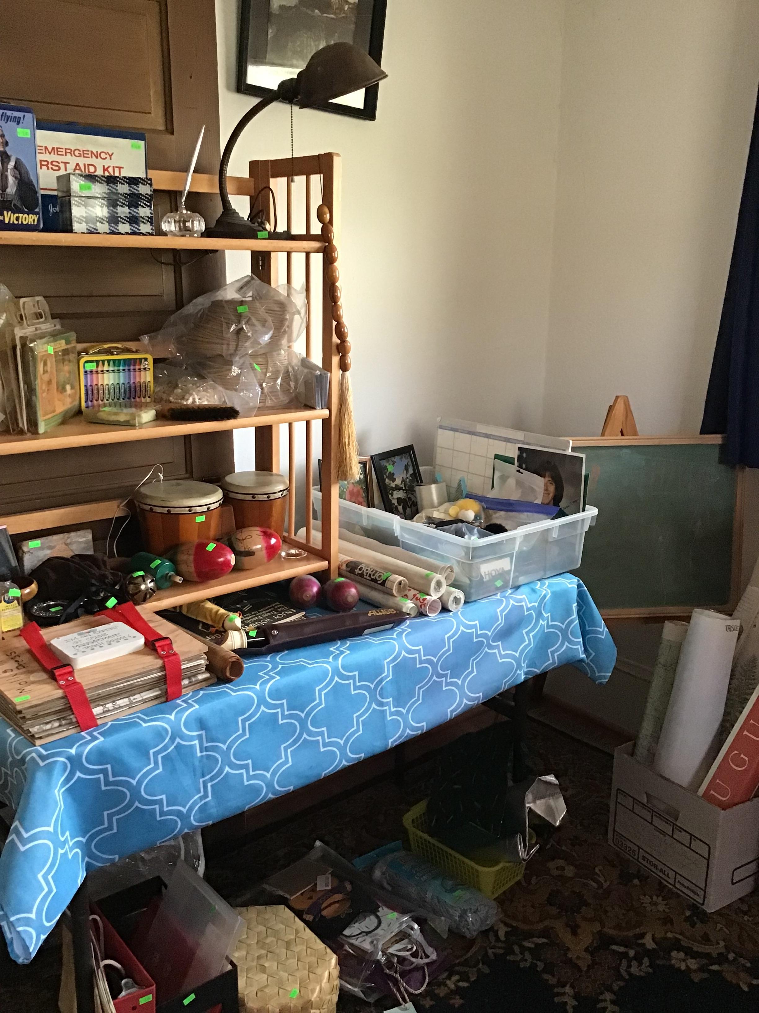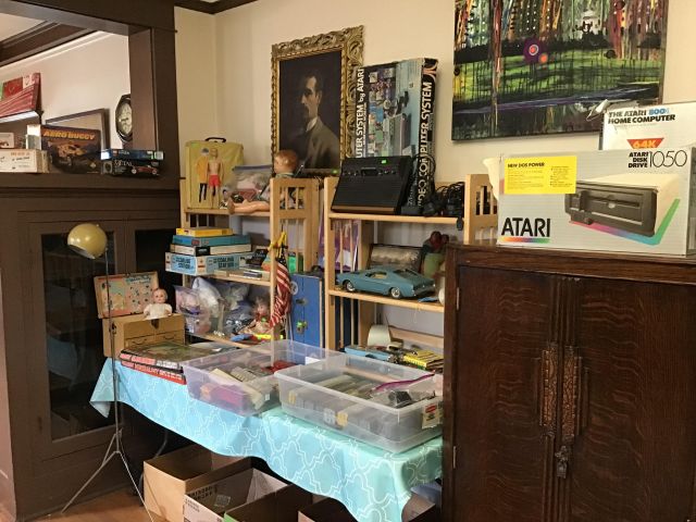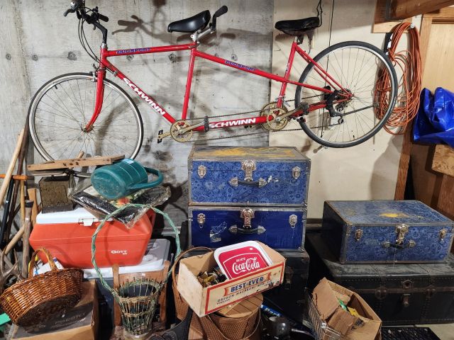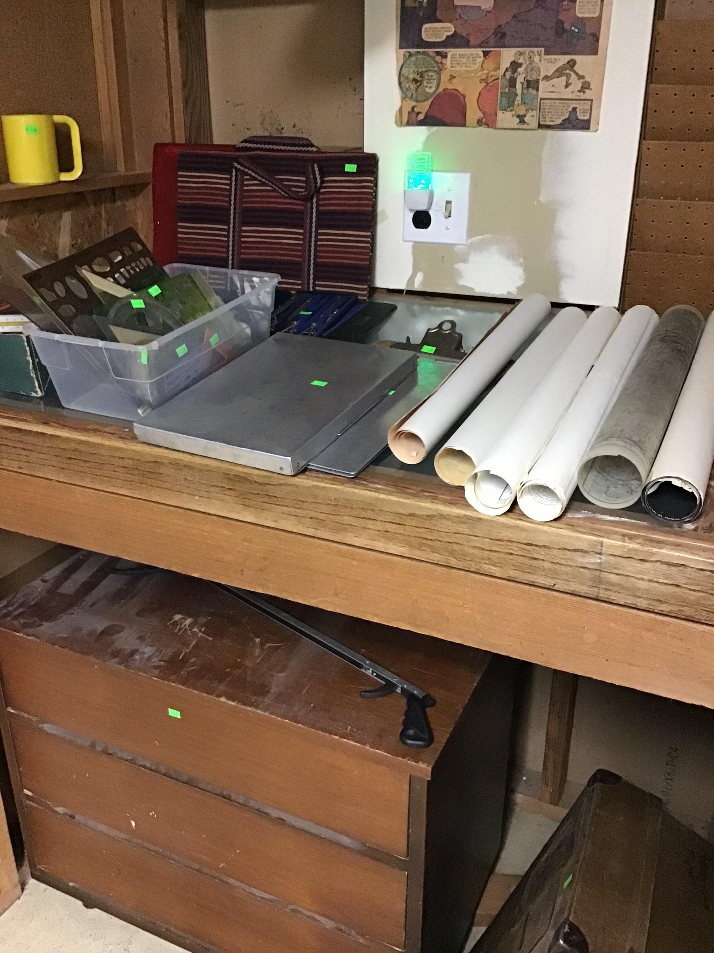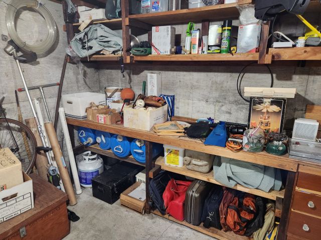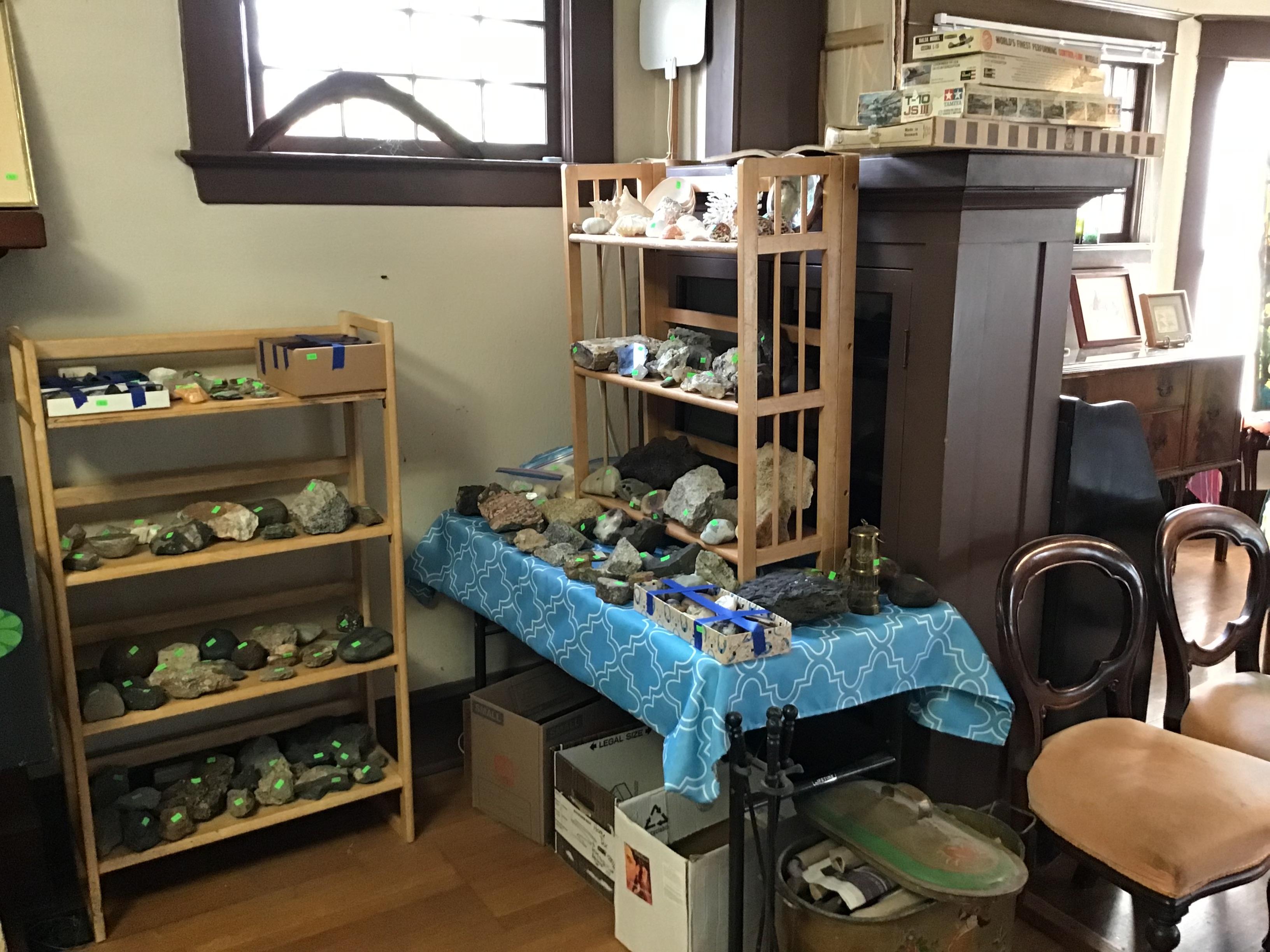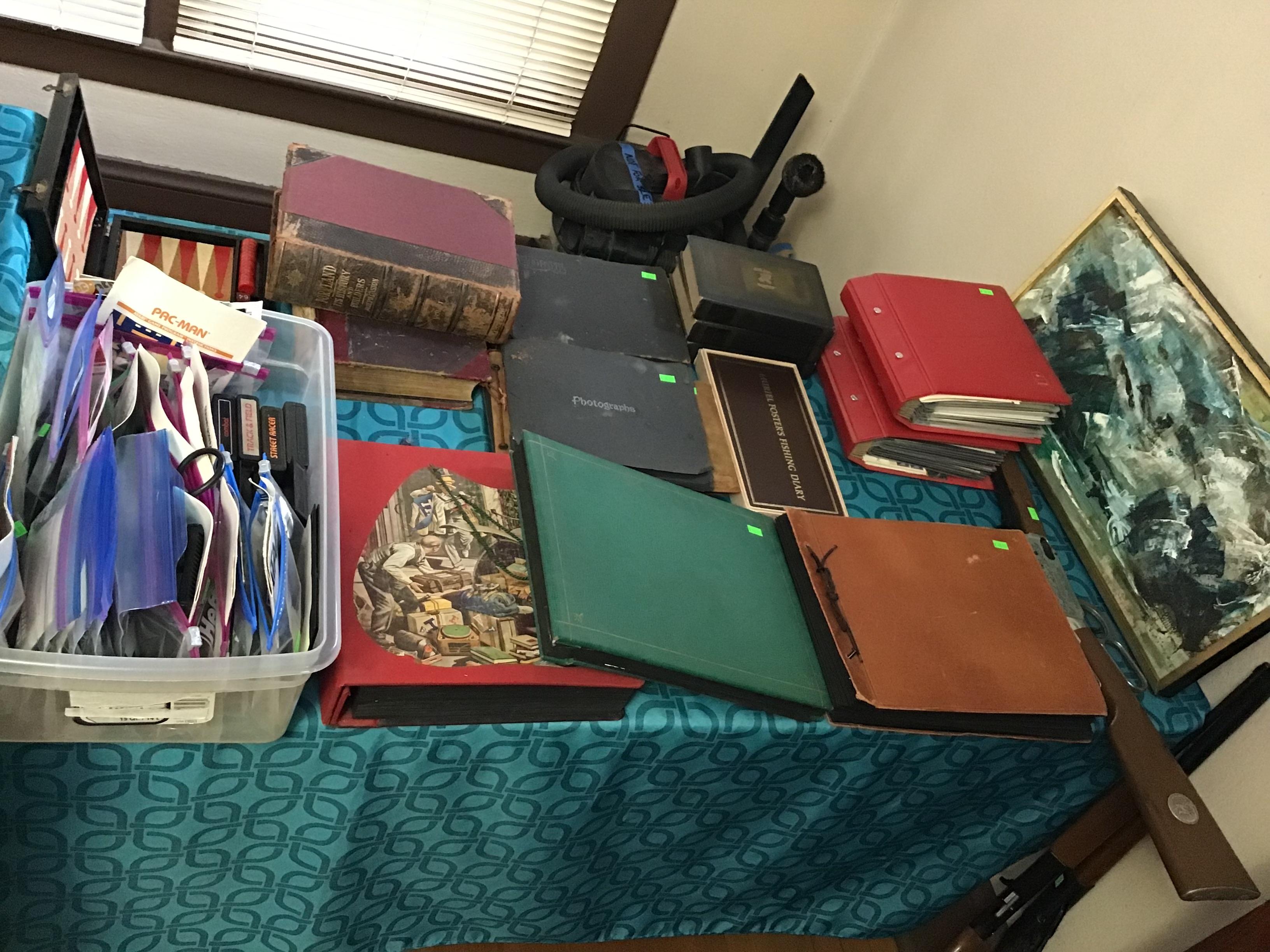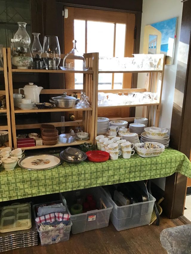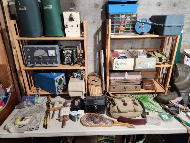 Antique furniture including dresser with mirror, cabinet, wardrobe, dining table, miscellaneous chairs, sideboards, cabinets, Also there’s glassware, kitchenware including pots and pans, utensils, small appliances, records, cds, artwork and prints, ephemera, old photo albums and scrapbooks, posters, rock collection, tons of office supplies, lots of maps, boardgames, electronics, entire workshop full of hand and power tools, camping equipment, model airplanes, radio controlled airplanes, clothing and accessories, linens, some holiday decor, bbq, patio furniture, household products, and much more.