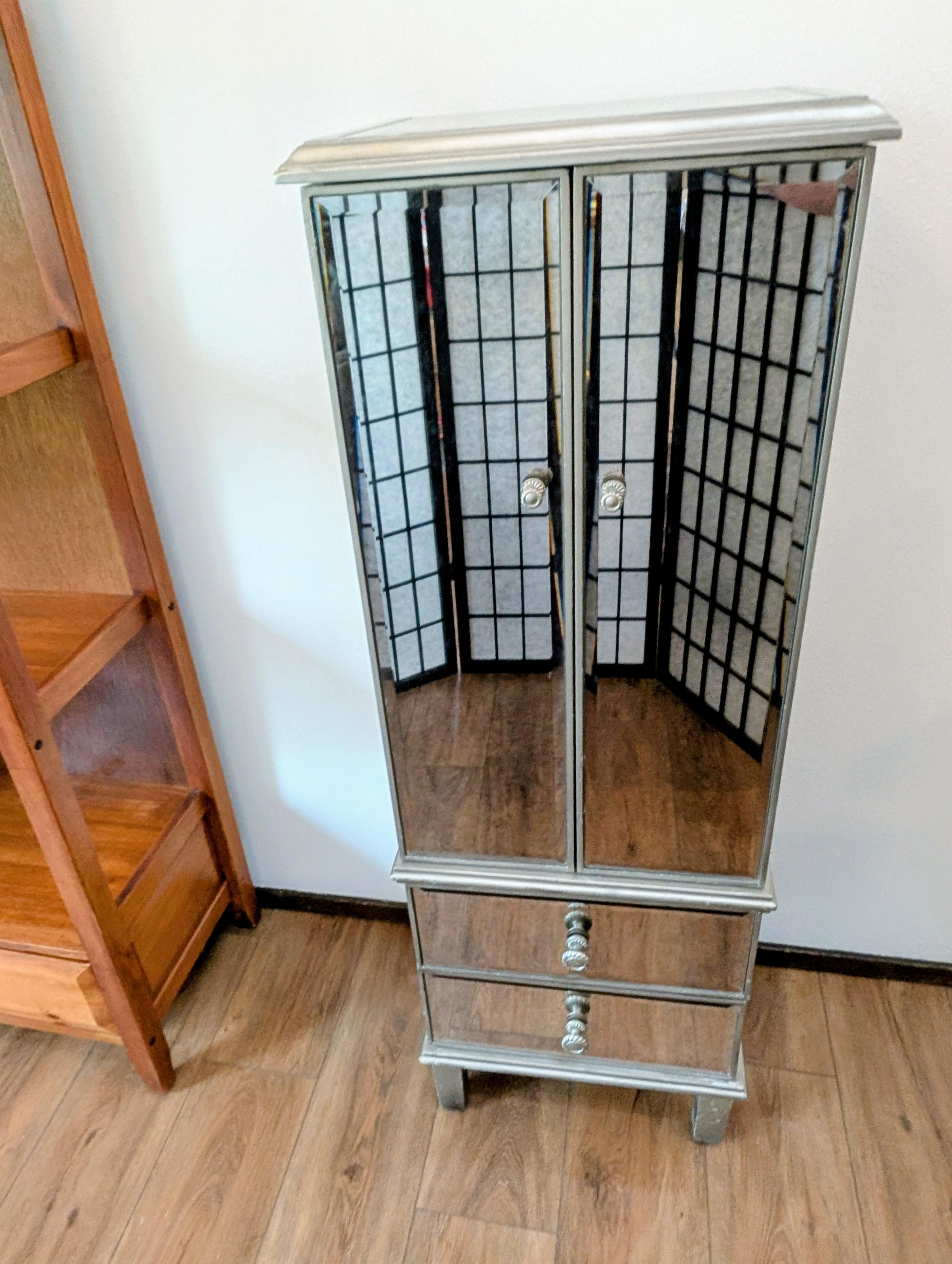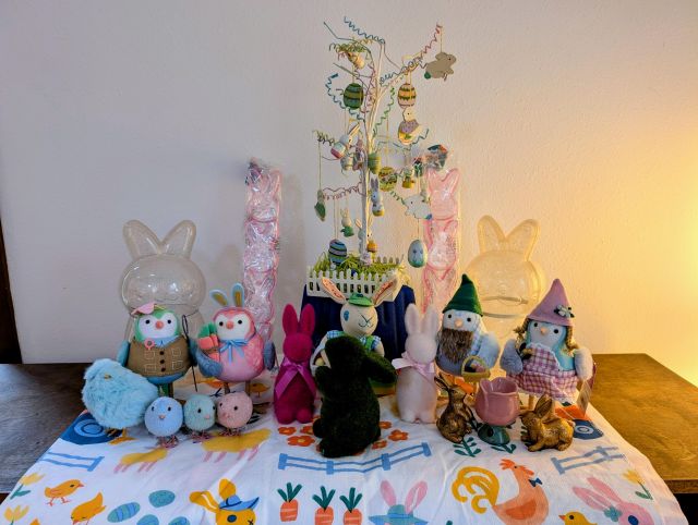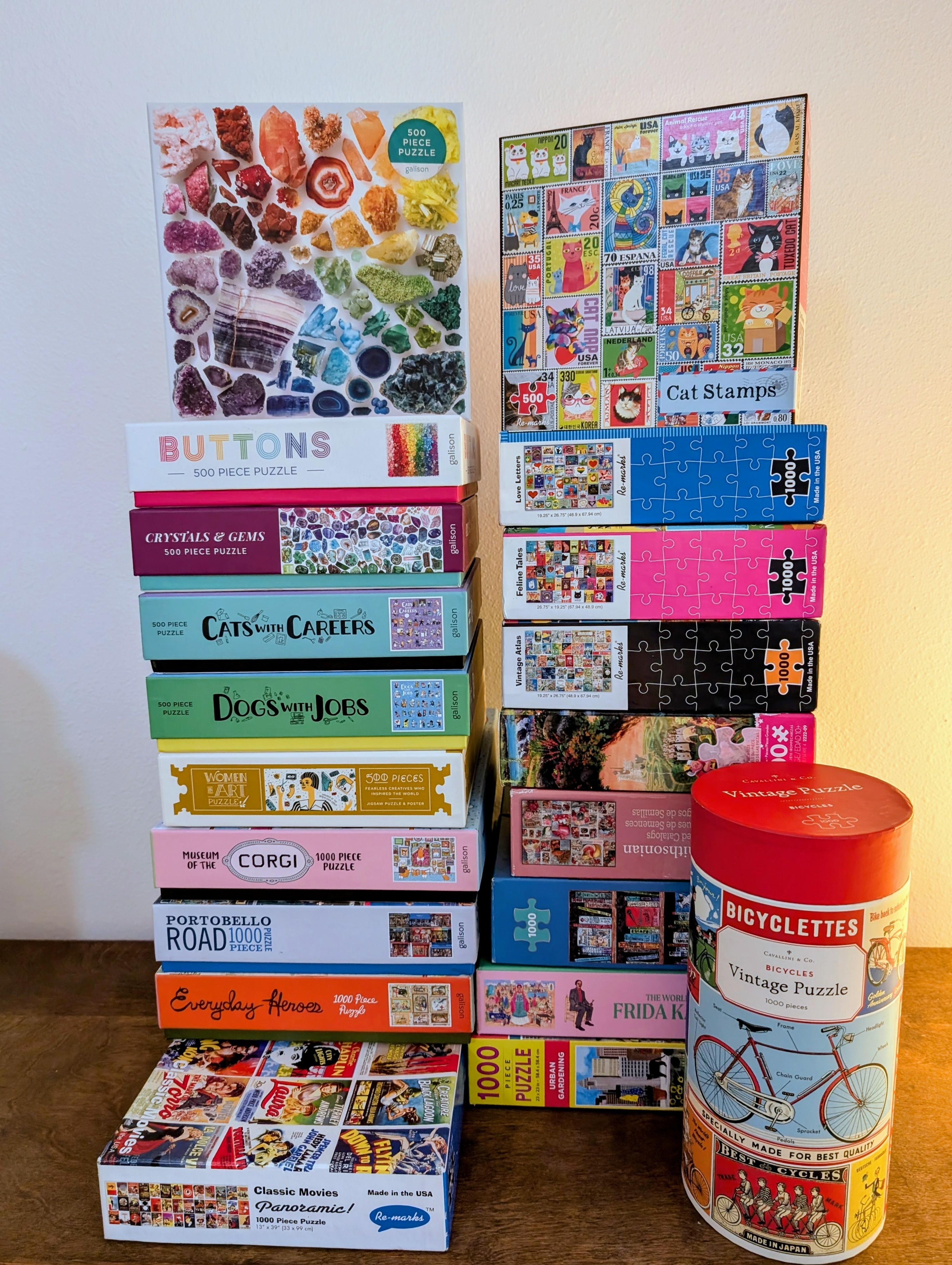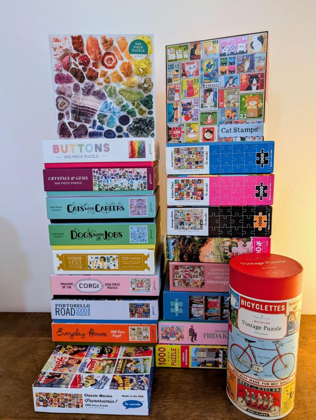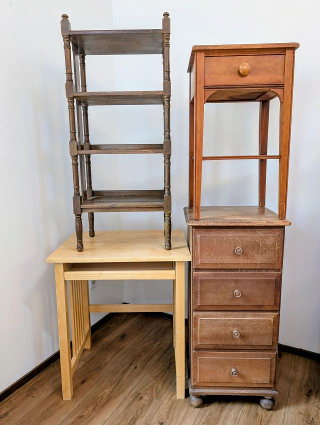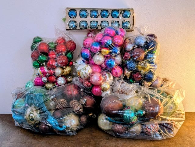1960s-1990s jazz and rock Records; newer & vintage Clothing in a range of sizes X-Small through Plus Sizes: blouses, skirts, jackets, coats, dresses; newer & vintage Accessories: hats, gloves, bags & purses, scarves, and shoes (in a variety of sizes); decorative figurines and dishes; newer & vintage Linens & Fabric: window curtains, quilts, throw pillows, aprons, towels, tablecloths, napkins and fabric; vintage Vanity Items: powder boxes, compacts, perfume bottles; vintage Furniture: glamorous mirrored tall free standing jewelry case, wood and glass standing display case, wooden bookcases, wooden stand, wooden chest of drawers, wooden computer desk; Holiday Decor: newer Easter/Spring decor items, and newer and vintage glass Christmas ornaments in an array of colors; Stationery: greeting cards, and notebooks; Jigsaw Puzzles: 500-1,000 piece jigsaw puzzles; Kid's Books and Toys: chapter books and graphic novels, stuffed animals and various toys; new in box Picture frames and vintage picture frames; decorative boxes, storage drawers and parts cabinets, and much more!