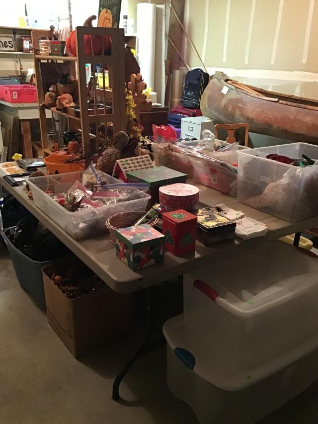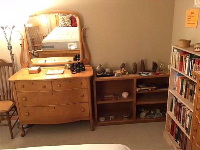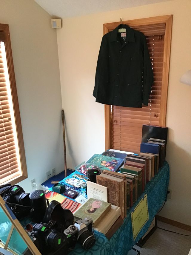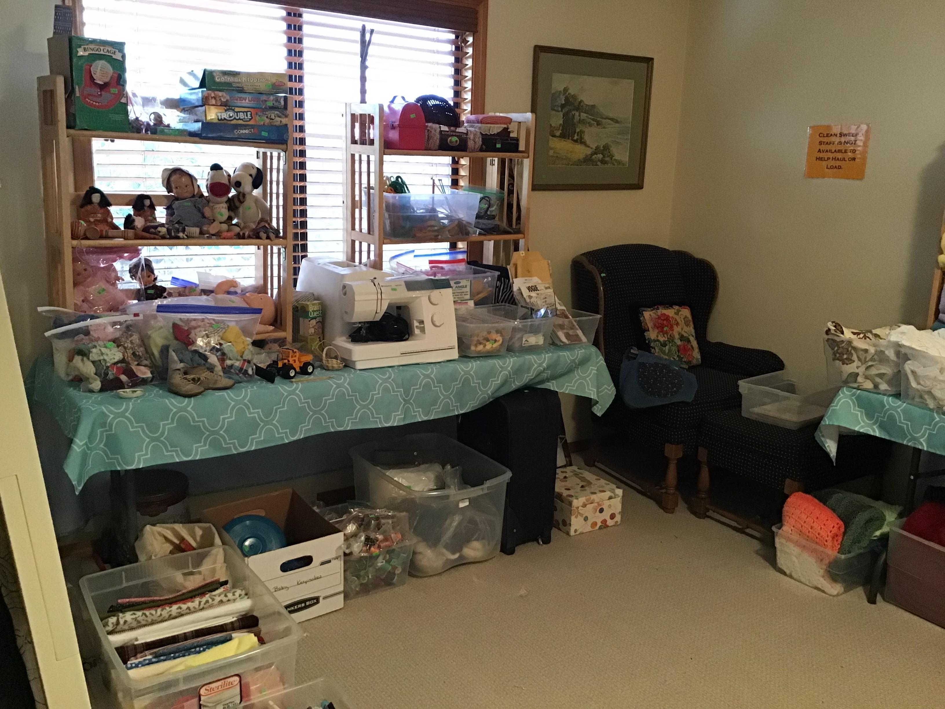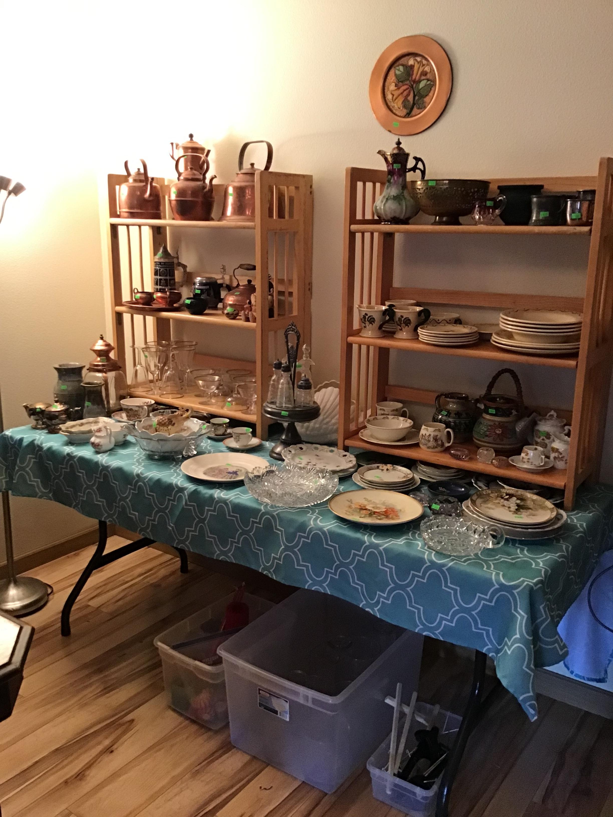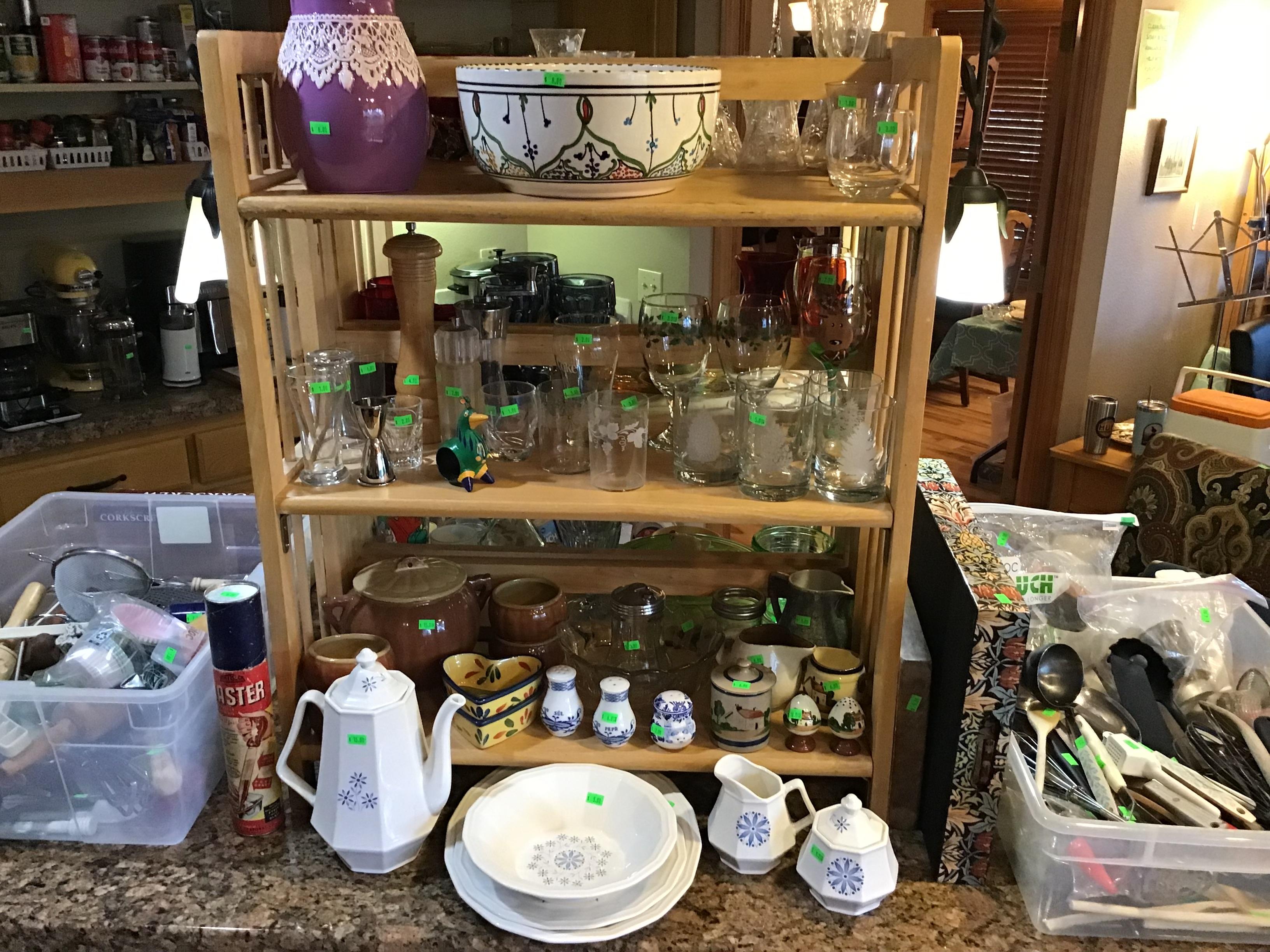 Antiques and collectibles, antique furniture, books. Contemporary furniture, including matching loveseat and sofa, Queen bed frame with storage, book cases, dining table and chairs, buffet, miscellaneous chairs, Linens, women’s clothing and accessories, toiletries and household products, kitchenware including small appliances, pots and pans, glassware, Pyrex, office miscellaneous, board games, wood canoe, outdoor pots, some tools, bookshelves and more!
