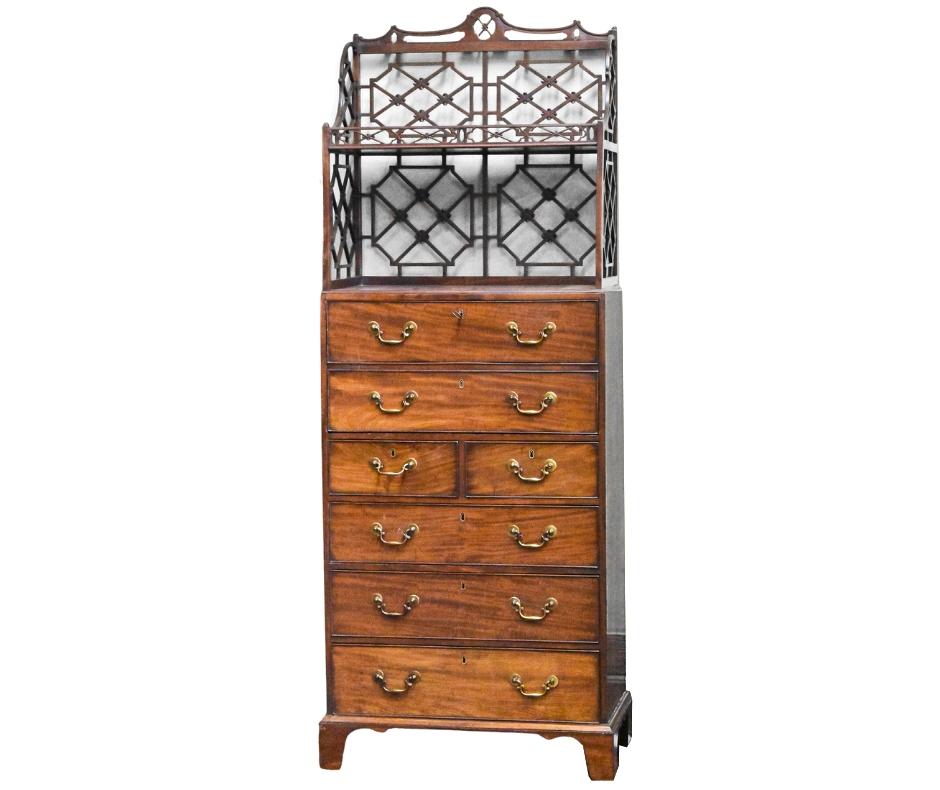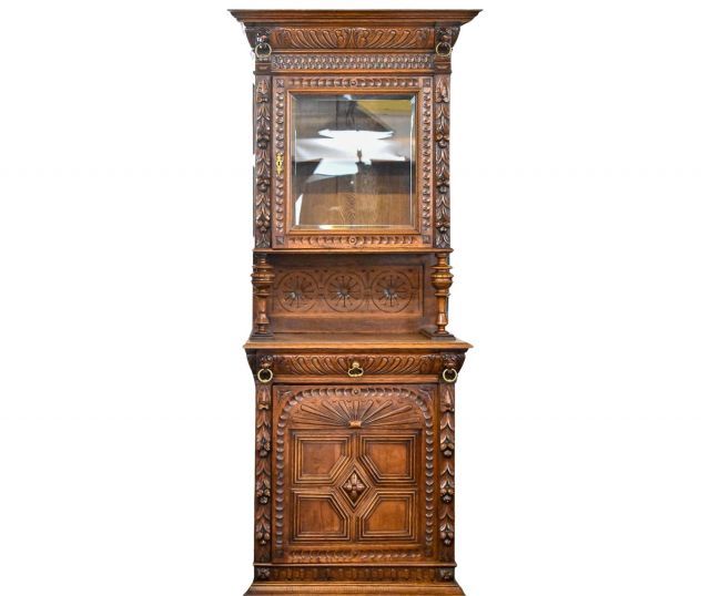 -ANTIQUE FURNITURE including William Cowling & Son Queen Anne mahogany & marquetry dressing table, French Renaissance Revival oak hunt cabinet, Baroque period marquetry cabinet on chest, Globe Wernicke stacking bookcases, Milanese Italian inlaid marquetry ebonized corner cabinets, Spanish renaissance Bargueno Escritorio, Queen Anne walnut miniature bureau, 18th C. Dutch rosewood valuables chest, mahogany work table attr. to Samuel McIntire, Early George III mahogany secretaire-chest chiffonier, Merklen style library table & more