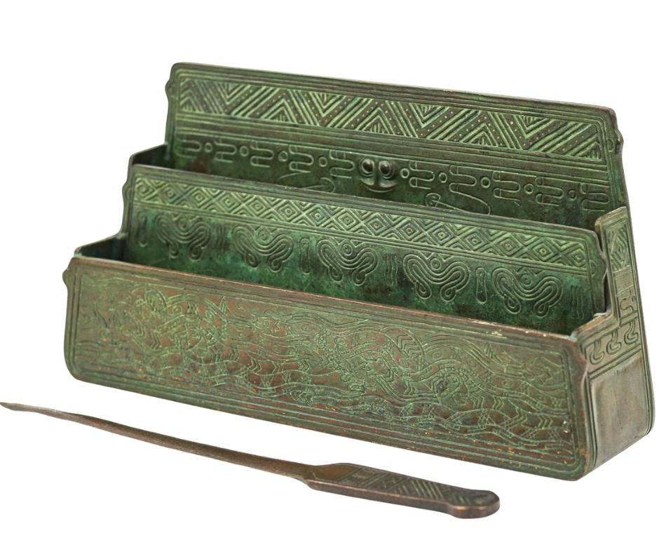 -TIFFANY STUDIOS SIGNED "AMERICAN INDIAN" PATTERN BRONZE LETTER HOLDER & OPENER