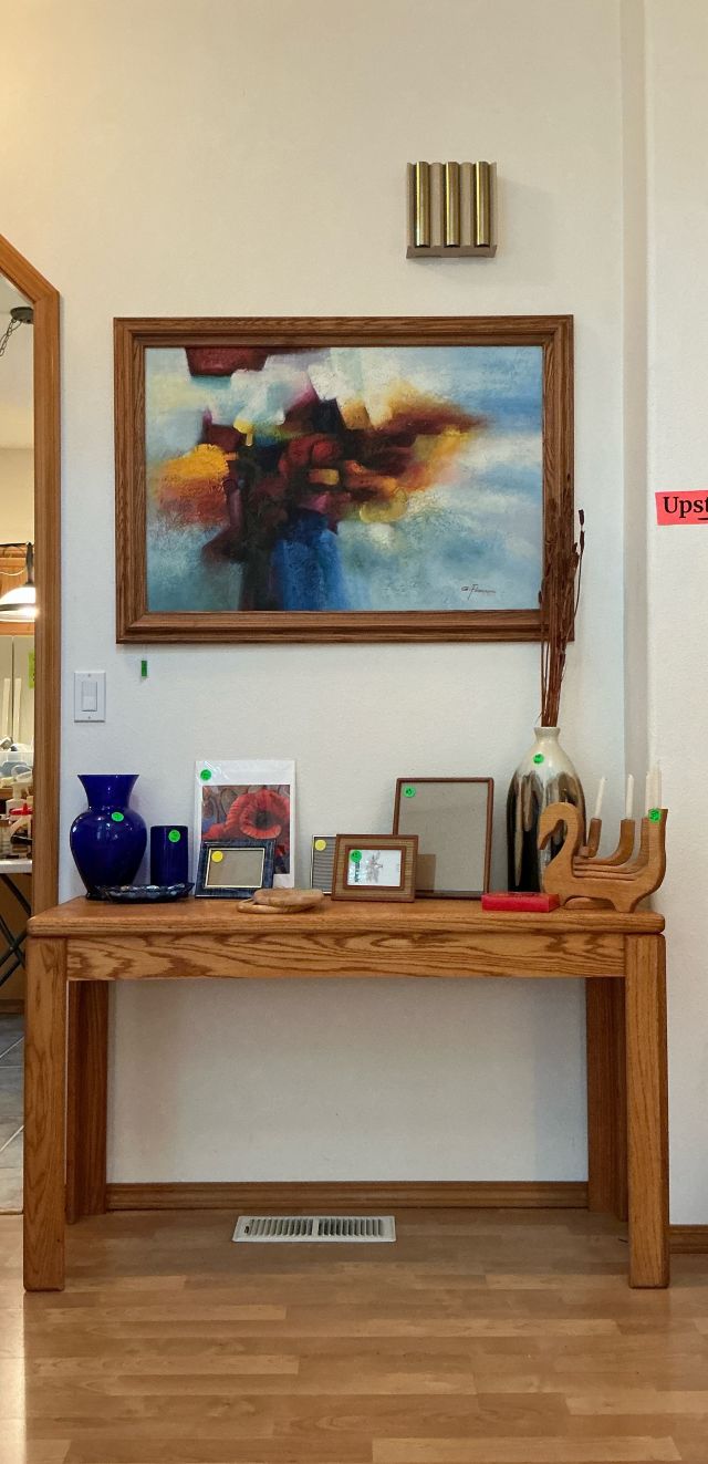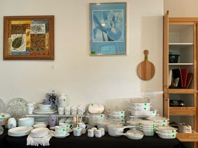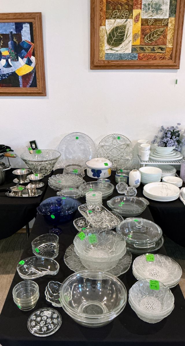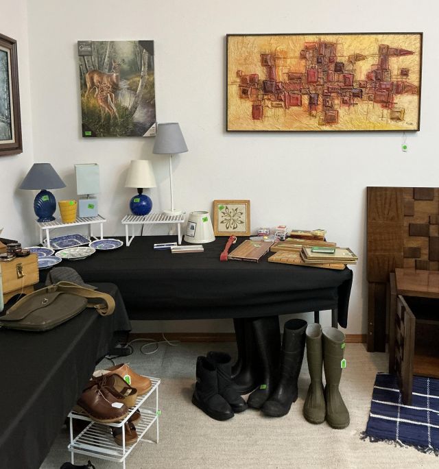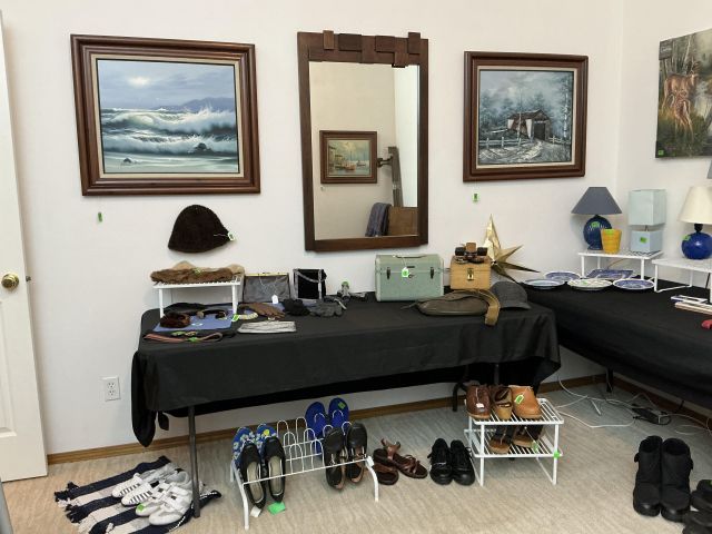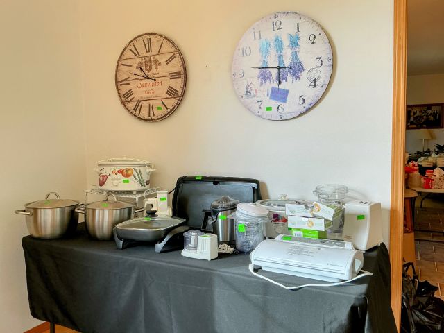 • Tractor, Refrigerator, Freezer, Whirlpool washer and dryer, variety of Clocks, heaters, ladders, many rugs, kitchen utensils and accessories, purses, shoes, full mattress, Corelle Ware sets, 65in television, Ikea chairs, 2 oak dining tables w/chairs, Tupperware, Knives, many style of lamps, Coffee makers, crock pots, full cookware sets, blenders, Disney Telephones, vintage stereo sets, Leather couches, Hand-blown glass, milk glass, hand-carved wooden rocking horse, metal Viking ship, wooden model ships, Oak bedroom sets, lanterns, and much more!!!
