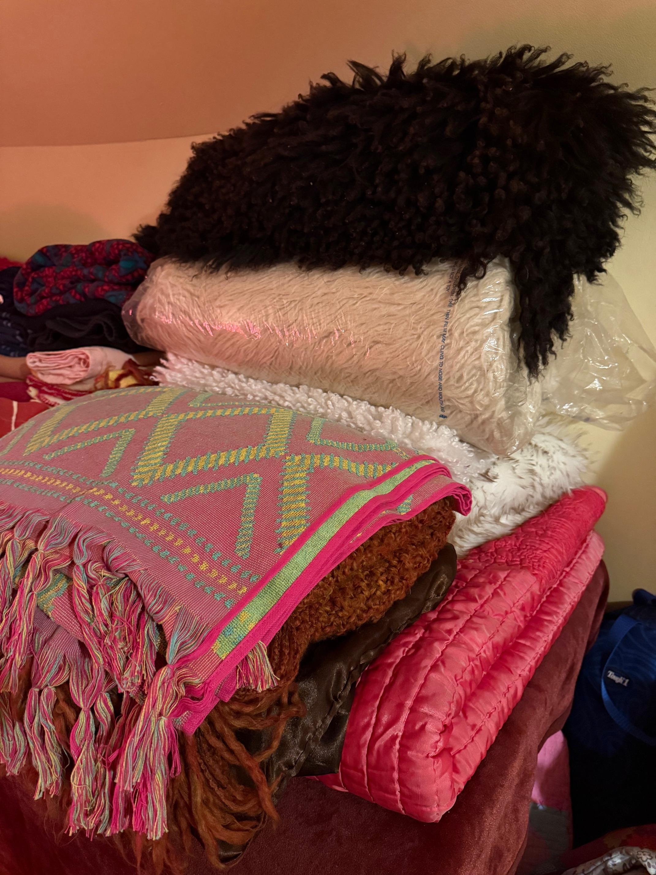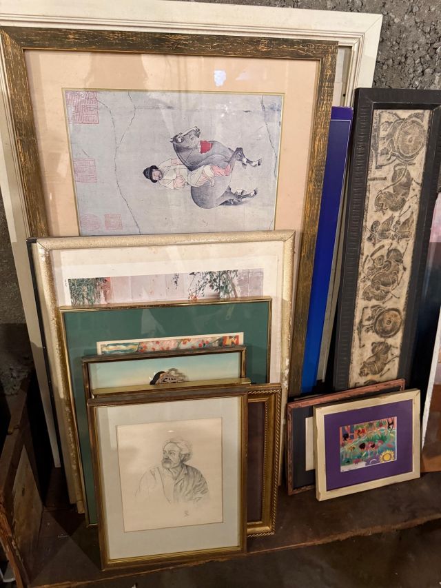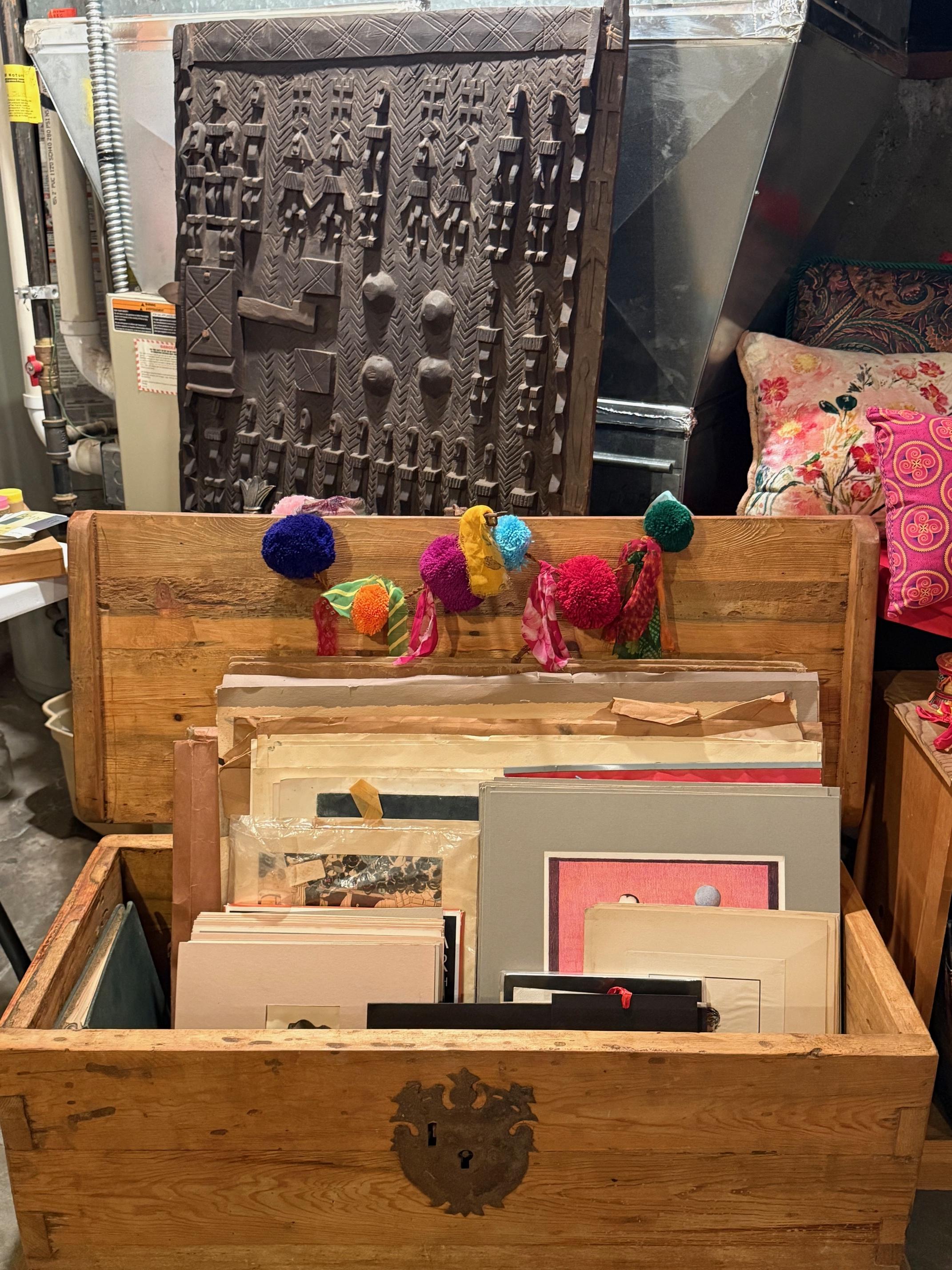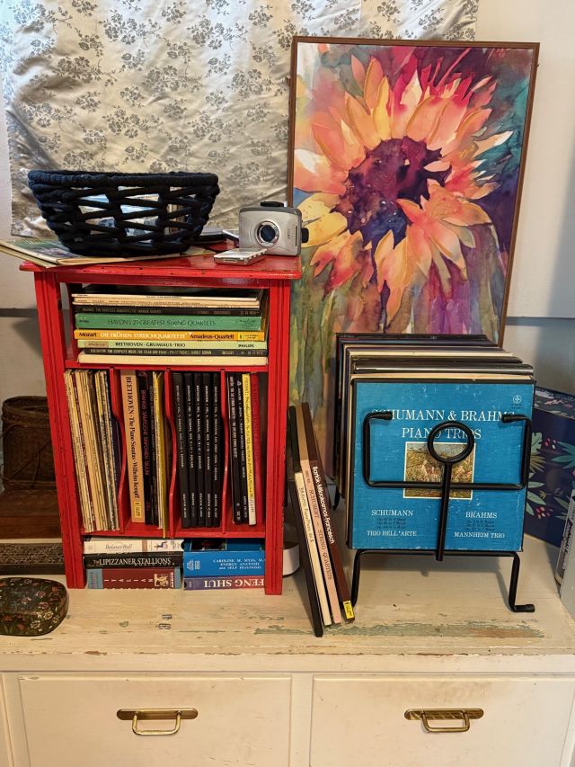 Books, artist supplies, easel. Art books and Ephemera. Computers. Textiles, linens, pillows and vintage toys. Vinyl.