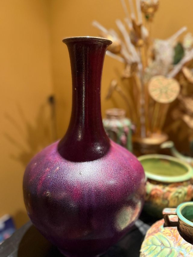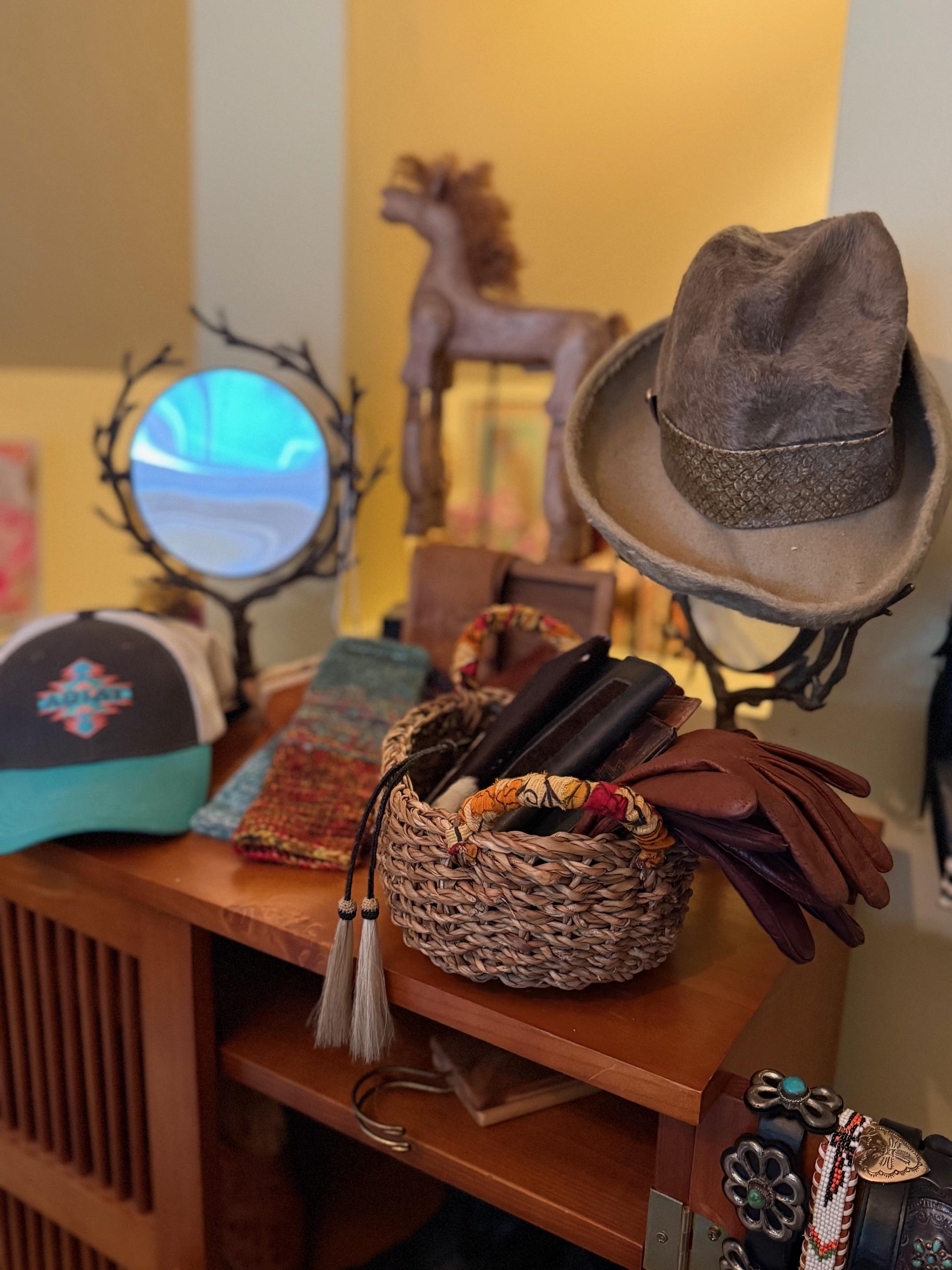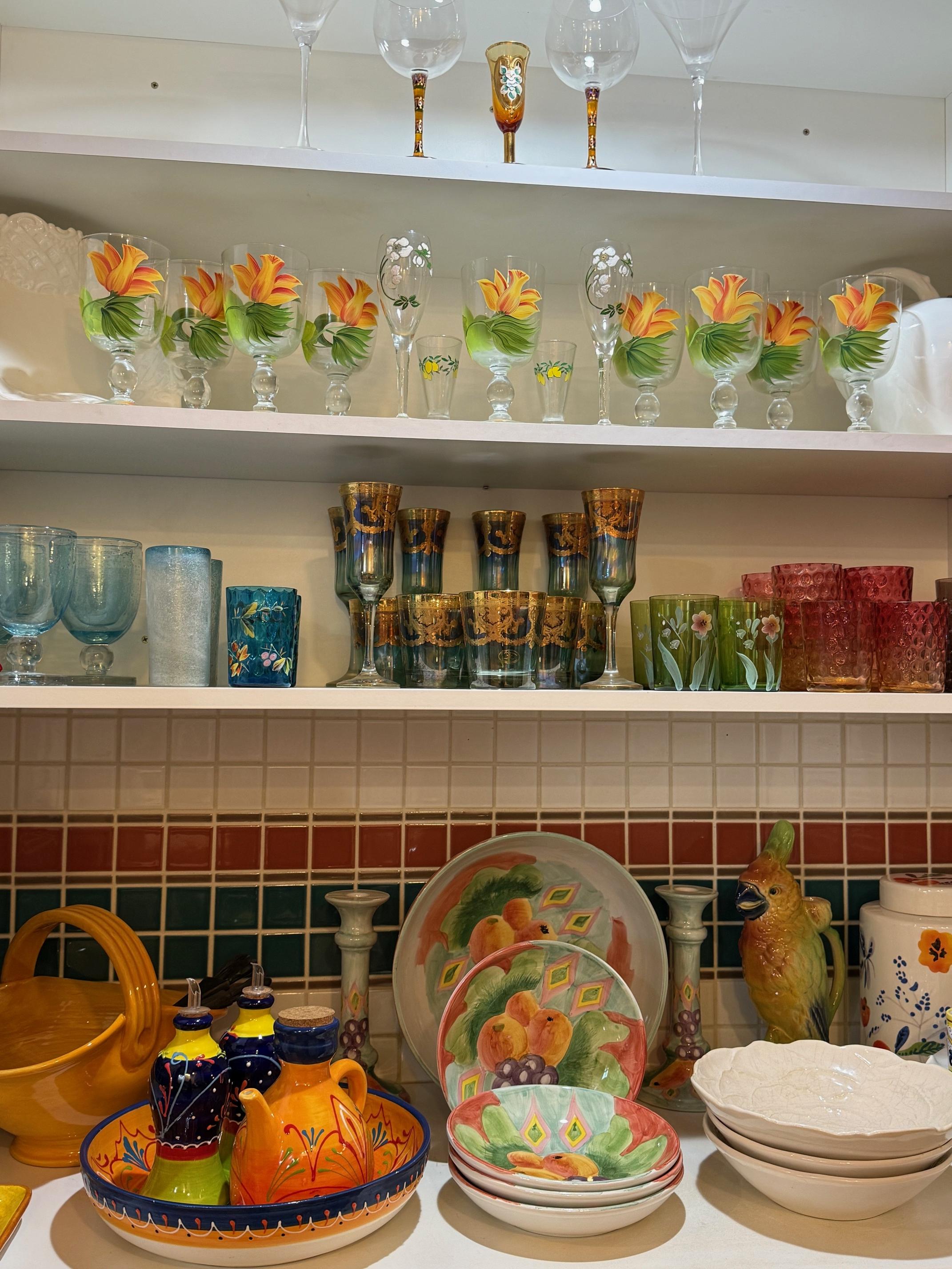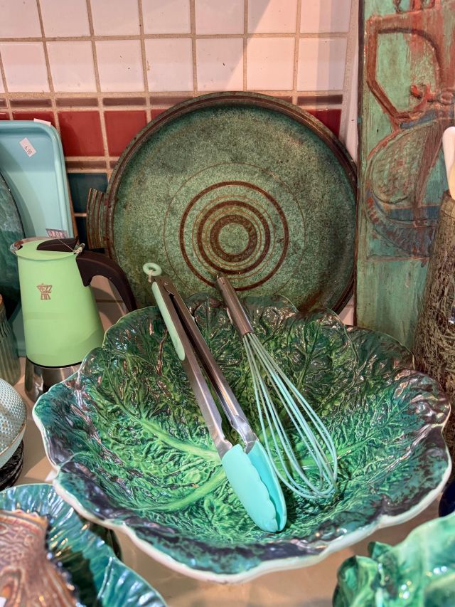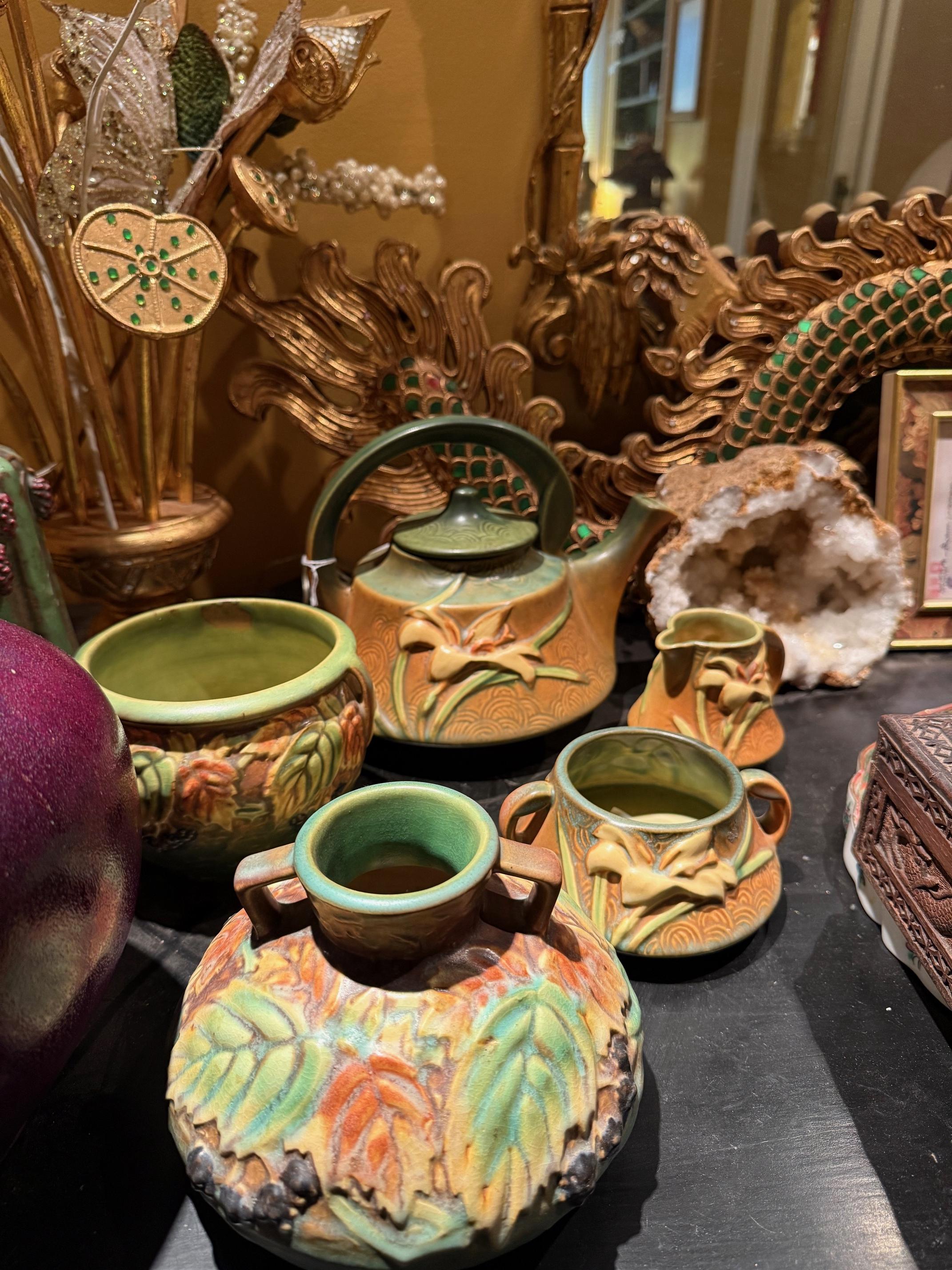 Pottery, glass, jade, Roseville…rare blackberry pattern. Baskets, mirrors, gilt, glam. Crystals, geodes.