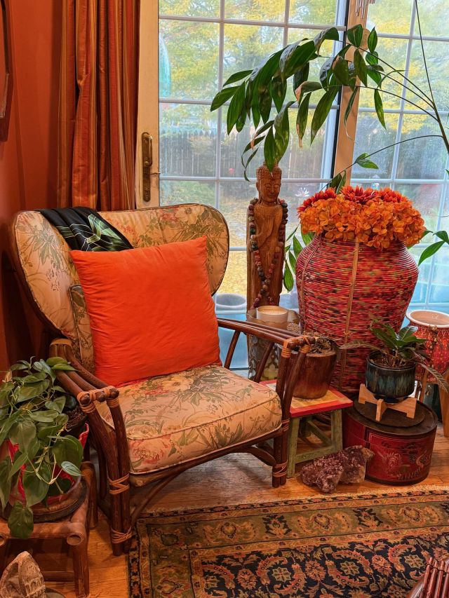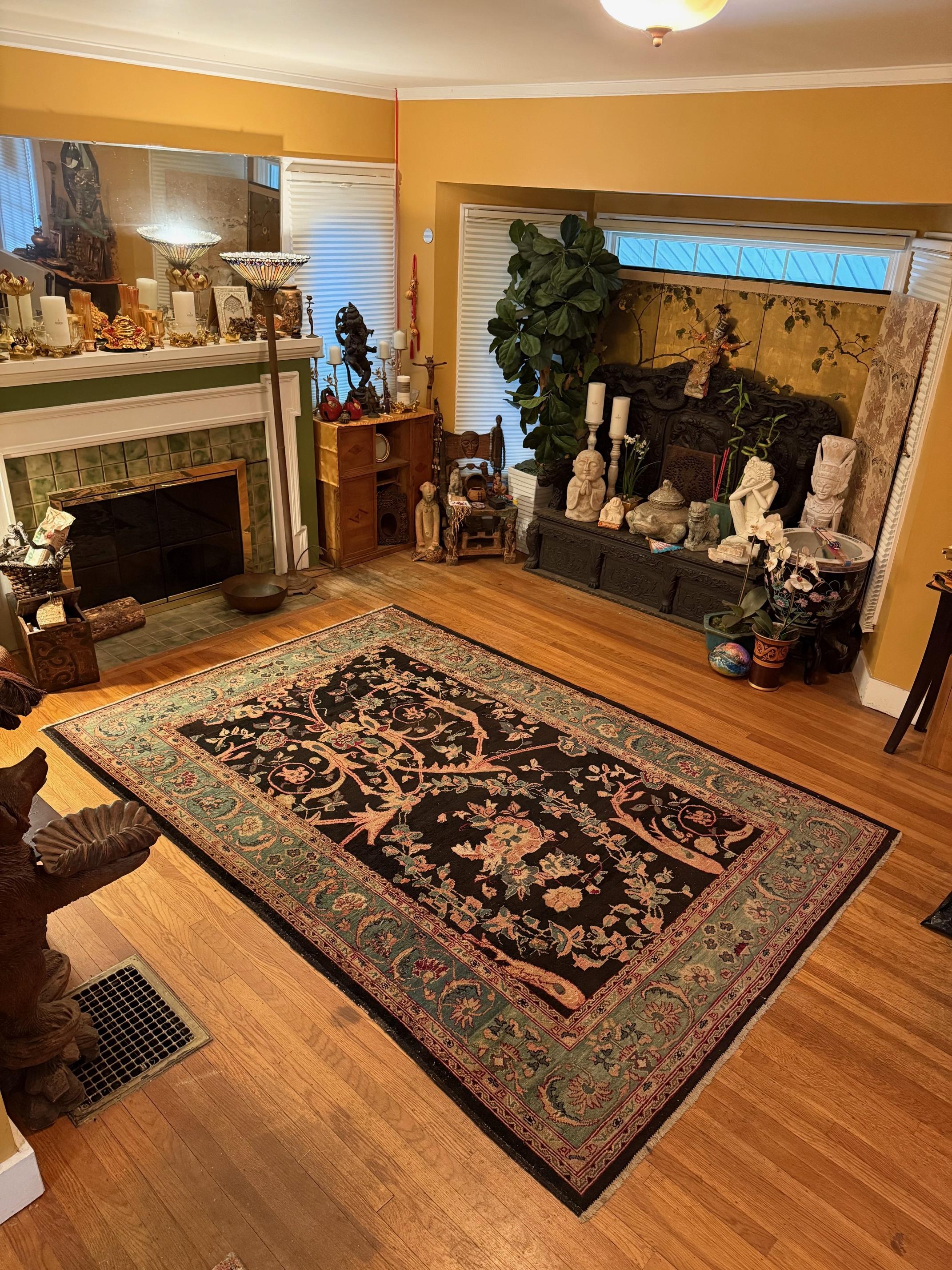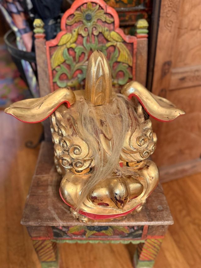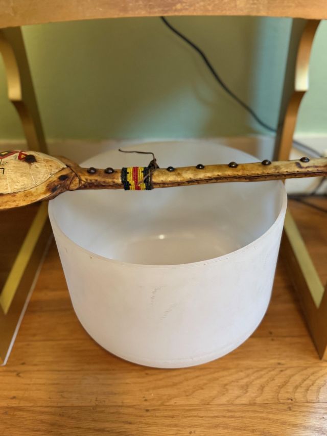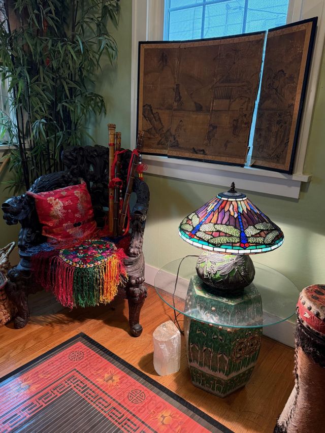 Rugs, lamps…the Buddha lamp with shell shades…the jade lamp. Crystal singing bowl. Musical instruments.