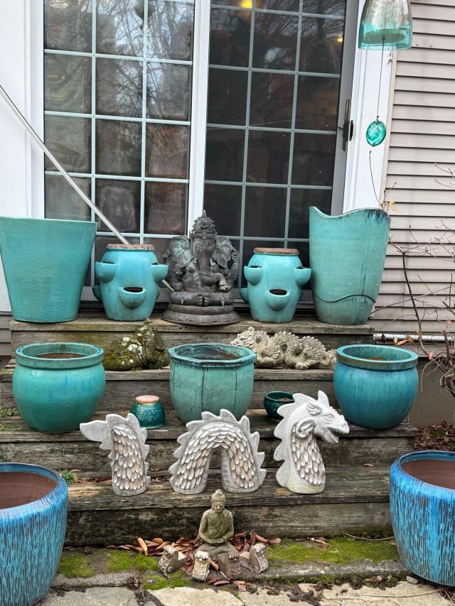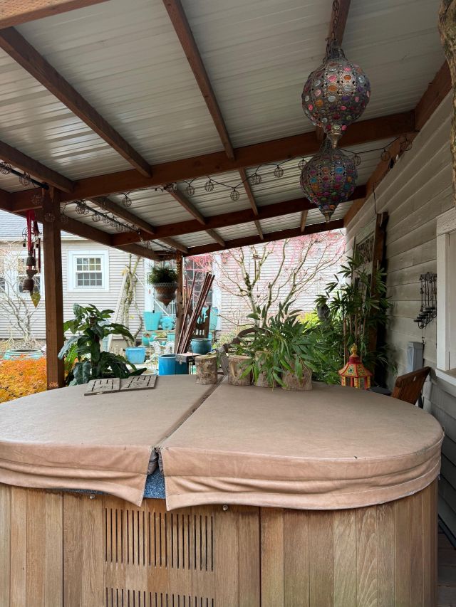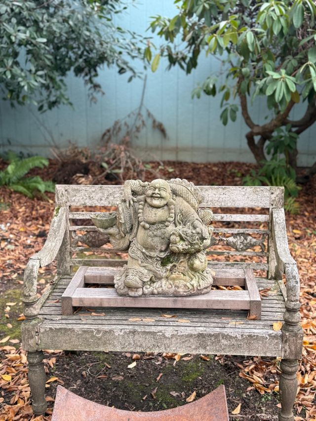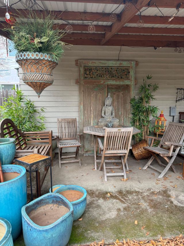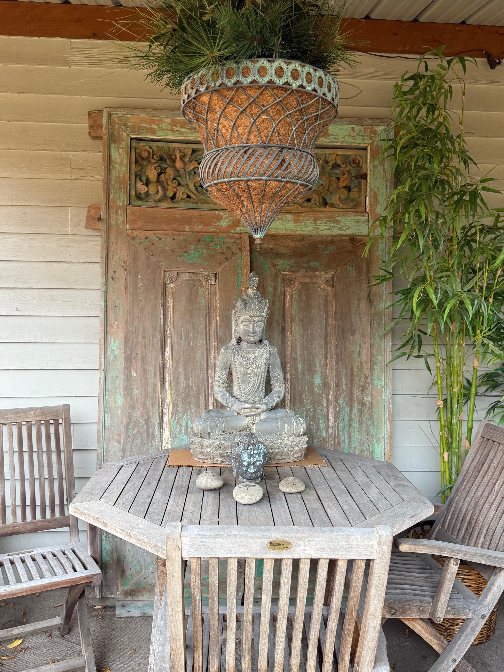 Step outside to embrace the Zen yard. Outdoor pots, Japanese soaking tub. Teak outdoor furniture. Yard art, Cushions, loads of architectural pieces. Fire pit, Concrete.