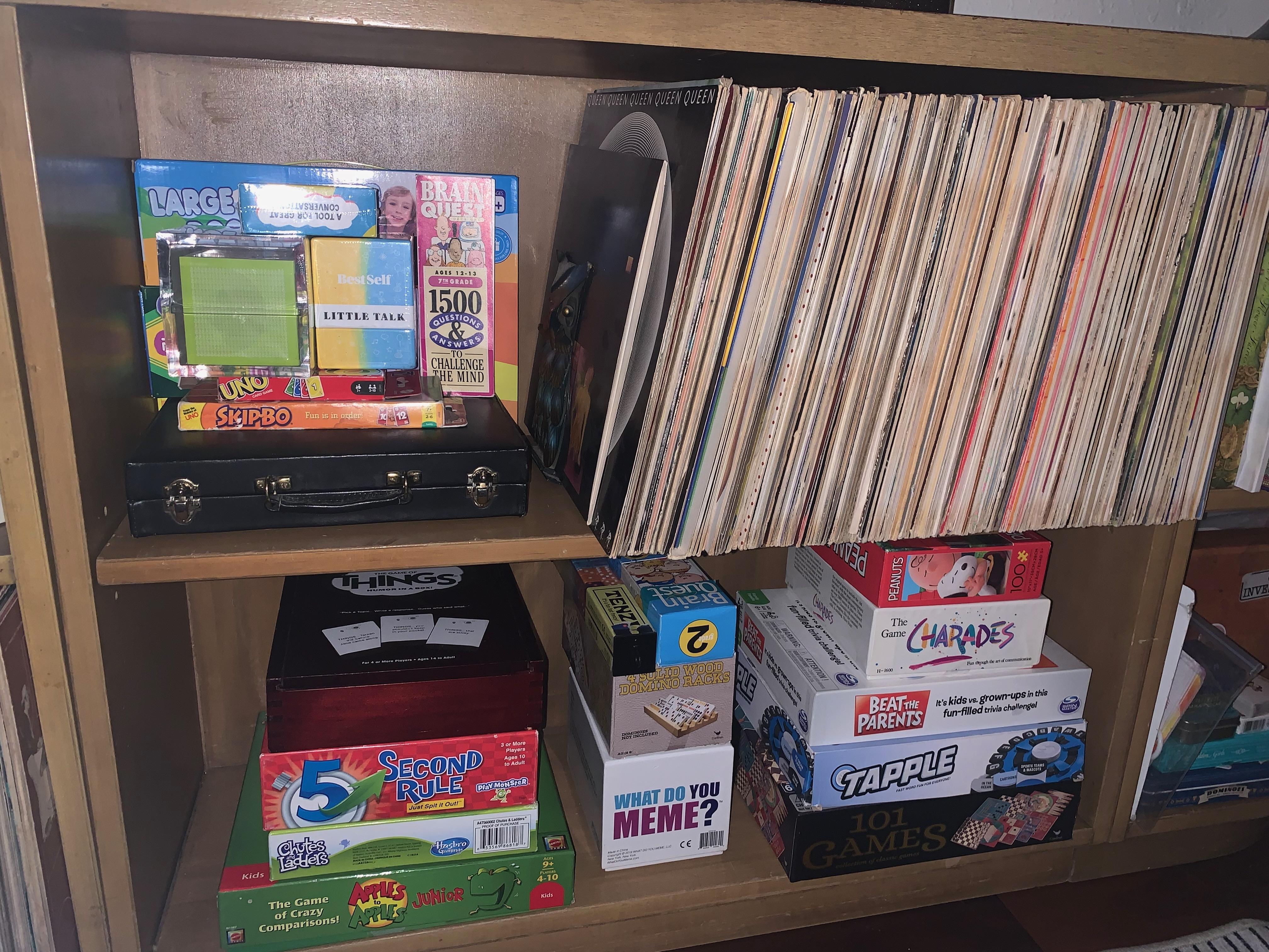 Large collection of Vinyl records, board games, yard games (cornhole), kids’ dishware and more