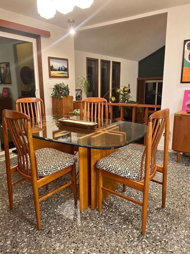 Glass + Teak Dining Table & 4 teak chairs: 62" × 42" × 28.5" H