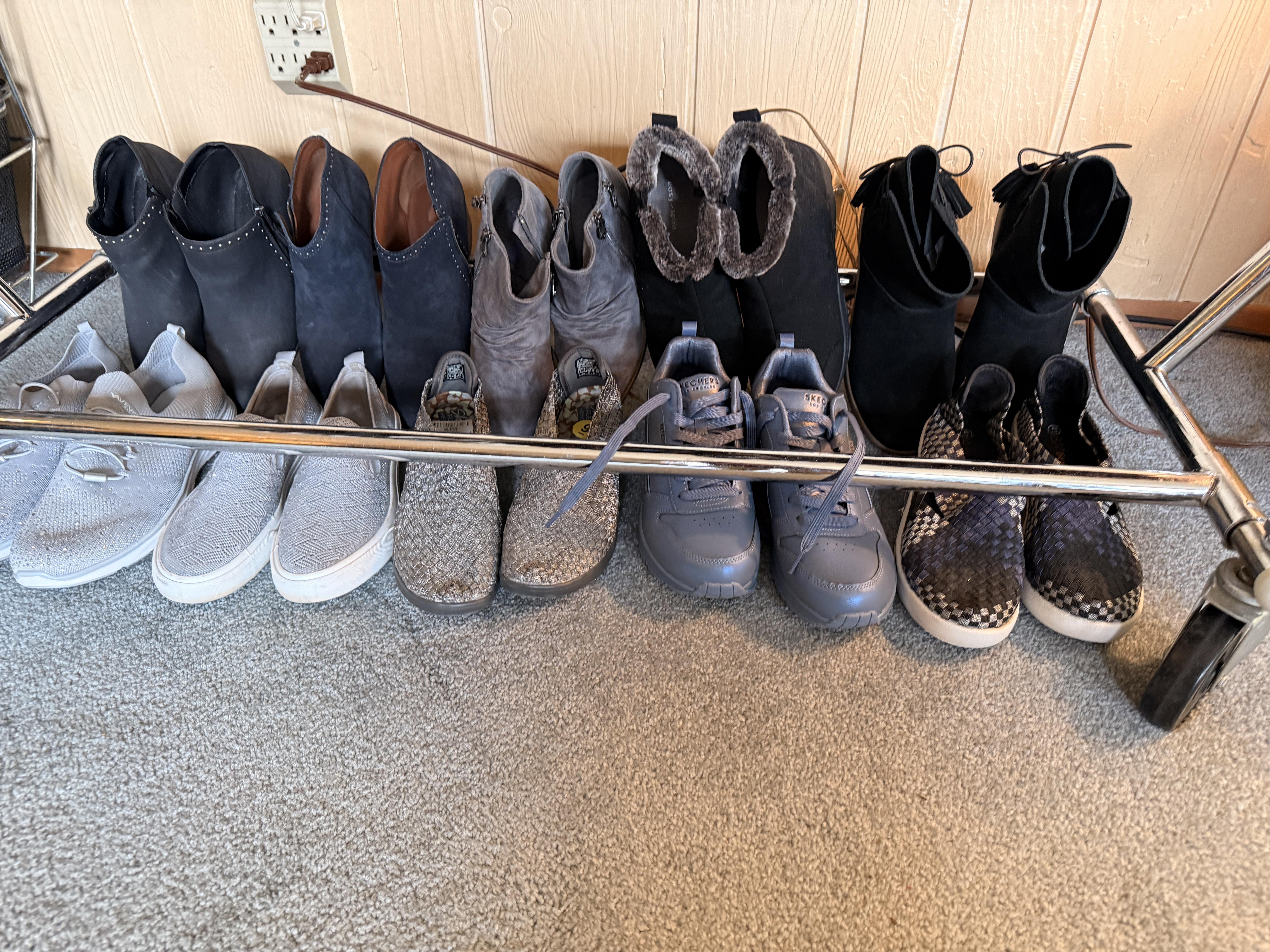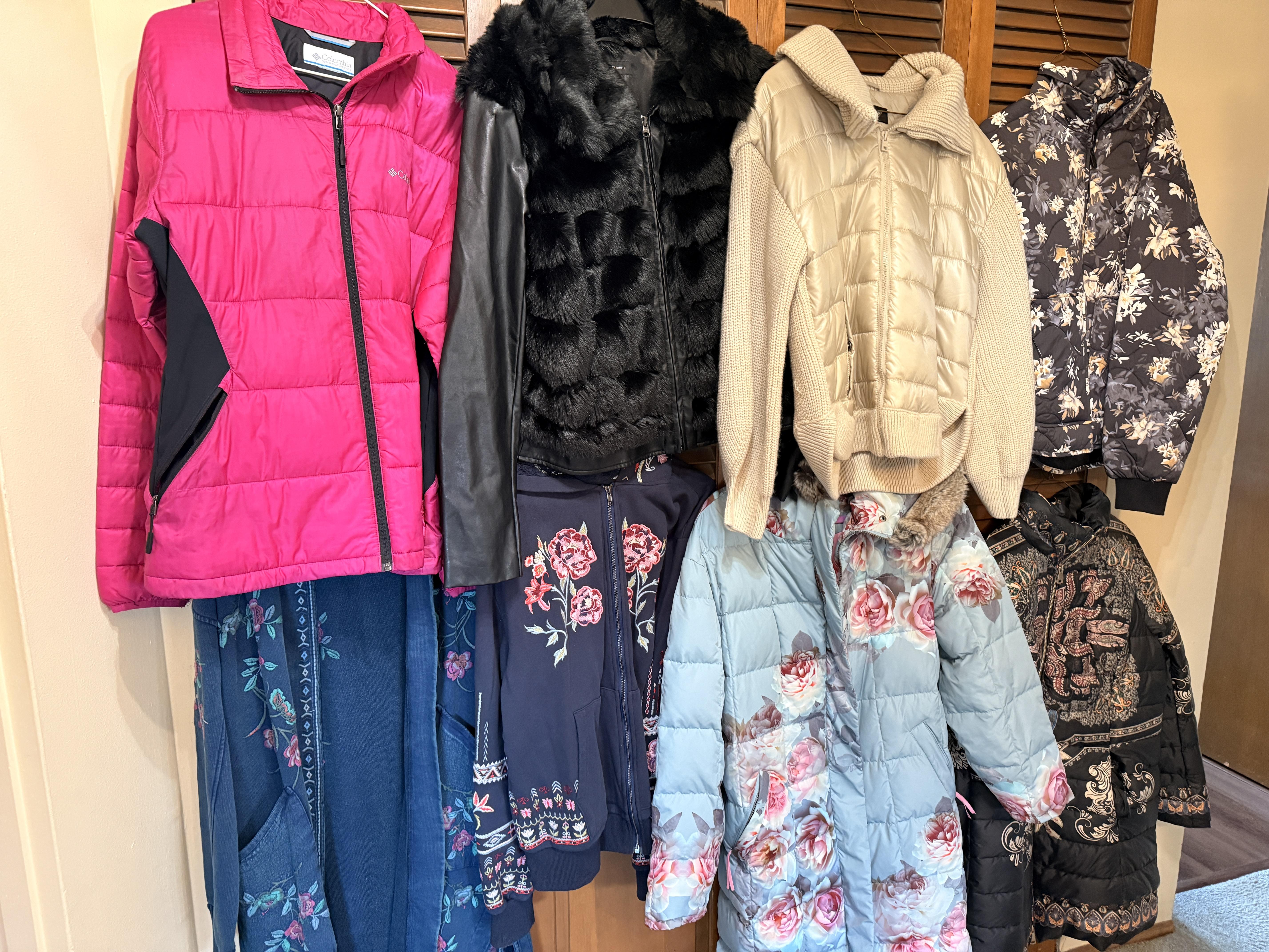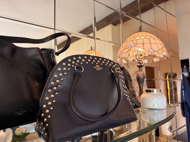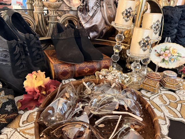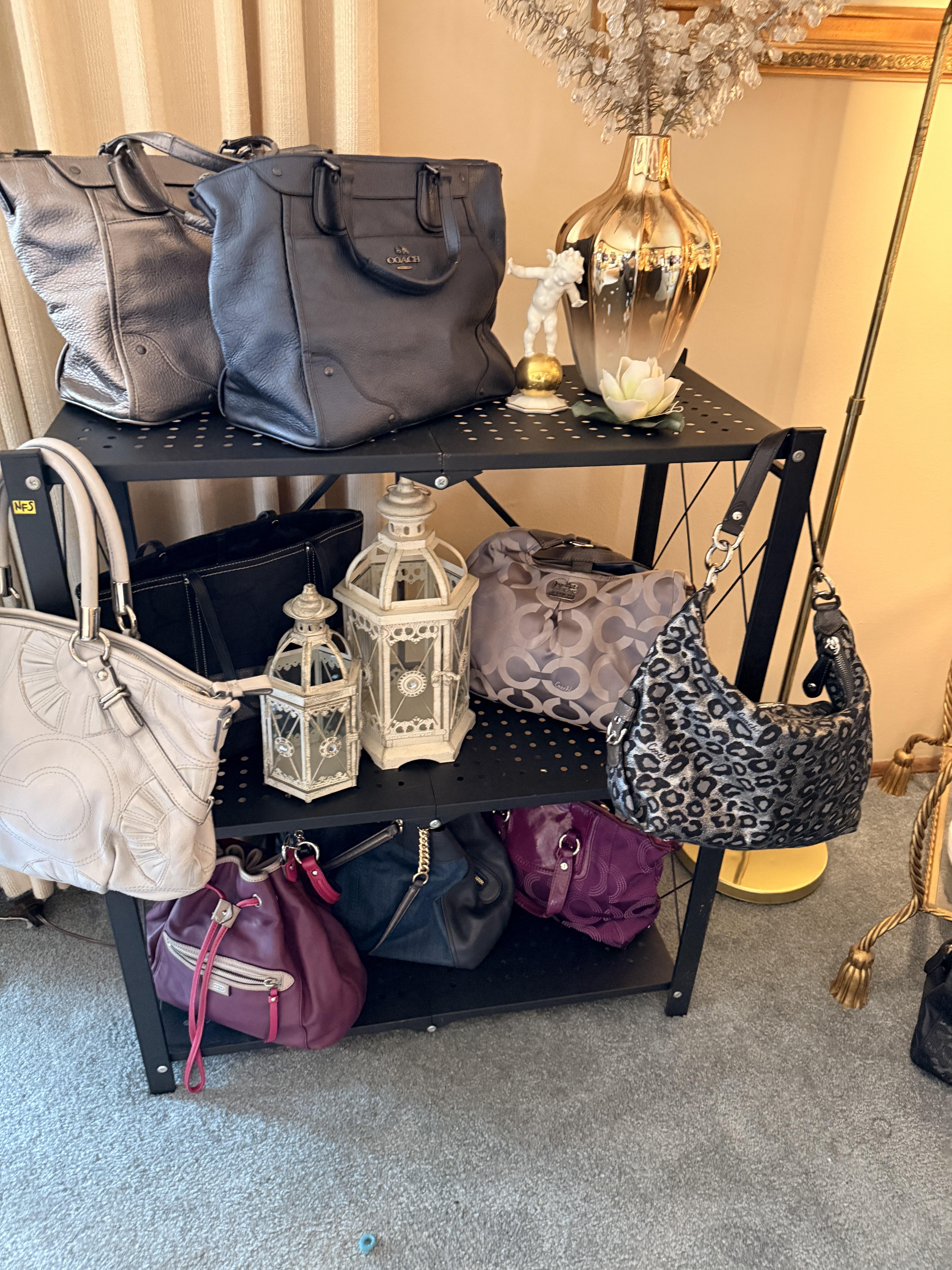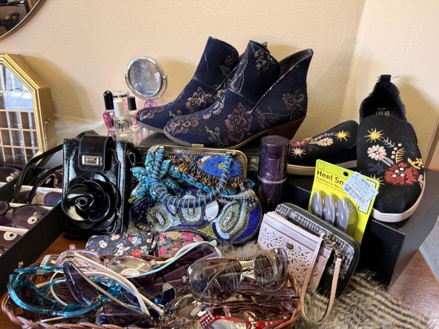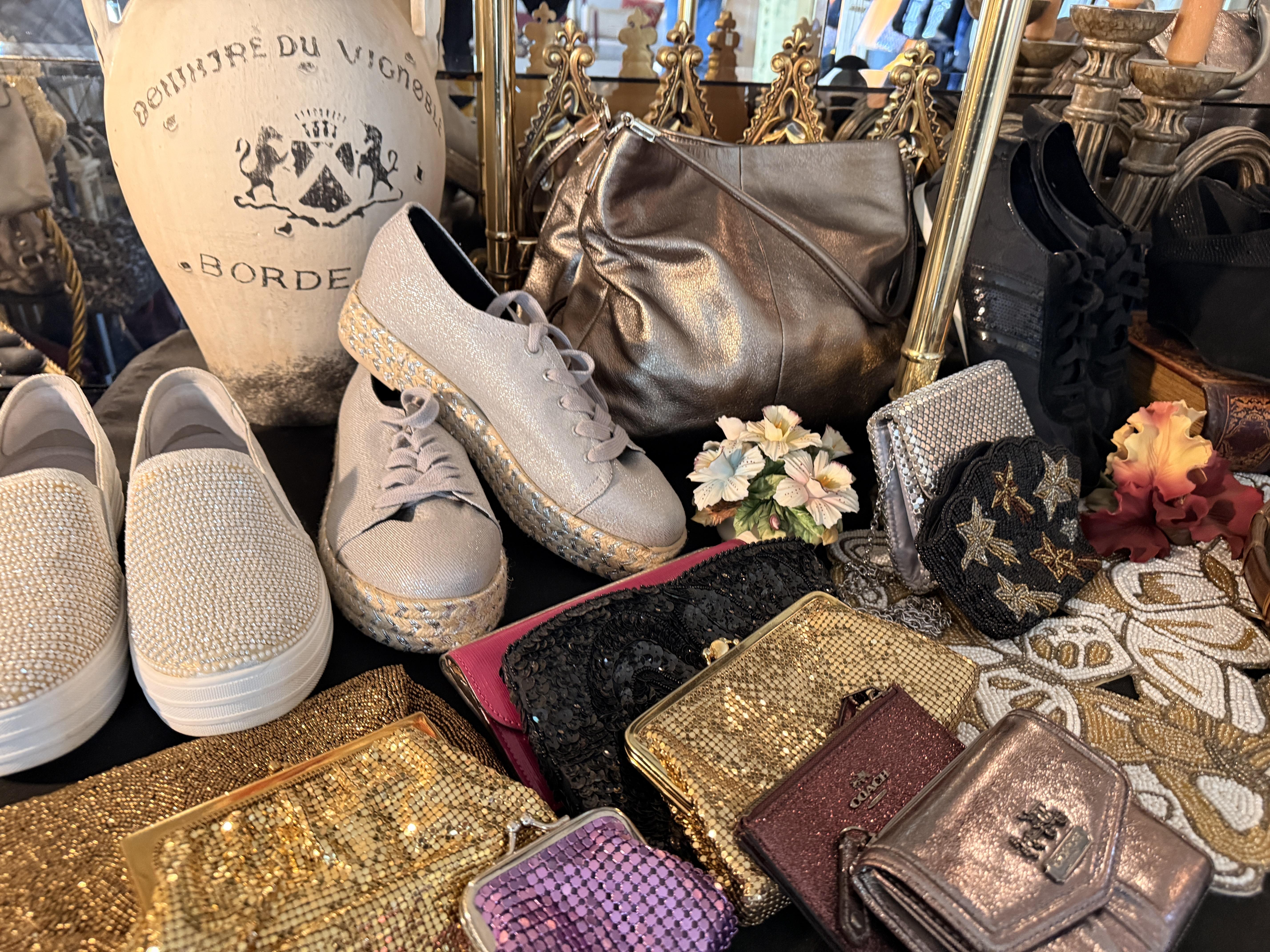 Love glamour? Shoes? Purses? Clothes? How about sequins? This room is full of all of it! We've got SO many Coach purses - most look barely used, if used at all. Black, silver, purple and more - totally wearable luxury! Shimmery Whiting and Davis, Shoes - so many shoes - Sam Edelman, Coach, Sketchers and more - mostly size 9-10. Most barely worn! And the clothes - sequins, leather, faux fur and more! Super cute and super fancy! Mostly size M/L. Karl Lagerfeld, Chicos, Ana - lots of great brands. And it's not just clothes. We've got some accessories in this room as well - Betsy Johnson and Coach scarves, Gucci and Ray Ban Sunglasses and lots of costume jewelry. Bowl of pretty sunglasses, vintage fur wrap scarves.