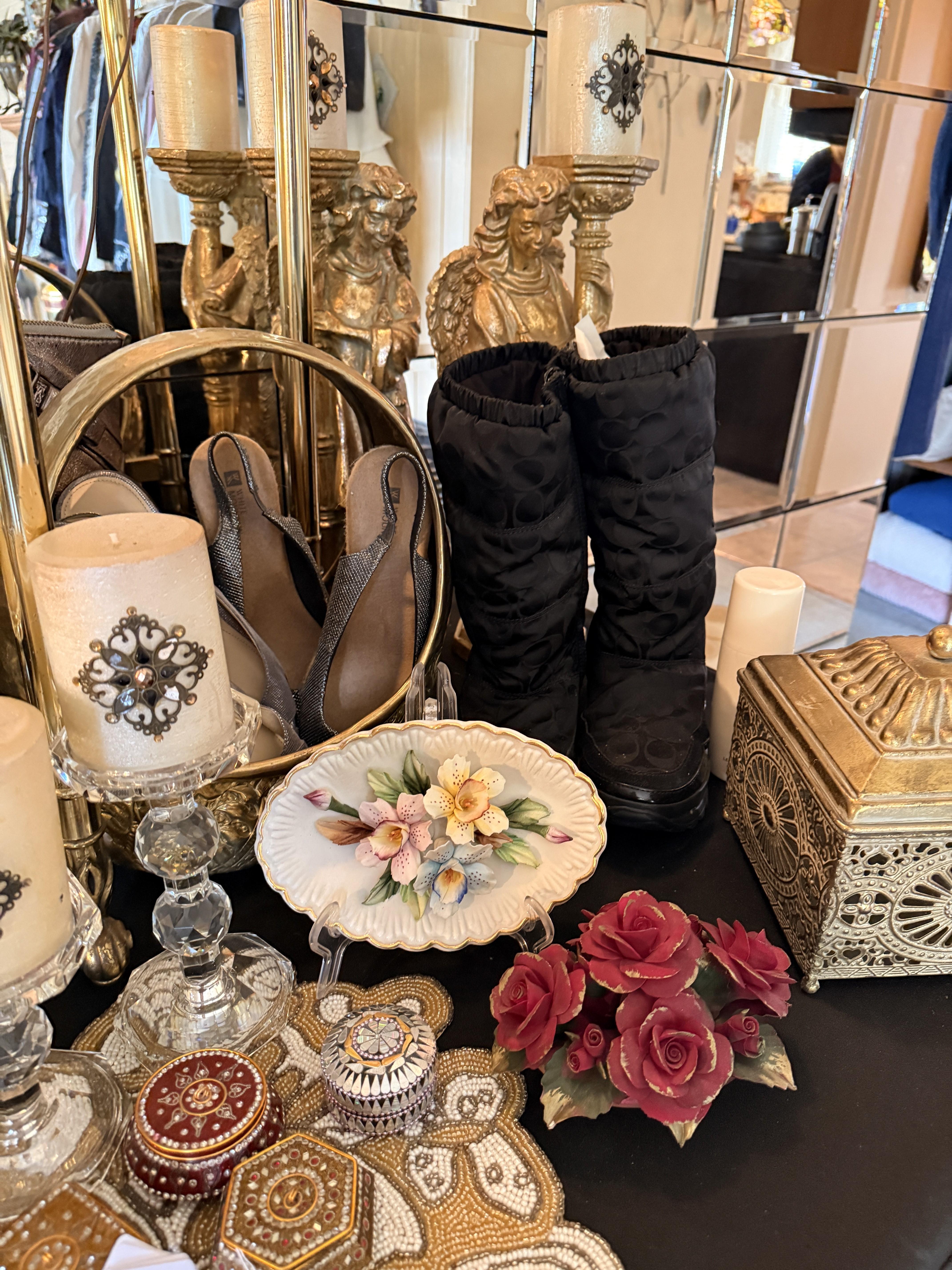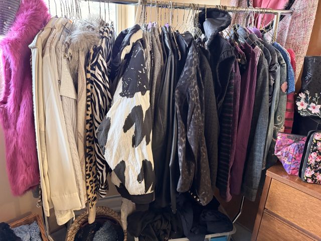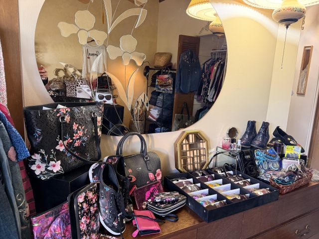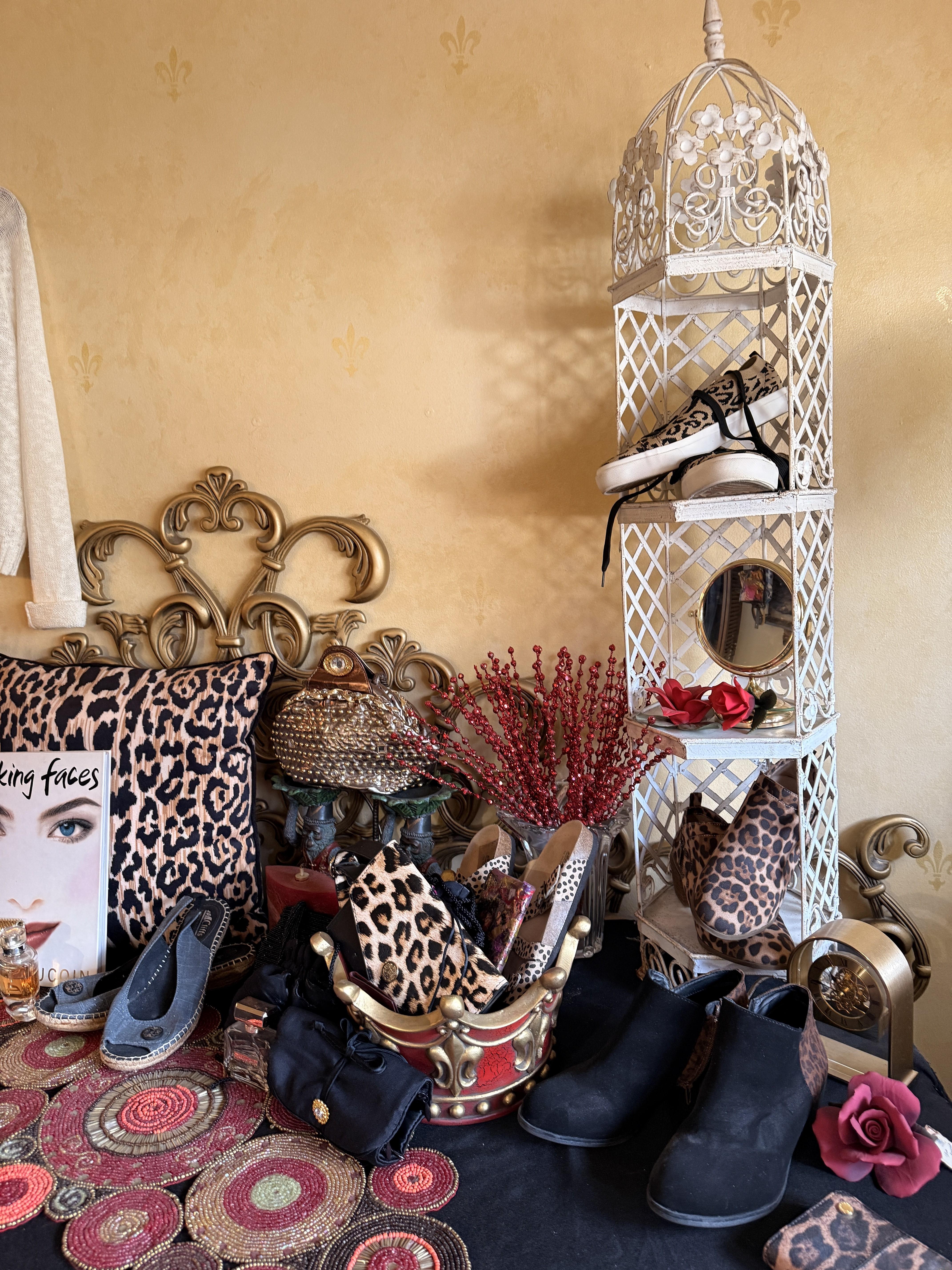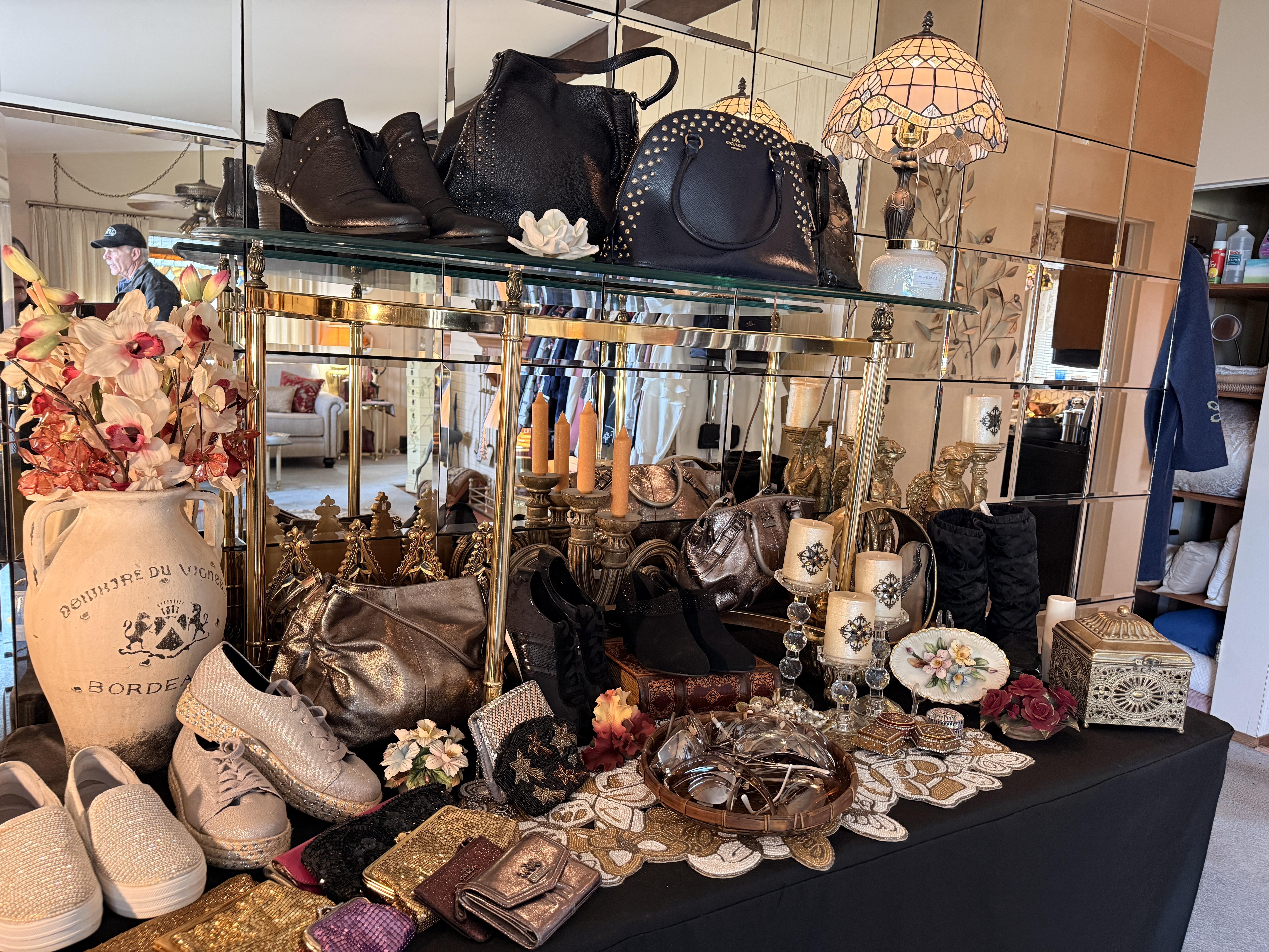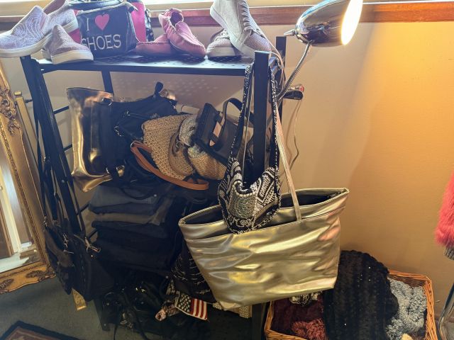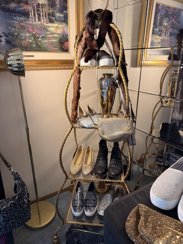 Oh the clothes! Really... they are EVERYWHERE. But the most are here. So many great pieces and the better brands! Chicos, NYDJ, Nordstrom brands, Guess... a few vintage pieces, faux fur, leopard, brights, black and ivory, embroidered florals... Handbags, scarves, MORE shoes, sunglasses! MCM low boy dresser, amazing Iris mirror, some perfumes, cute metal mini-etegere, statement metal gold headboard, blue stained glass piece... LOTS to see in here!!
