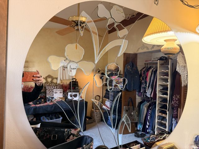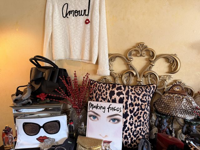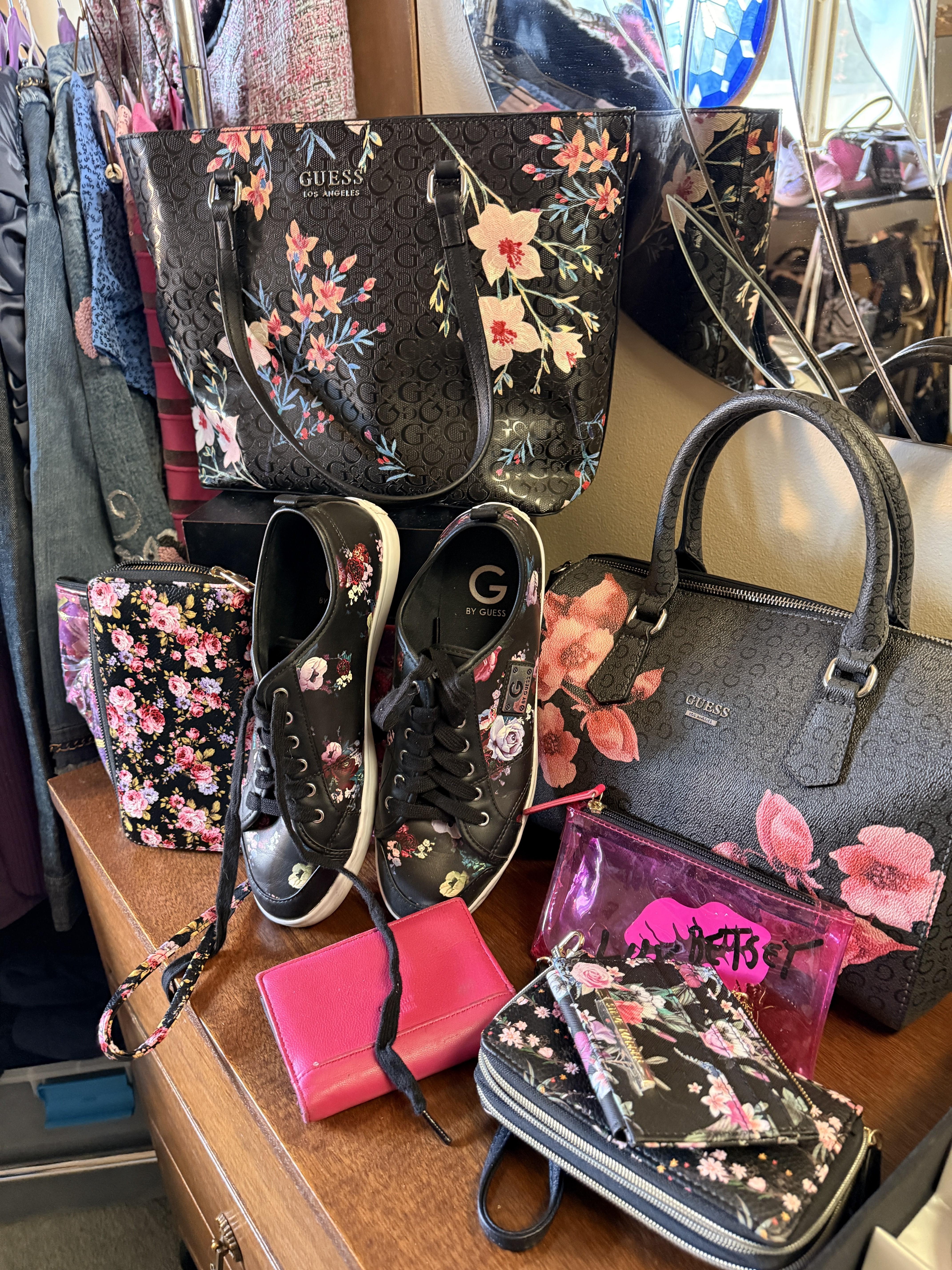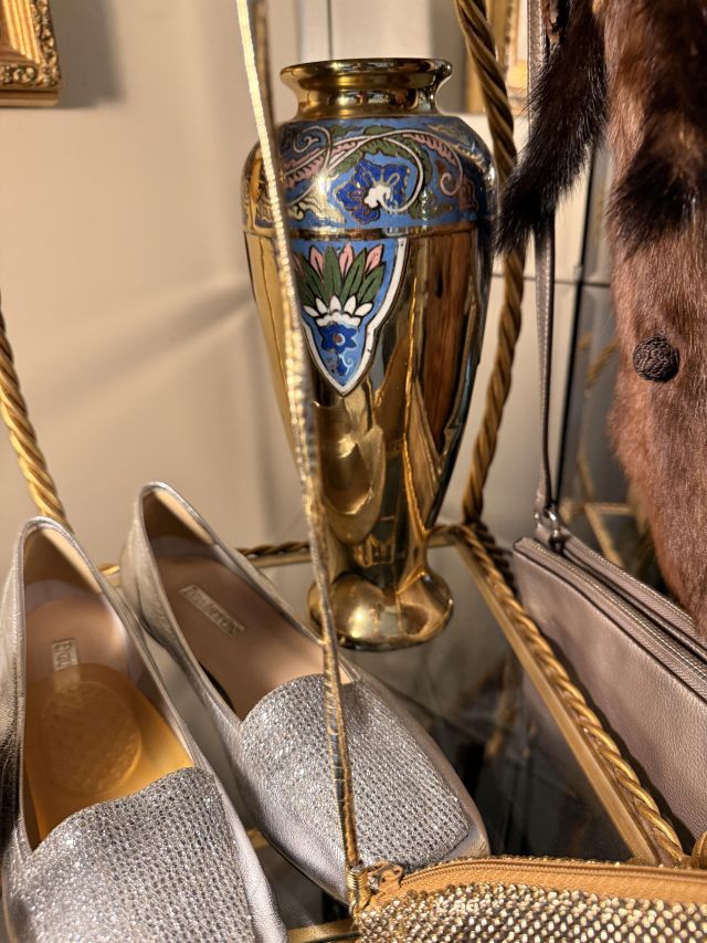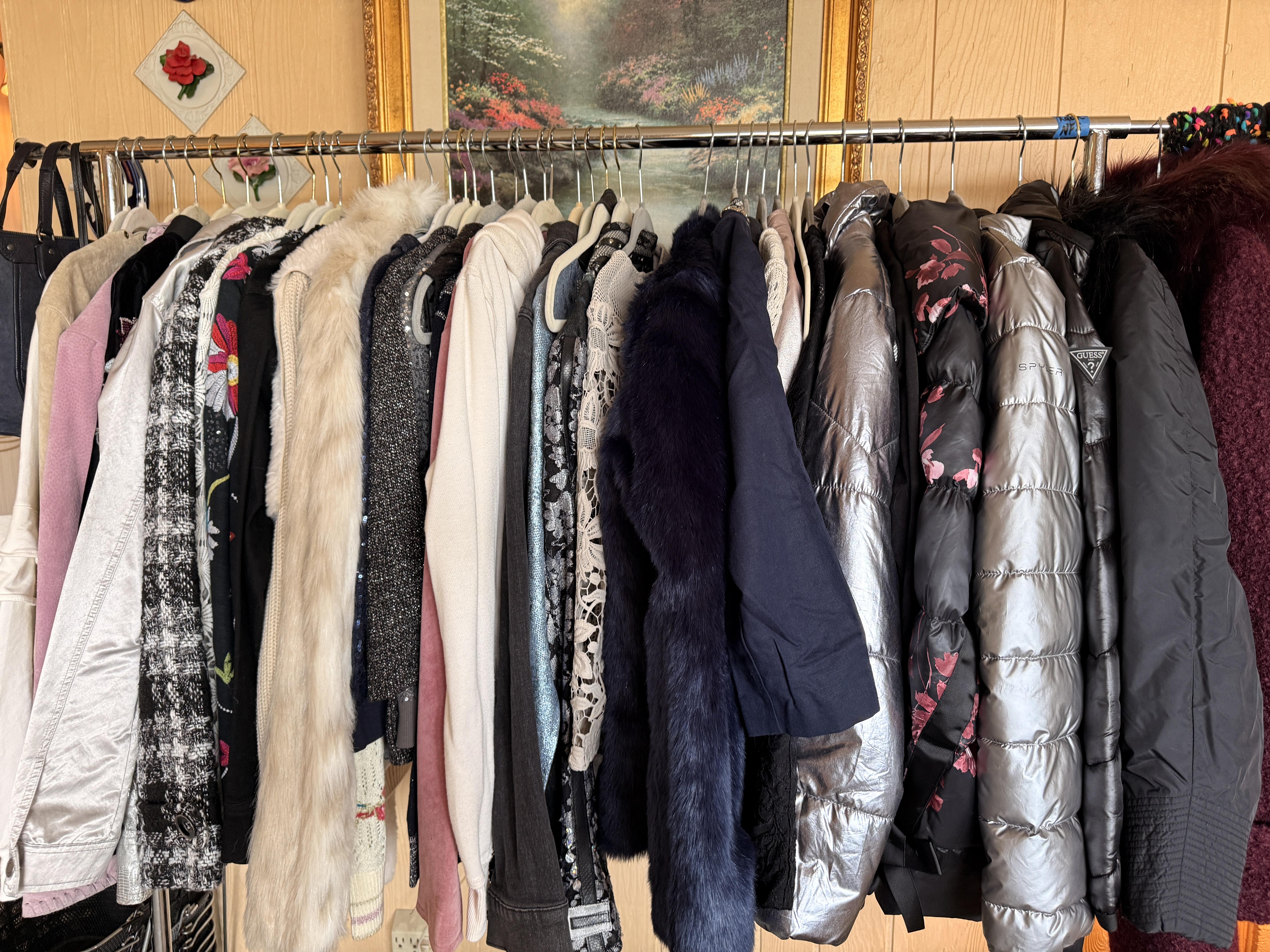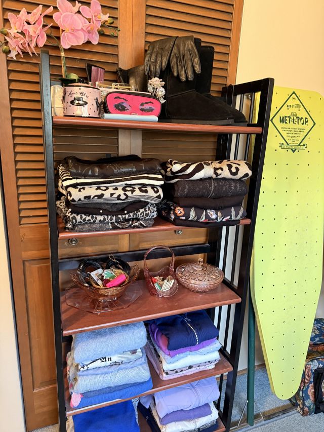 Oh the clothes! Really... they are EVERYWHERE. But the most are here. So many great pieces and the better brands! Chicos, NYDJ, Nordstrom brands, Guess... a few vintage pieces, faux fur, leopard, brights, black and ivory, embroidered florals... Handbags, scarves, MORE shoes, sunglasses! MCM low boy dresser, amazing Iris mirror, some perfumes, cute metal mini-etegere, statement metal gold headboard, blue stained glass piece... LOTS to see in here!!