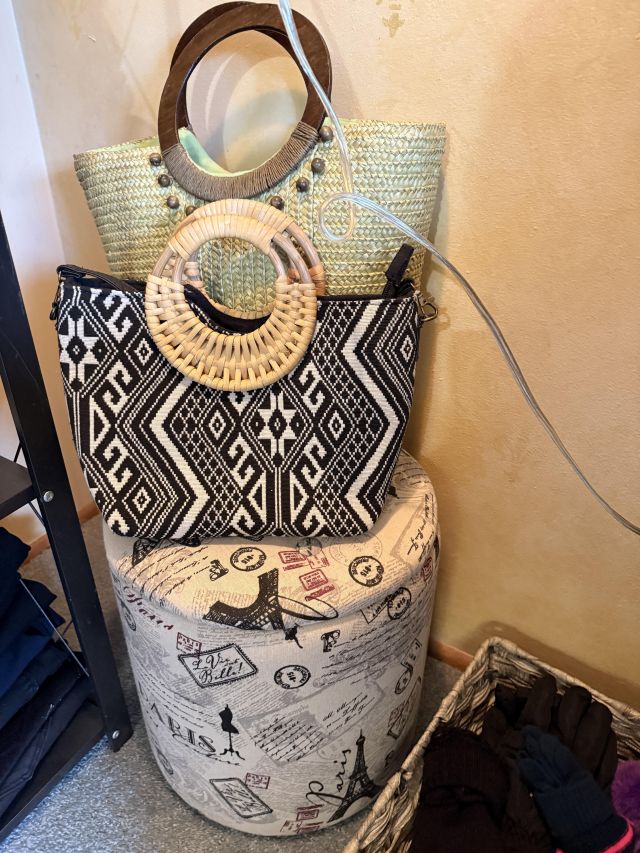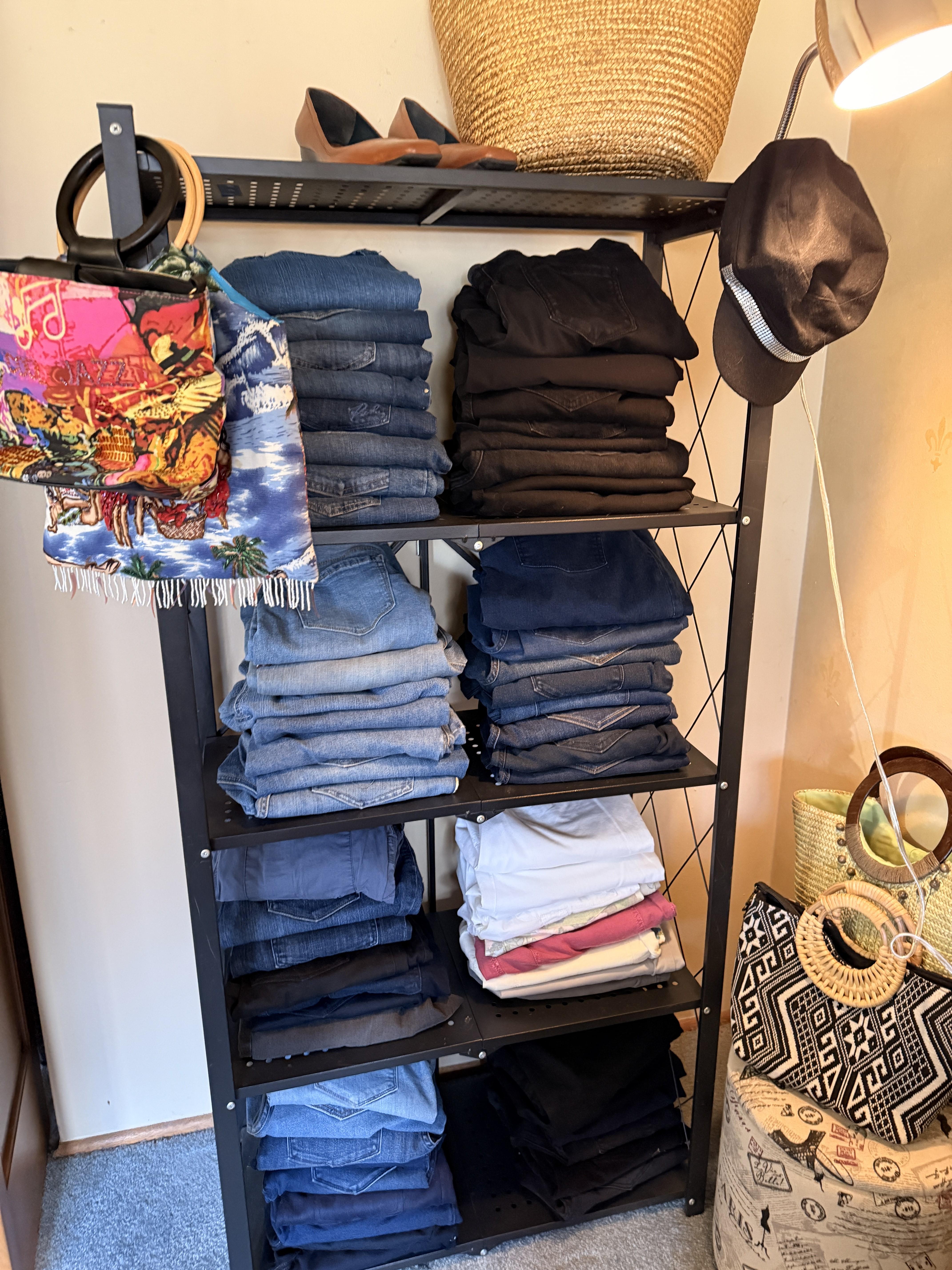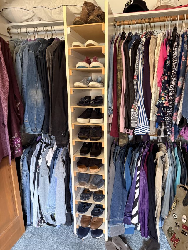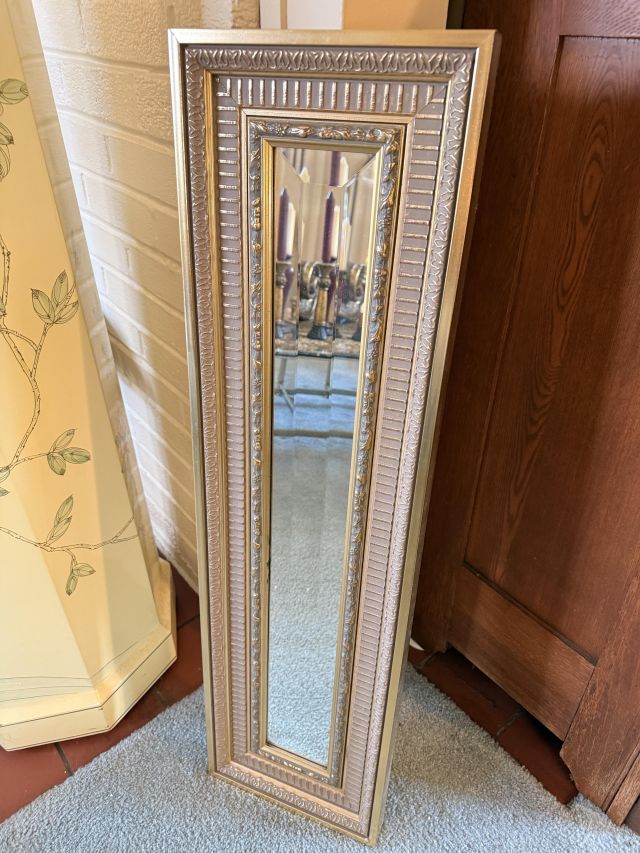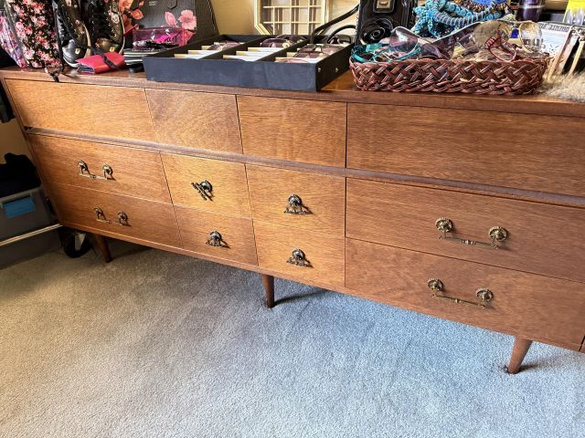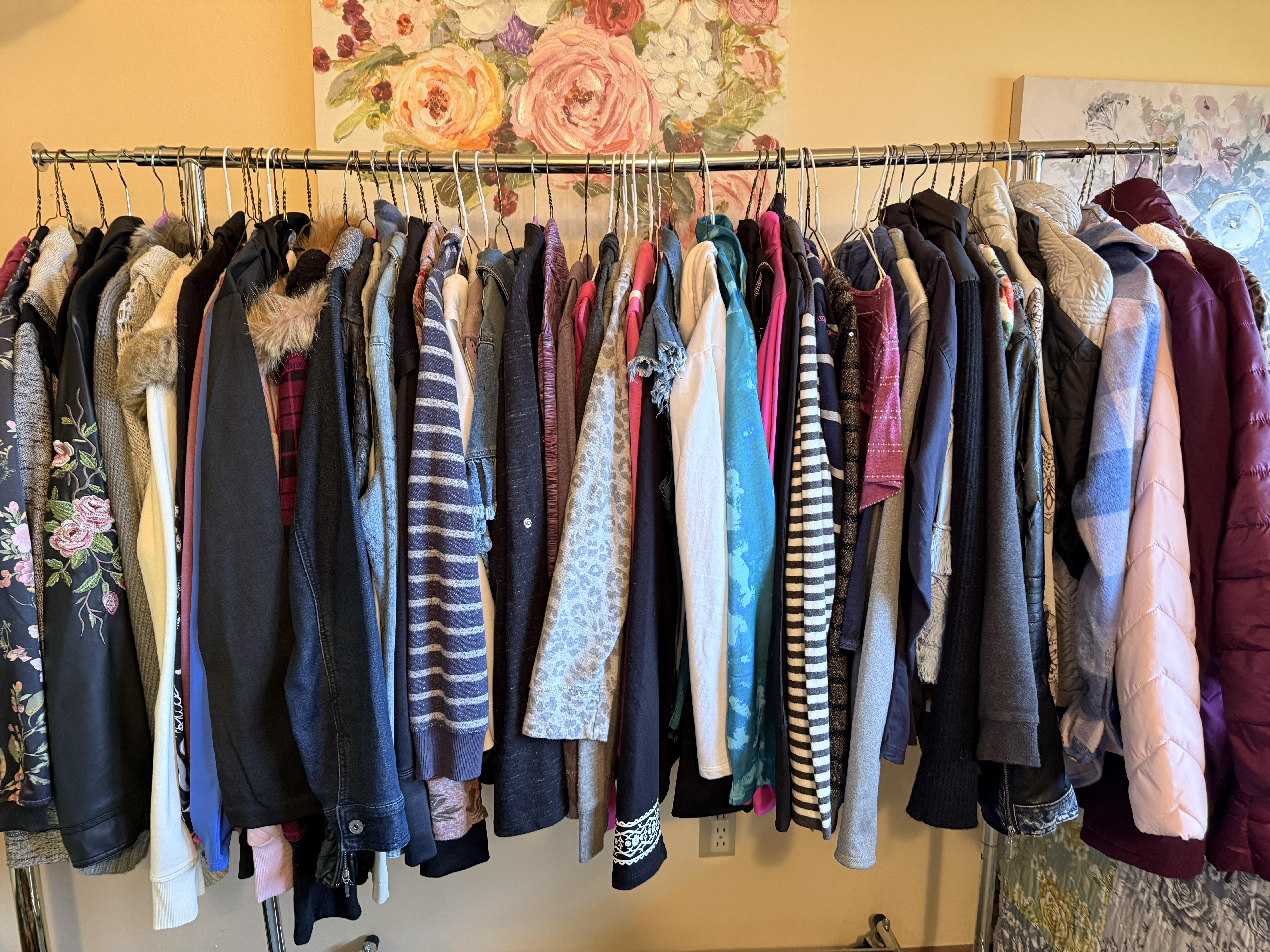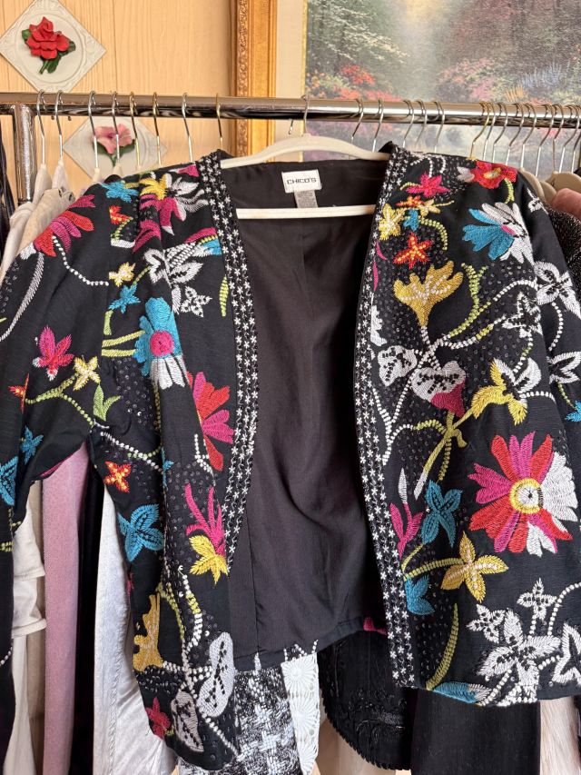 Oh the clothes! Really... they are EVERYWHERE. But the most are here. So many great pieces and the better brands! Chicos, NYDJ, Nordstrom brands, Guess... a few vintage pieces, faux fur, leopard, brights, black and ivory, embroidered florals... Handbags, scarves, MORE shoes, sunglasses! MCM low boy dresser, amazing Iris mirror, some perfumes, cute metal mini-etegere, statement metal gold headboard, blue stained glass piece... LOTS to see in here!!