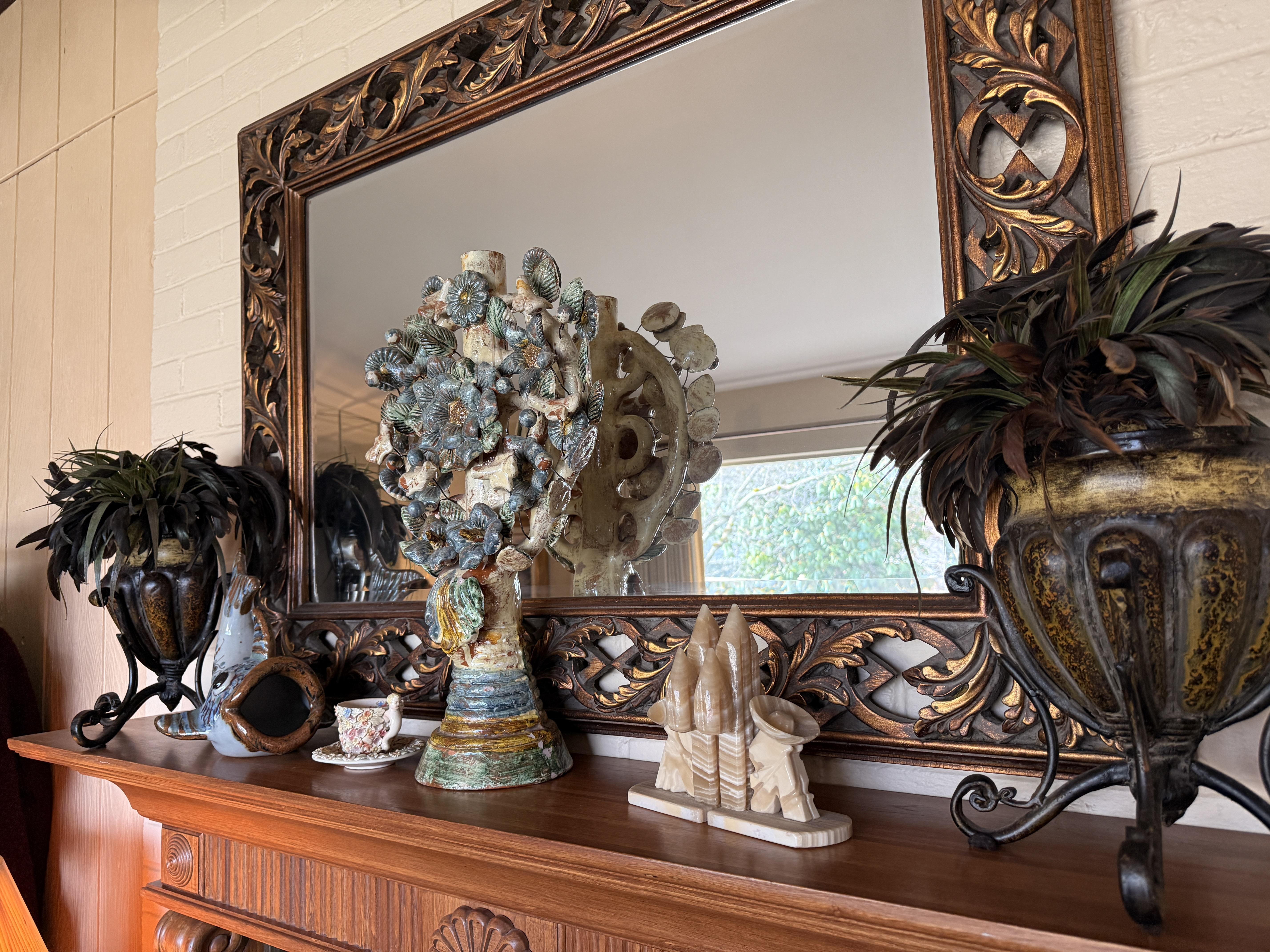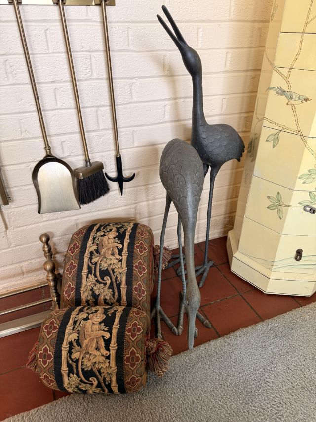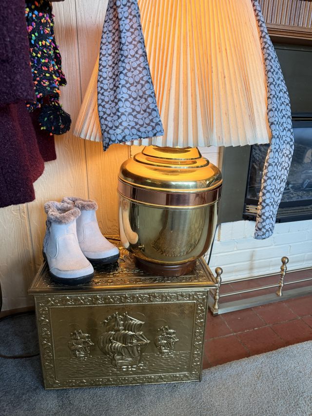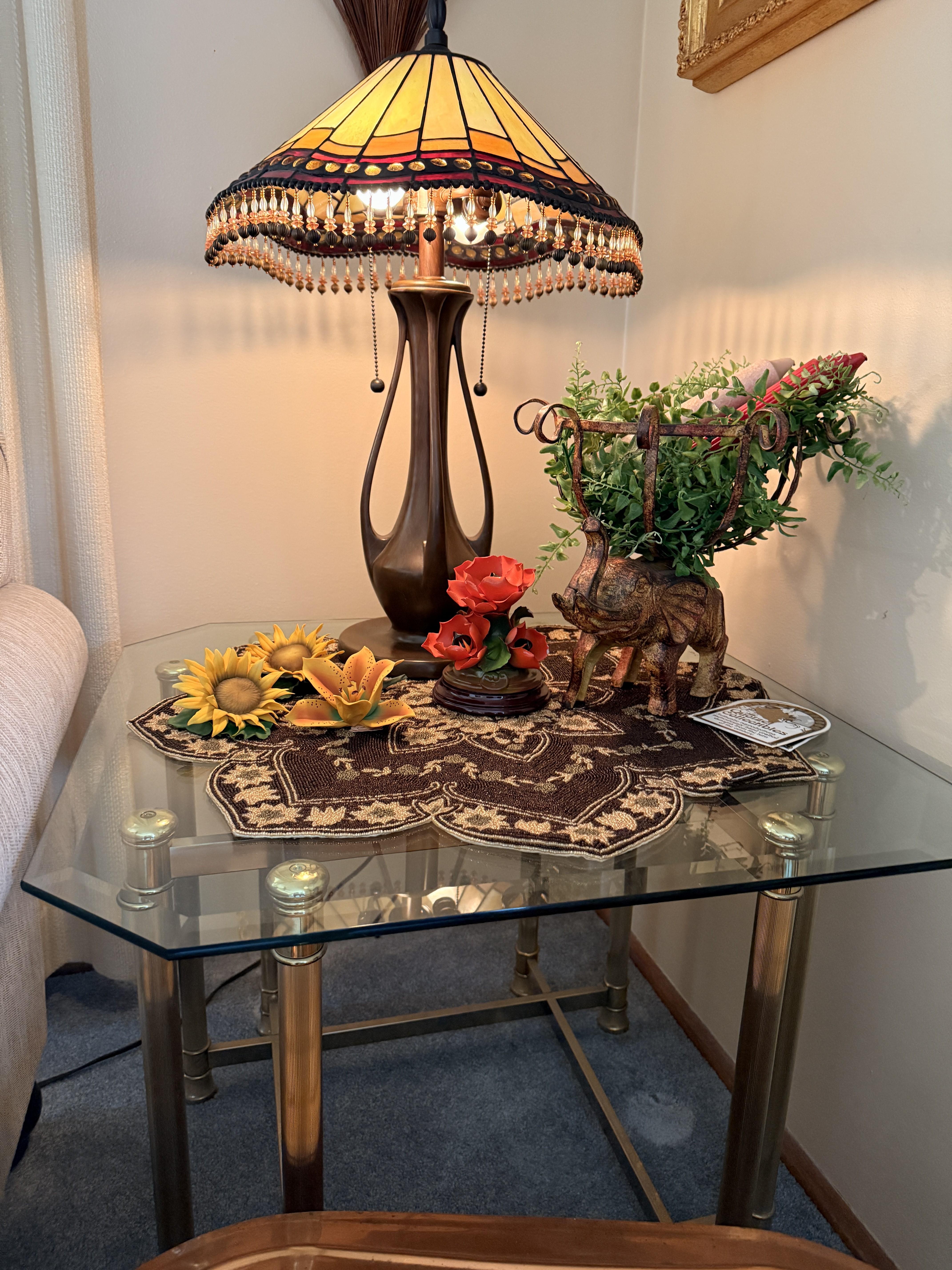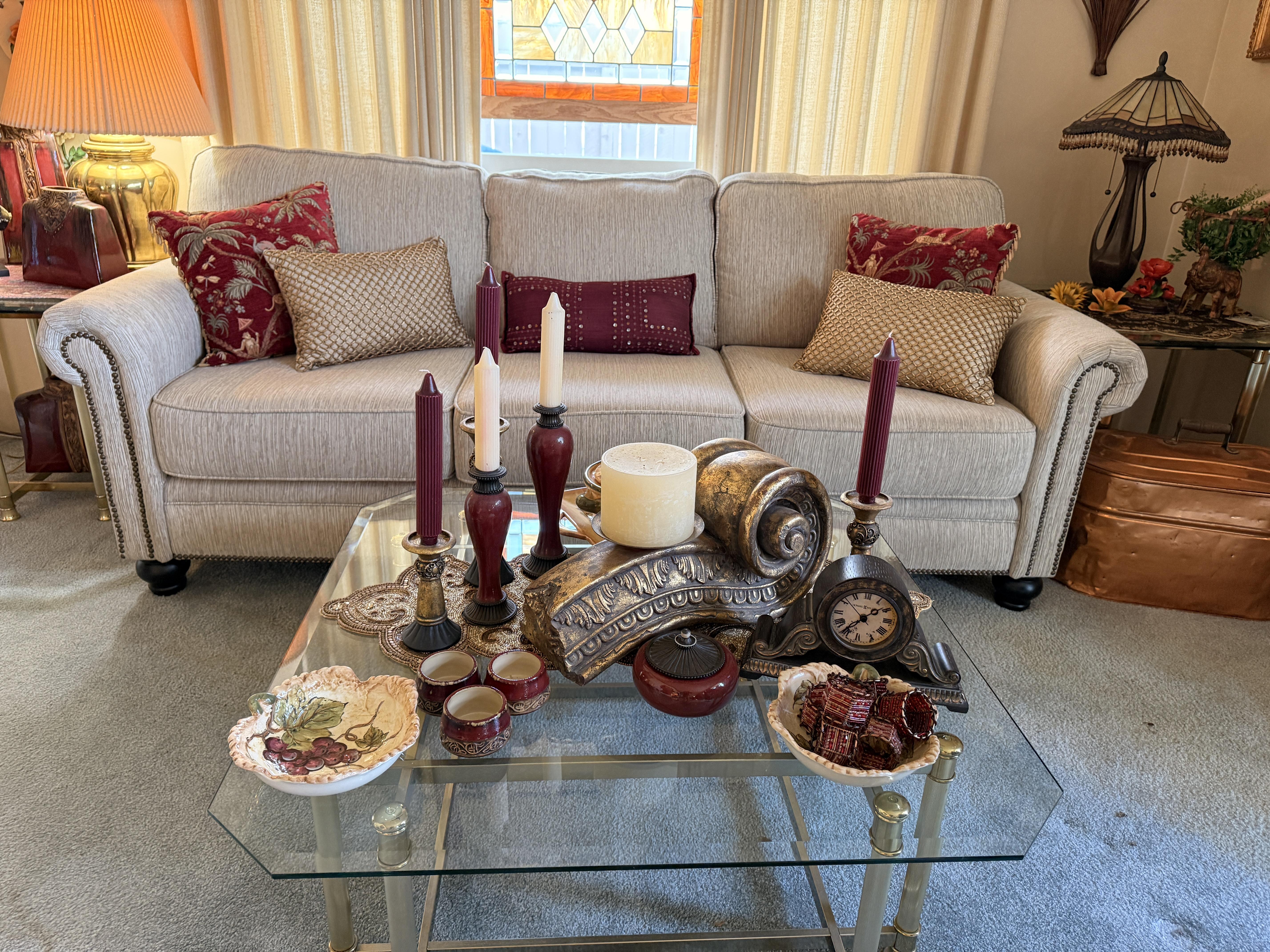 And it goes beyond the wearibles. We've got furniture and decor as well. Brass and glass sofa table, coffee and end tables, incredible brass and glass etegere, really nice and barely used neutral sofa with nail head detail. Stained glass lamps - one is Quoizel and it's a stunner. Stained glass panels, vases, trinket boxes and bowls, newer decorative pillows, copper boiler, beaded table runners, Thomas Kinkade, brass lamps, brass trunk with ship scene, Mexican pottery, the CUTEST tea cup I've ever seen (on the mantle), onyx bookends, gorgeous mirrors, a pair of metal cranes, stunning enameled jewelry dresser, vintage hall table.. and we cannot leave out the Curtis Jere Peacock brass wall sculpture! So incredible!