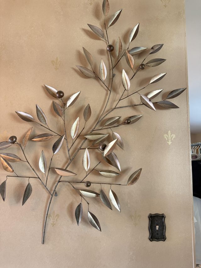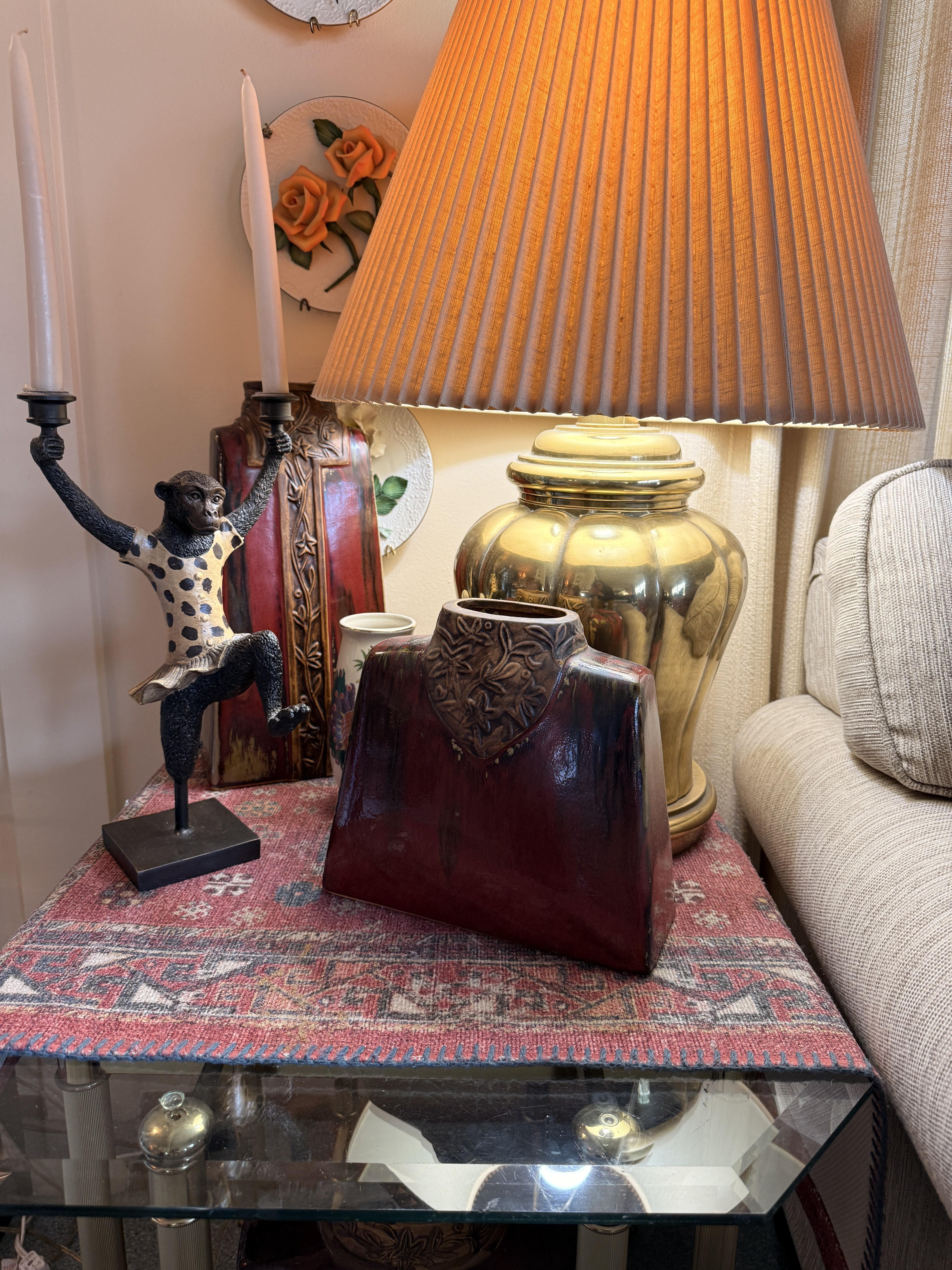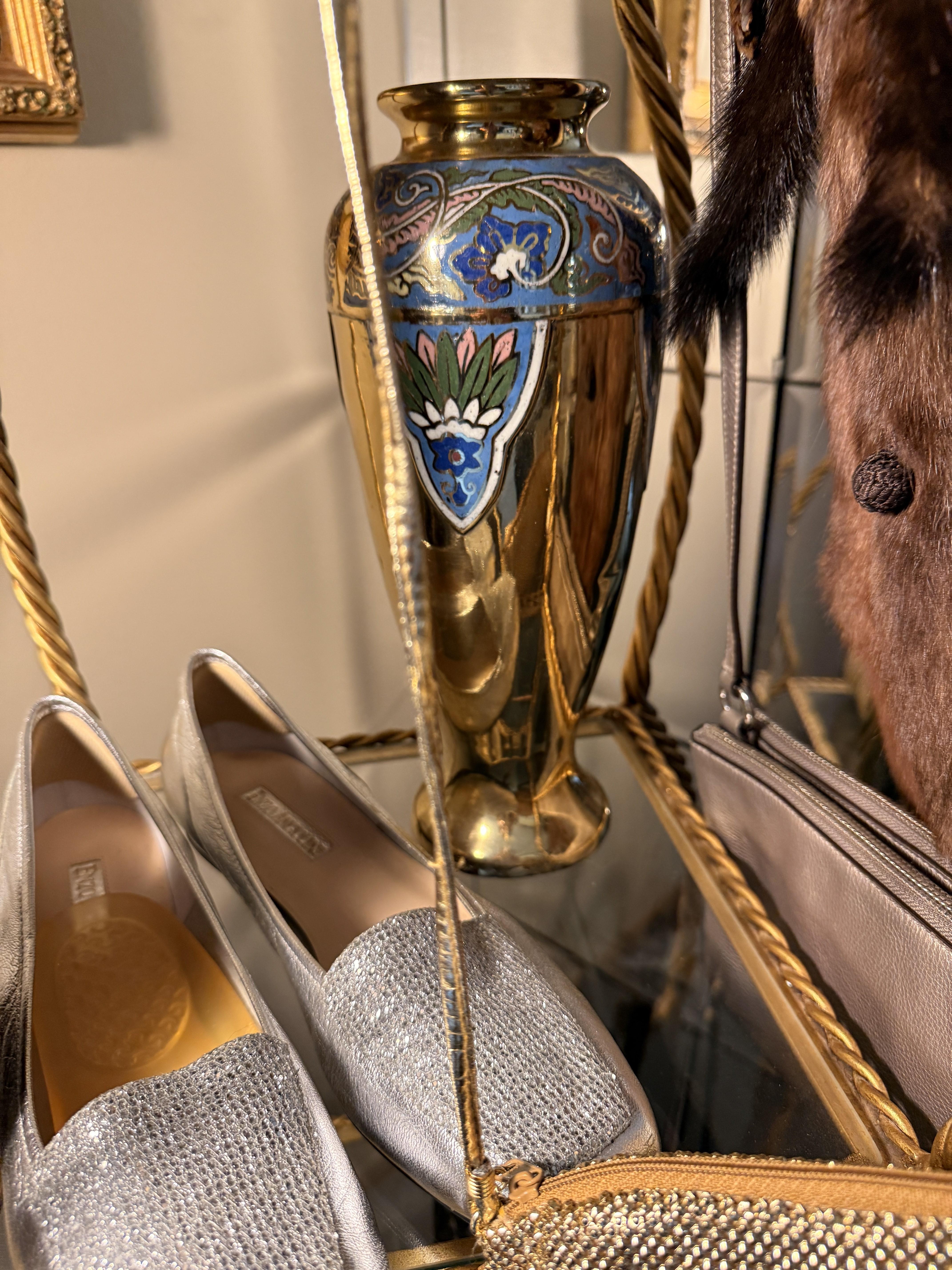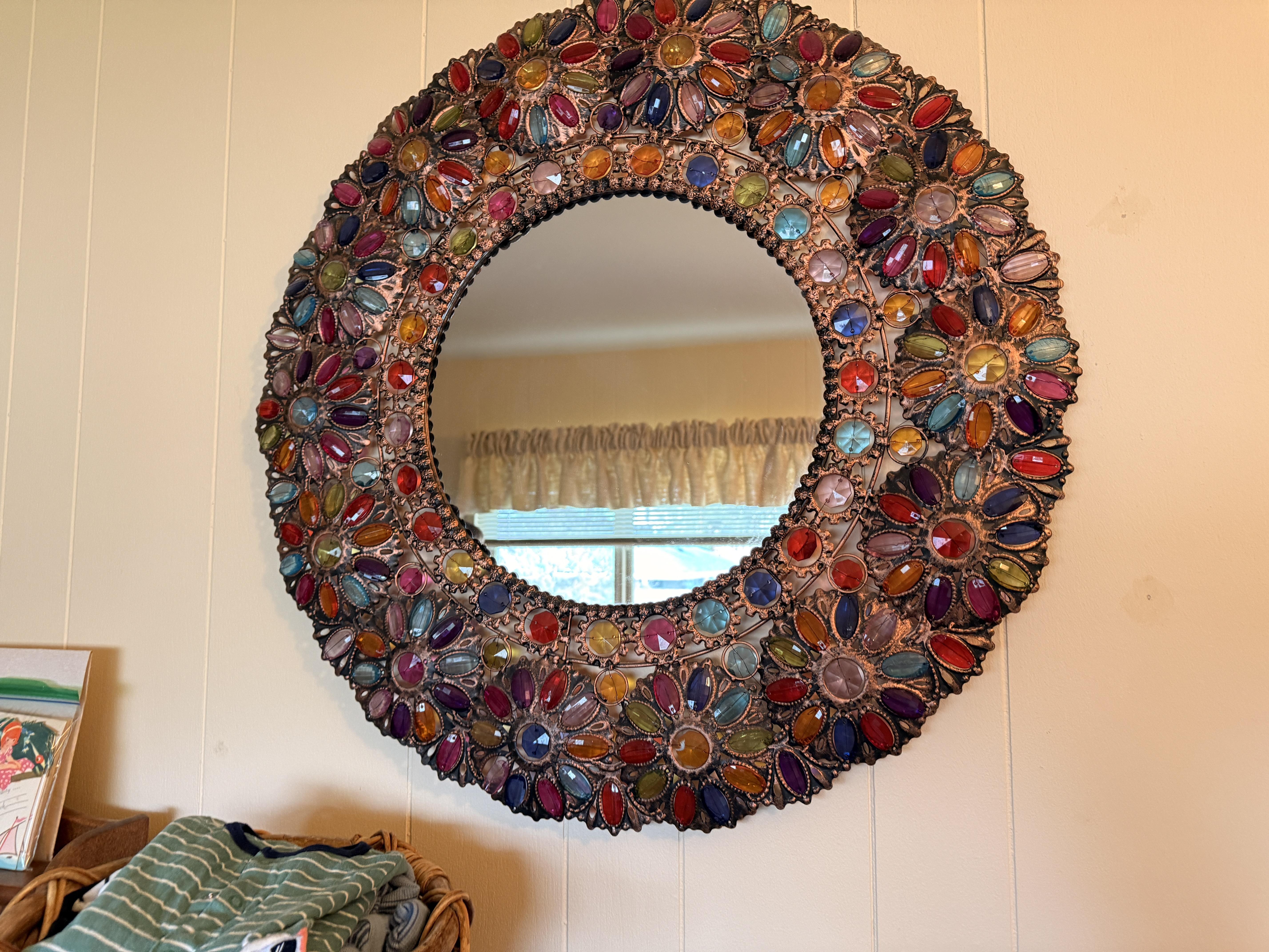 And it goes beyond the wearibles. We've got furniture and decor as well. Brass and glass sofa table, coffee and end tables, incredible brass and glass etegere, really nice and barely used neutral sofa with nail head detail. Stained glass lamps - one is Quoizel and it's a stunner. Stained glass panels, vases, trinket boxes and bowls, newer decorative pillows, copper boiler, beaded table runners, Thomas Kinkade, brass lamps, brass trunk with ship scene, Mexican pottery, the CUTEST tea cup I've ever seen (on the mantle), onyx bookends, gorgeous mirrors, a pair of metal cranes, stunning enameled jewelry dresser, vintage hall table.. and we cannot leave out the Curtis Jere Peacock brass wall sculpture! So incredible!