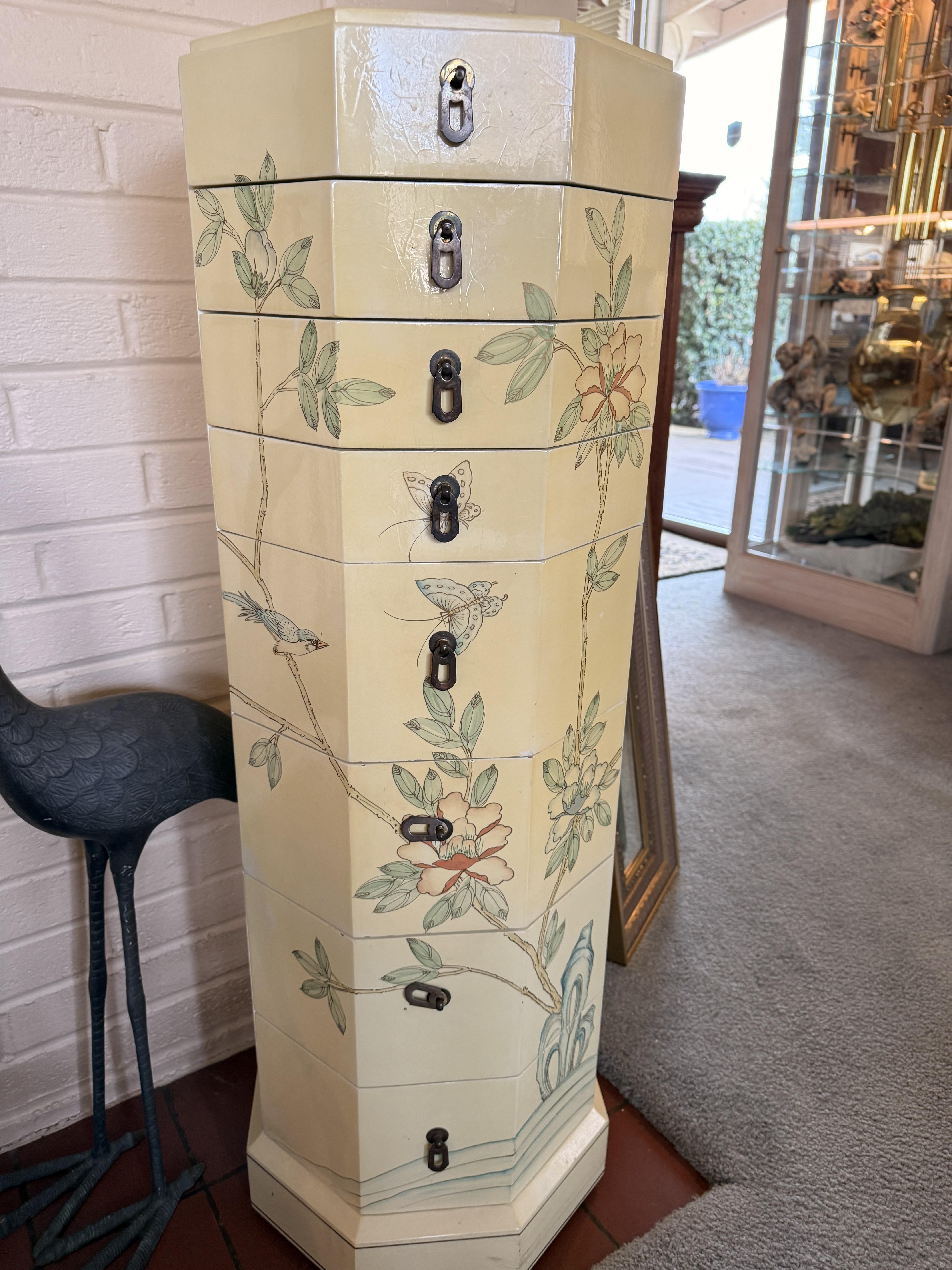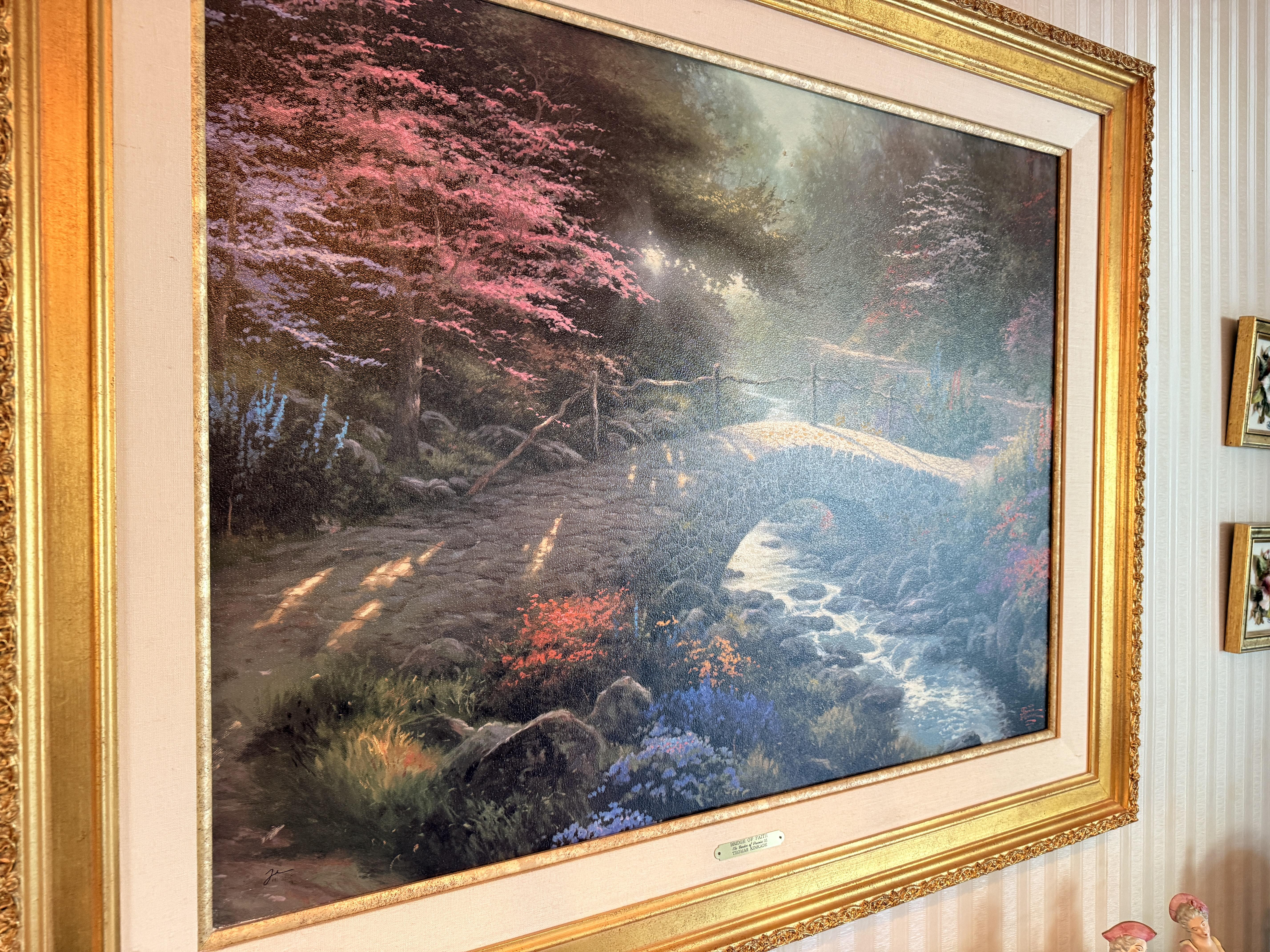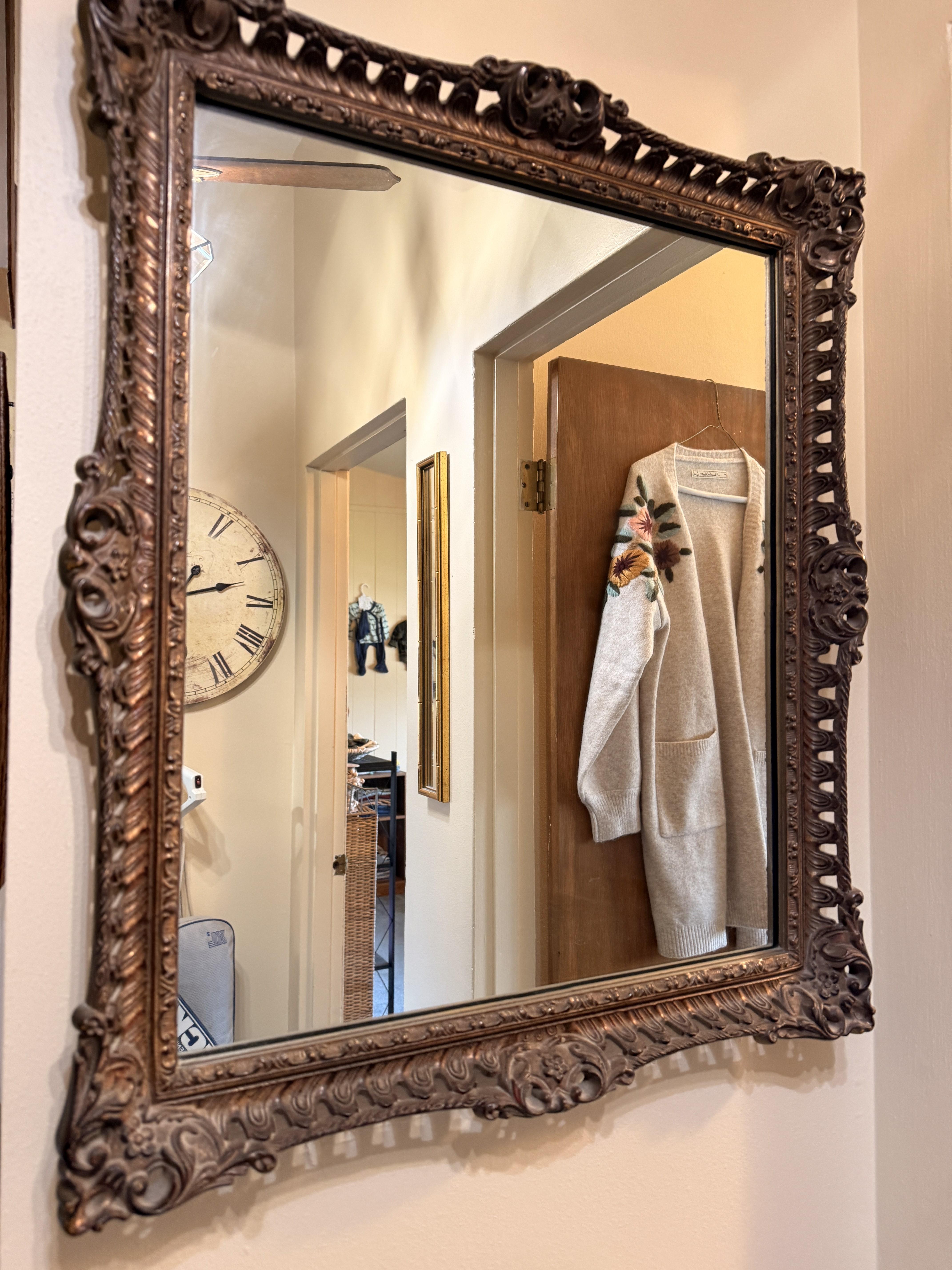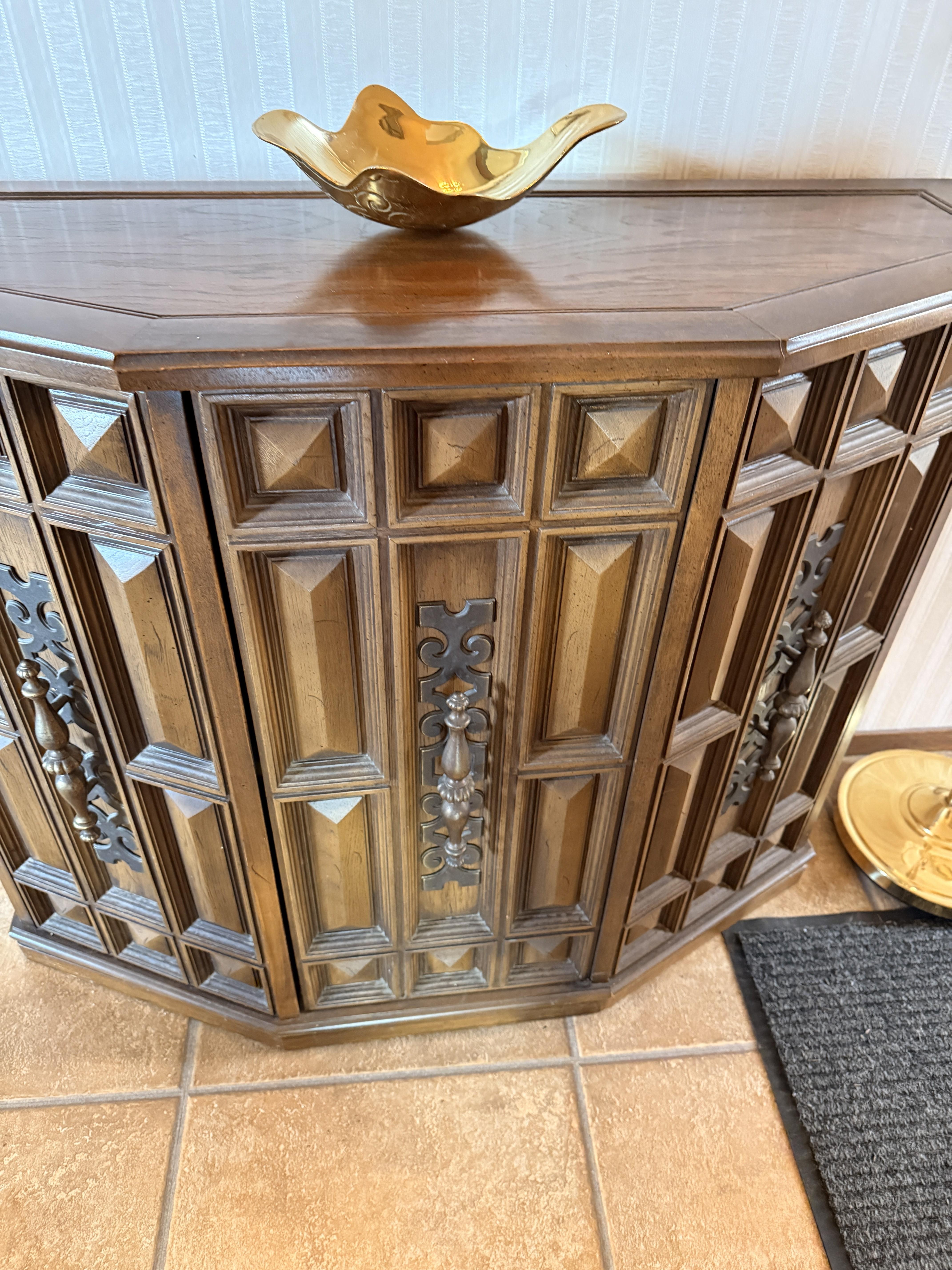 And it goes beyond the wearibles. We've got furniture and decor as well. Brass and glass sofa table, coffee and end tables, incredible brass and glass etegere, really nice and barely used neutral sofa with nail head detail. Stained glass lamps - one is Quoizel and it's a stunner. Stained glass panels, vases, trinket boxes and bowls, newer decorative pillows, copper boiler, beaded table runners, Thomas Kinkade, brass lamps, brass trunk with ship scene, Mexican pottery, the CUTEST tea cup I've ever seen (on the mantle), onyx bookends, gorgeous mirrors, a pair of metal cranes, stunning enameled jewelry dresser, vintage hall table.. and we cannot leave out the Curtis Jere Peacock brass wall sculpture! So incredible!